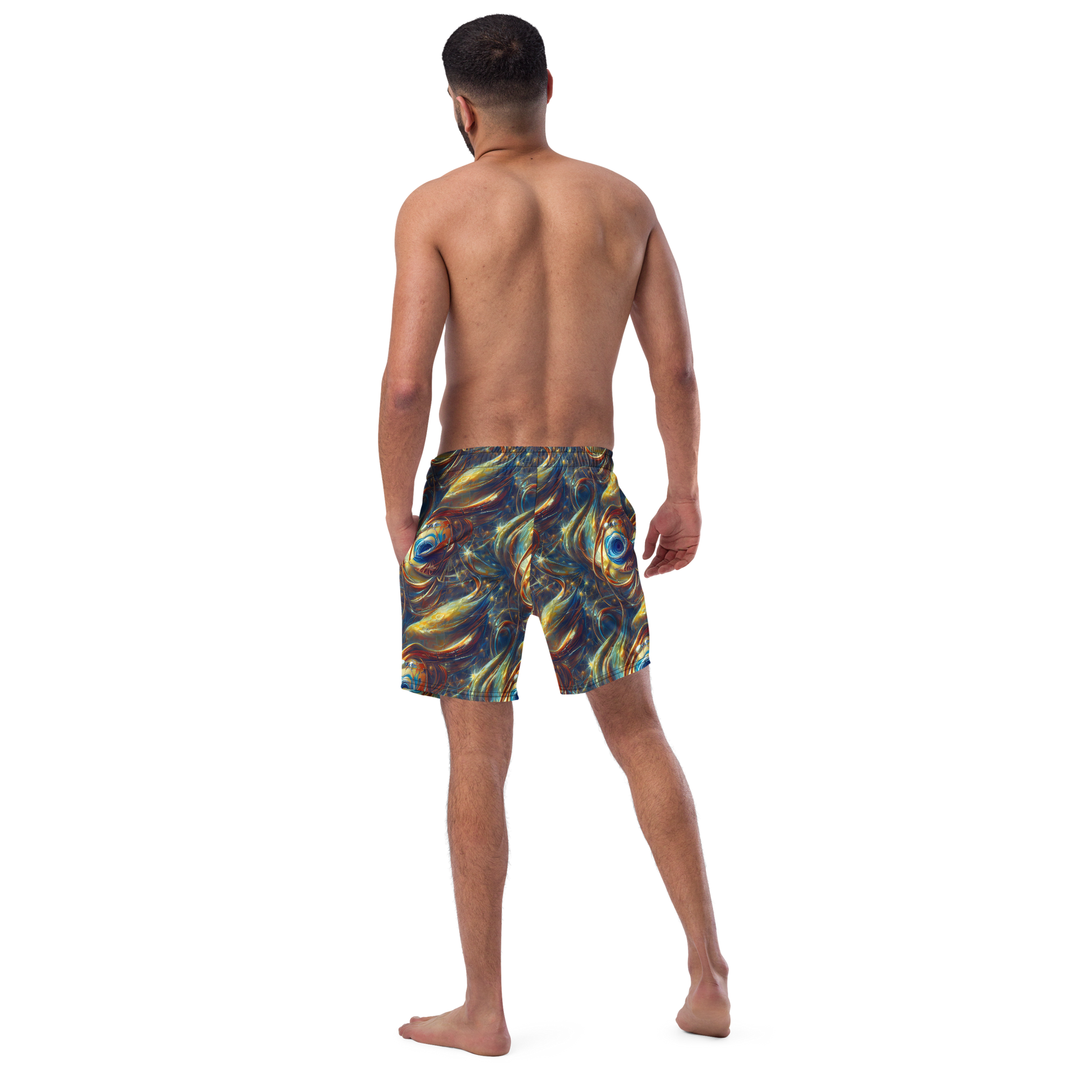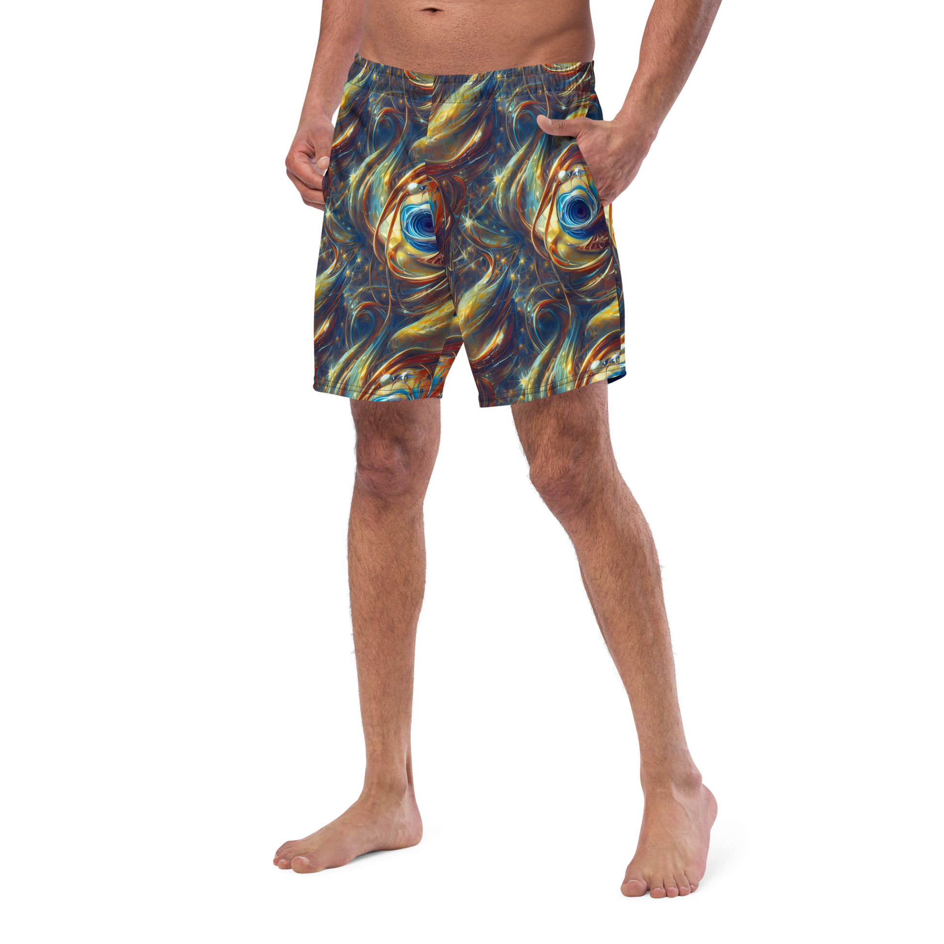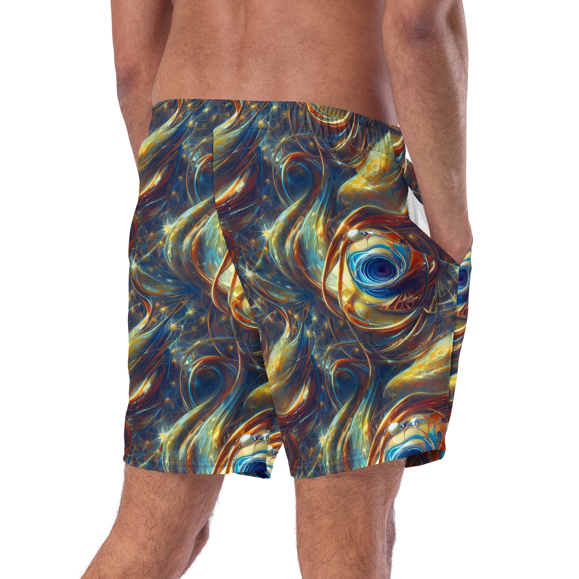 Unleash your inner explorer with our AI-designed swim trunks, featuring a mesmerizing pattern that swirls with deep cosmic blues, fiery oranges, and shimmering golds. Perfect for avant-garde events, music festivals, or art exhibitions, these trunks evoke a sense of wonder and mysticism, making you the standout star at any beach or poolside gathering. Crafted for both comfort and style, they're your ultimate summer essential!