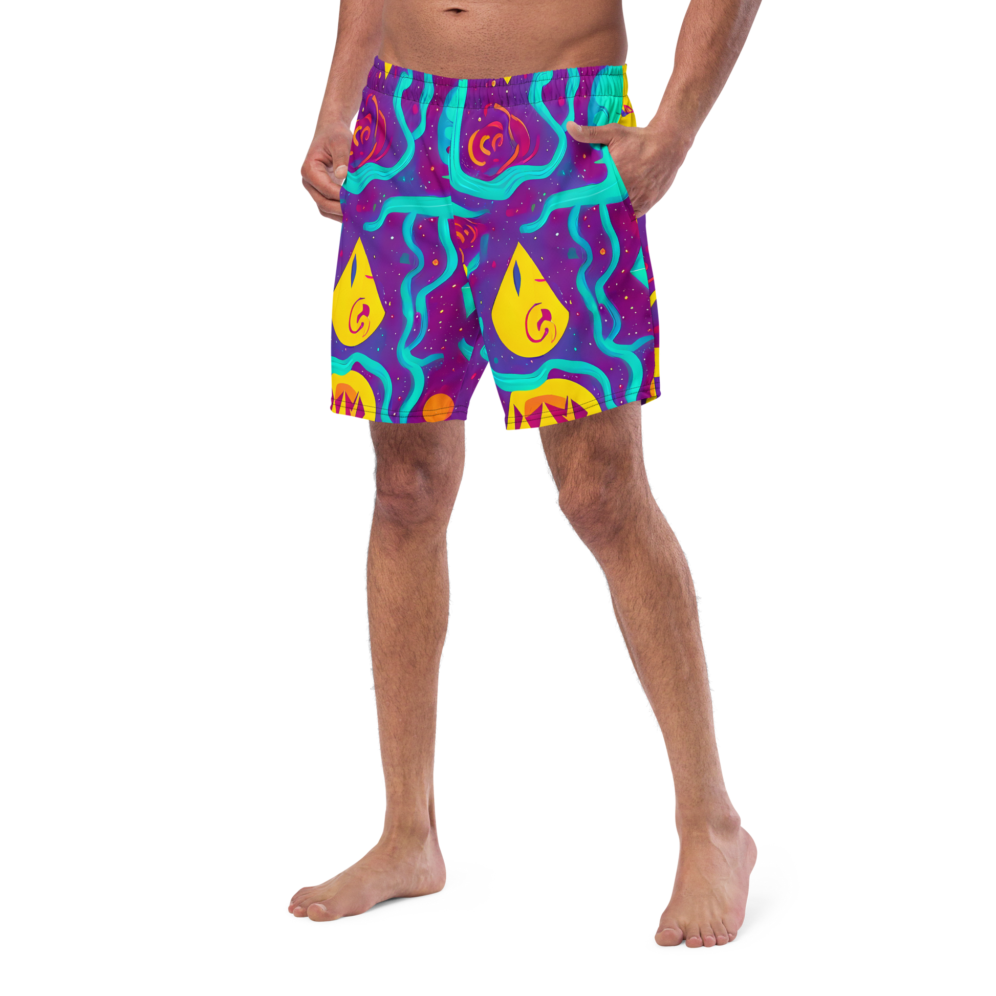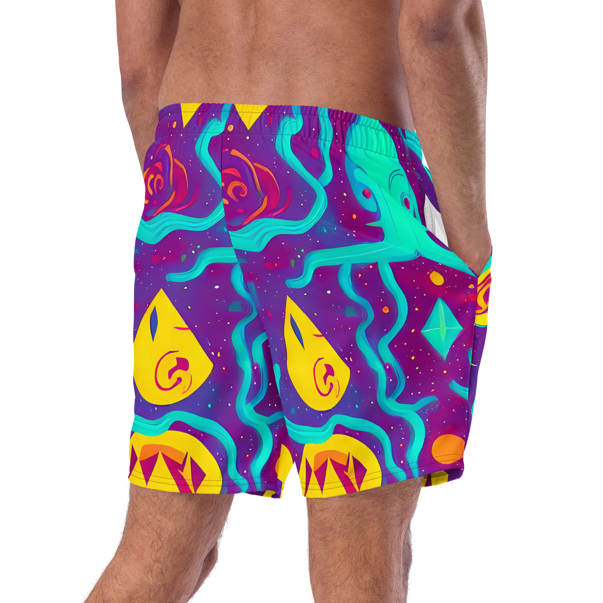 Embark on a celestial journey with our latest swim trunks, enveloped in the dynamic "Cosmic Current" design. A fusion of electric blues, vivid purples, and neon yellows swirl in an otherworldly dance, capturing the boundless energy of the cosmos. Abstract shapes and fluid lines convey movement, while star-like speckles add a cosmic texture. These trunks are a statement piece for the imaginative and bold, ideal for standing out at music festivals, creative gatherings, or any spring and summer escapade.