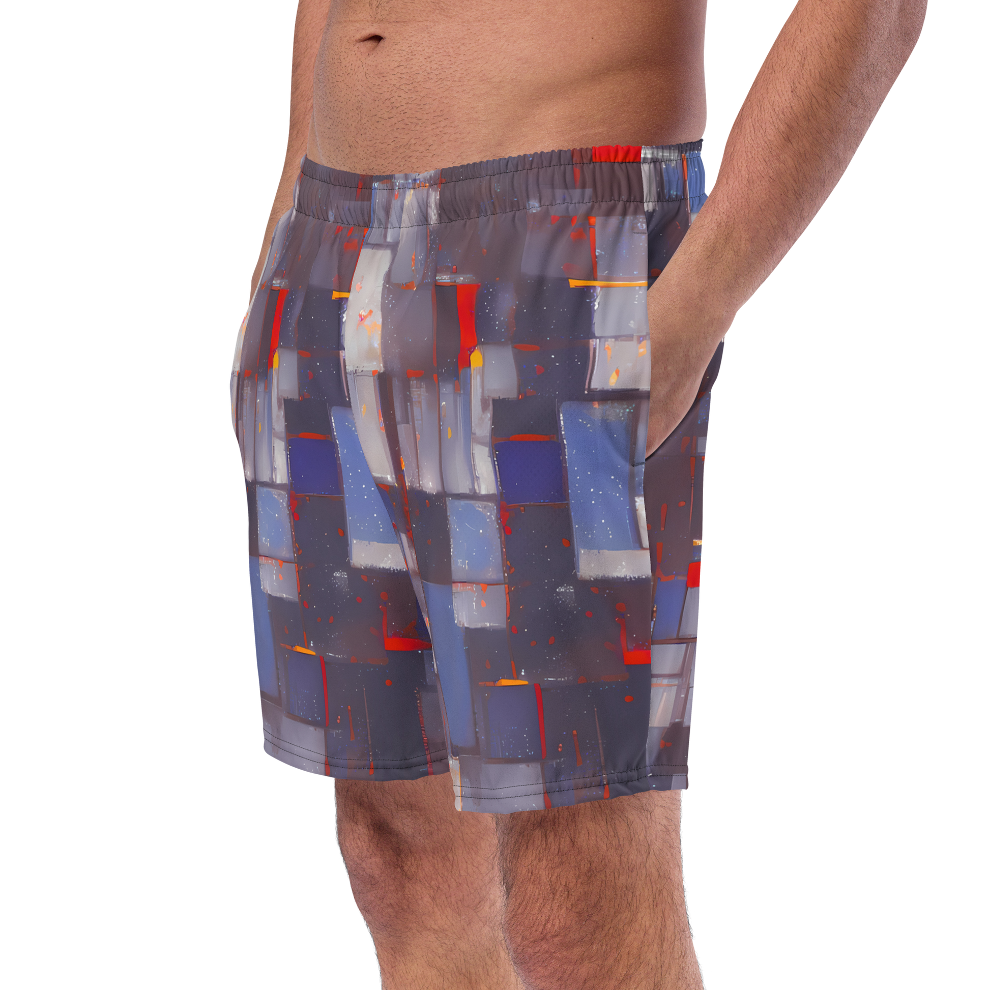 Embrace the avant-garde allure of our exclusive swim trunks, where the essence of modern art meets aquatic elegance. Adorned with a captivating "Cubist Rhythm" design, these trunks feature a tapestry of deep blues and grays with bold red accents, forming a mesmerizing pattern of overlapping squares and rectangles. The striking geometric composition and expressive brushwork combine to create a wearable piece of art that is sure to turn heads and spark conversations at any stylish beach or poolside gathering.