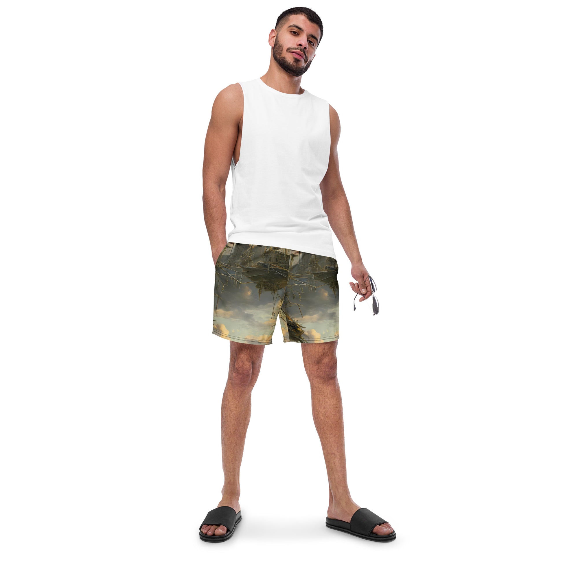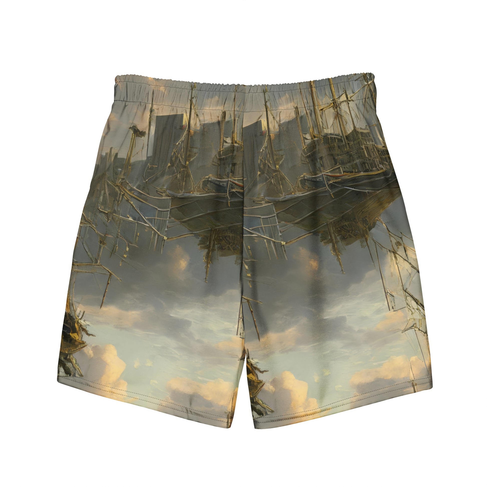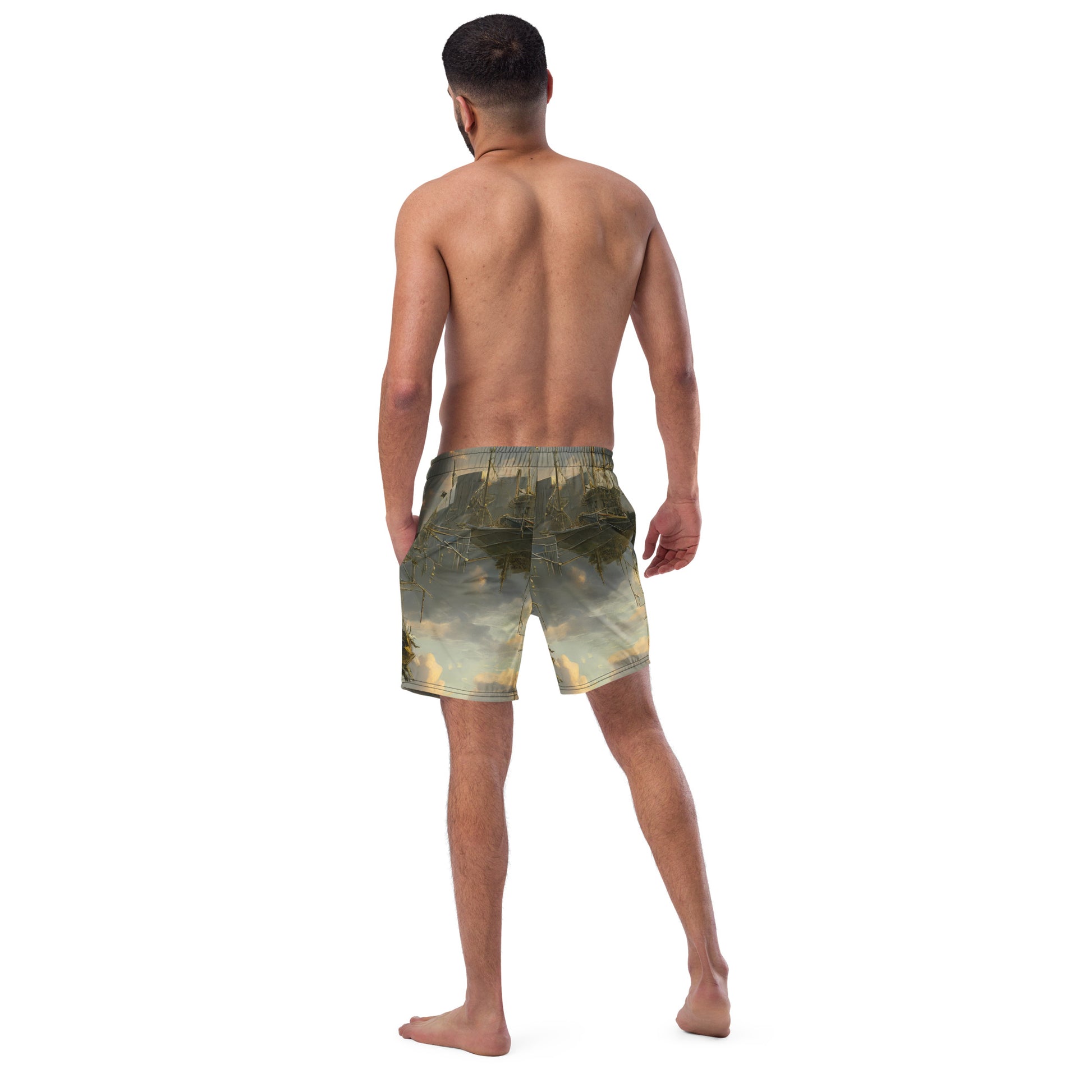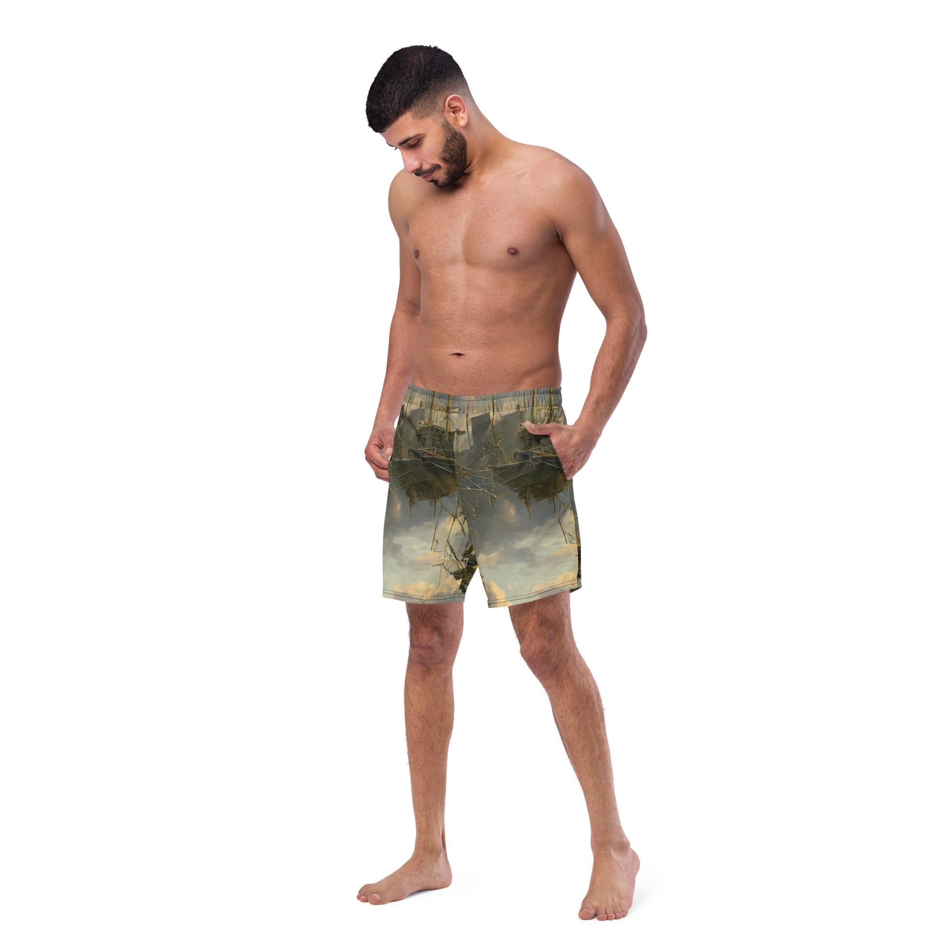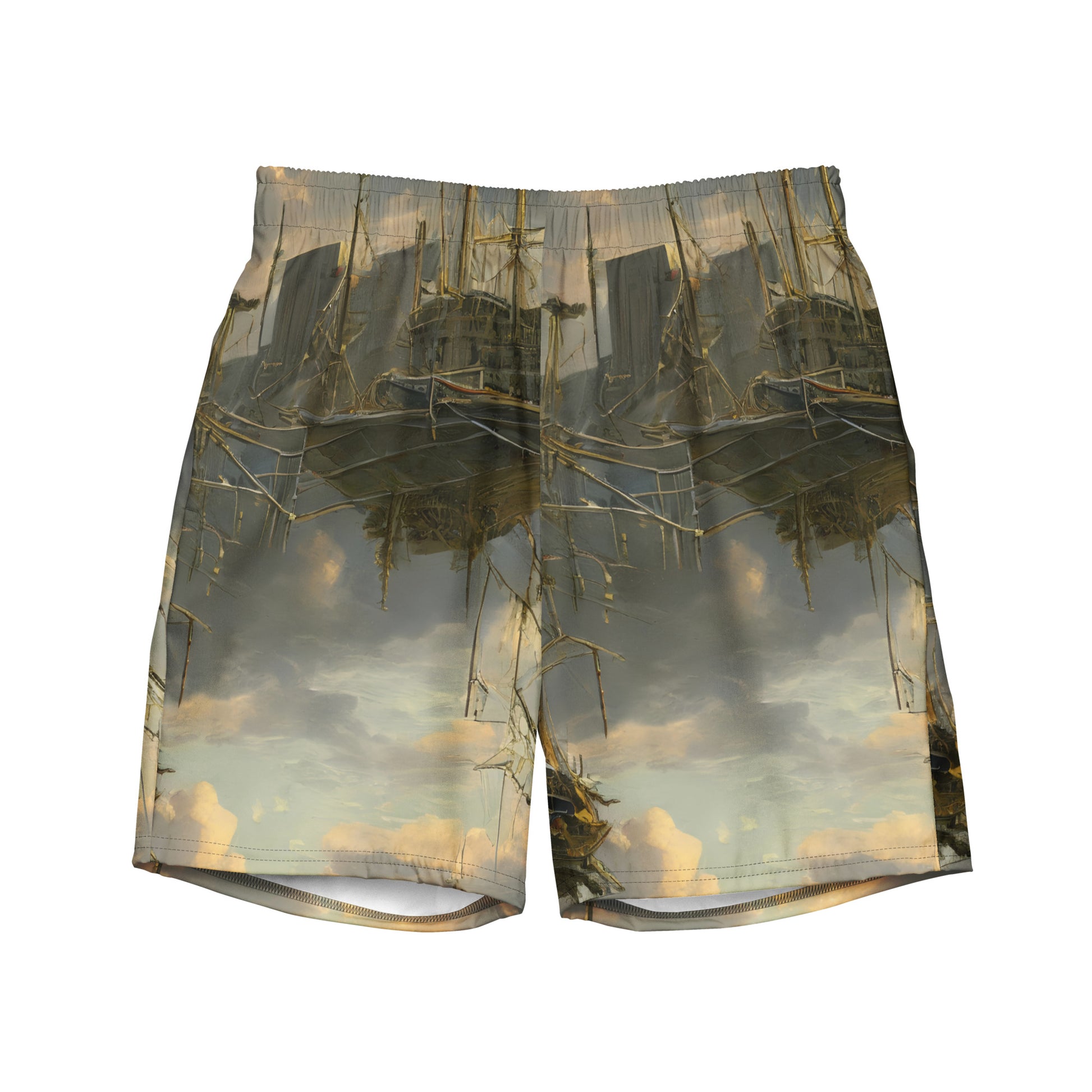 Embark on a stylish adventure with our "Ethereal Armada" swim trunks, where steampunk meets digital fantasy! Featuring an eye-catching design of intricate ship silhouettes floating amidst swirling clouds in muted tones of gray, gold, and blue, these trunks are perfect for those who dare to stand out. Ideal for beachside escapades or avant-garde art events, they offer both comfort and flair, ensuring you make waves wherever you go!