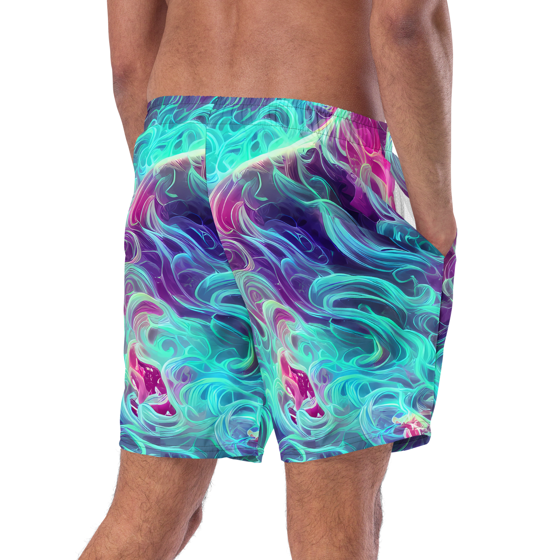 Embark on a sartorial journey to the stars with our latest swim trunks, enveloped in a mesmerizing pattern that captures the essence of a cosmic garden. Swirls of pink, blue, and purple bloom across the fabric, creating a visual symphony that mirrors the intrigue of the universe and the delicacy of flowers. Perfect for those who wish to express their unique flair, these trunks are a must-have for any festive or artistic occasion, making you the embodiment of celestial elegance at any waterside gathering.