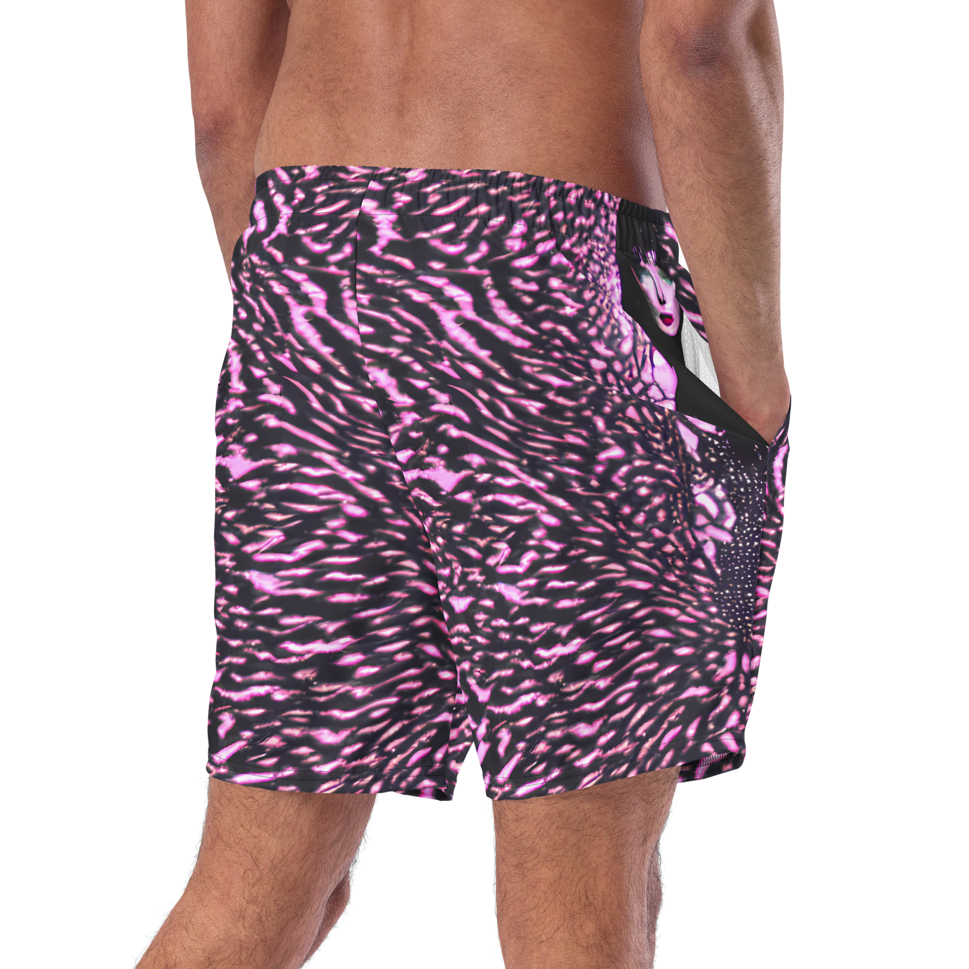 Embrace the enigma of summer with our latest swim trunks, draped in the captivating "Meryl's Mystery" design. These trunks are a canvas of deep purples and magentas, with abstract stripes that dance across the fabric, creating a sense of movement that mirrors the ocean's waves. At the core of the design, a solitary figure shrouded in a constellation of dots invites introspection, while the overall aesthetic channels the provocative and ethereal artistry of two legendary artists. Perfect for those who command attention and appreciate a garment that speaks to their unique spirit.