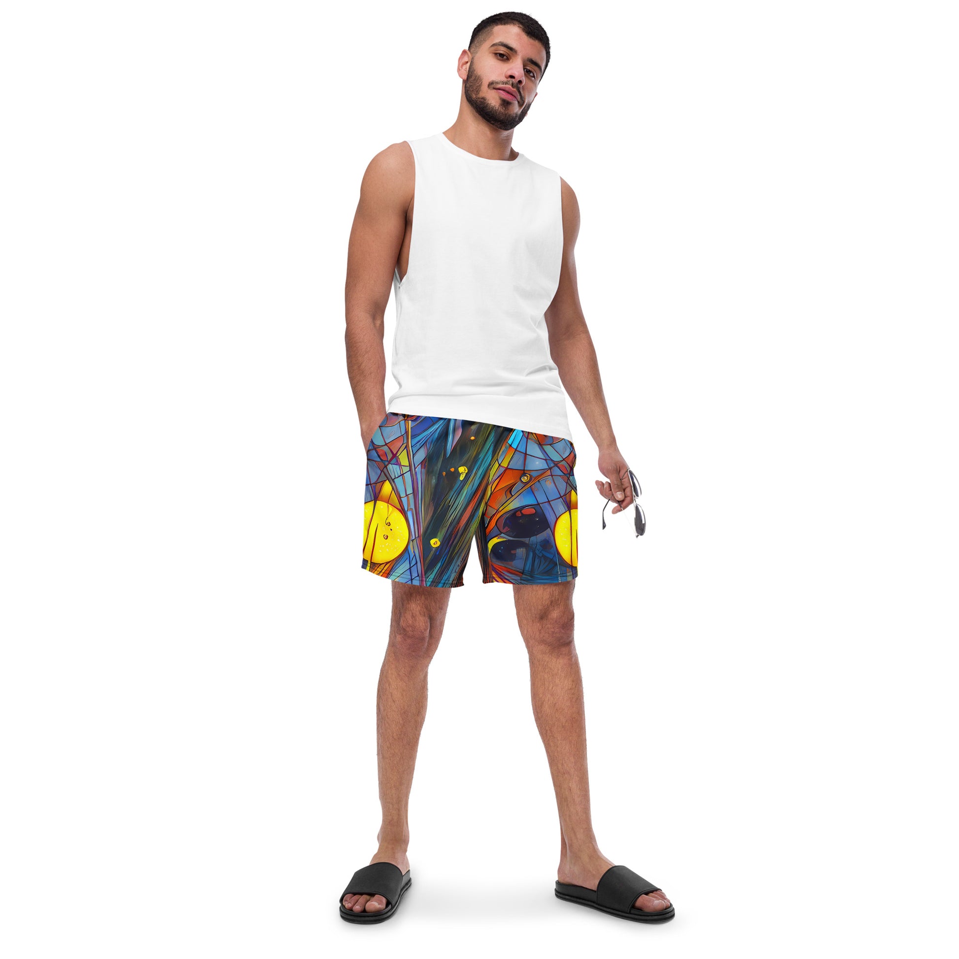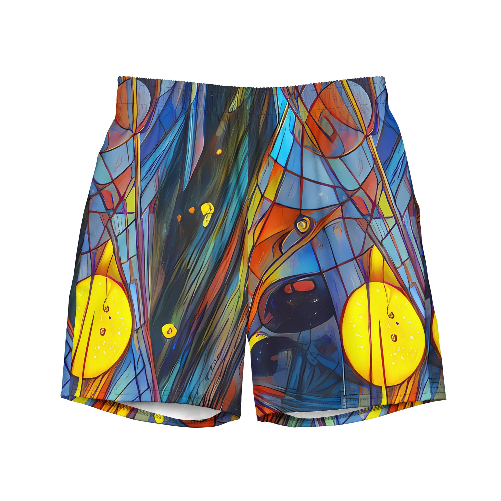 Unleash your vibrant spirit this summer with our "Spectral Strands" swim trunks, a stunning fusion of electric blues, fiery oranges, and radiant yellows that evoke a sense of dynamic movement and artistic flair. Designed for the bold and creative, these trunks make a striking statement whether you're lounging by the pool or diving into the waves. Crafted for comfort and style, they ensure you stay cool and confident all day long!
