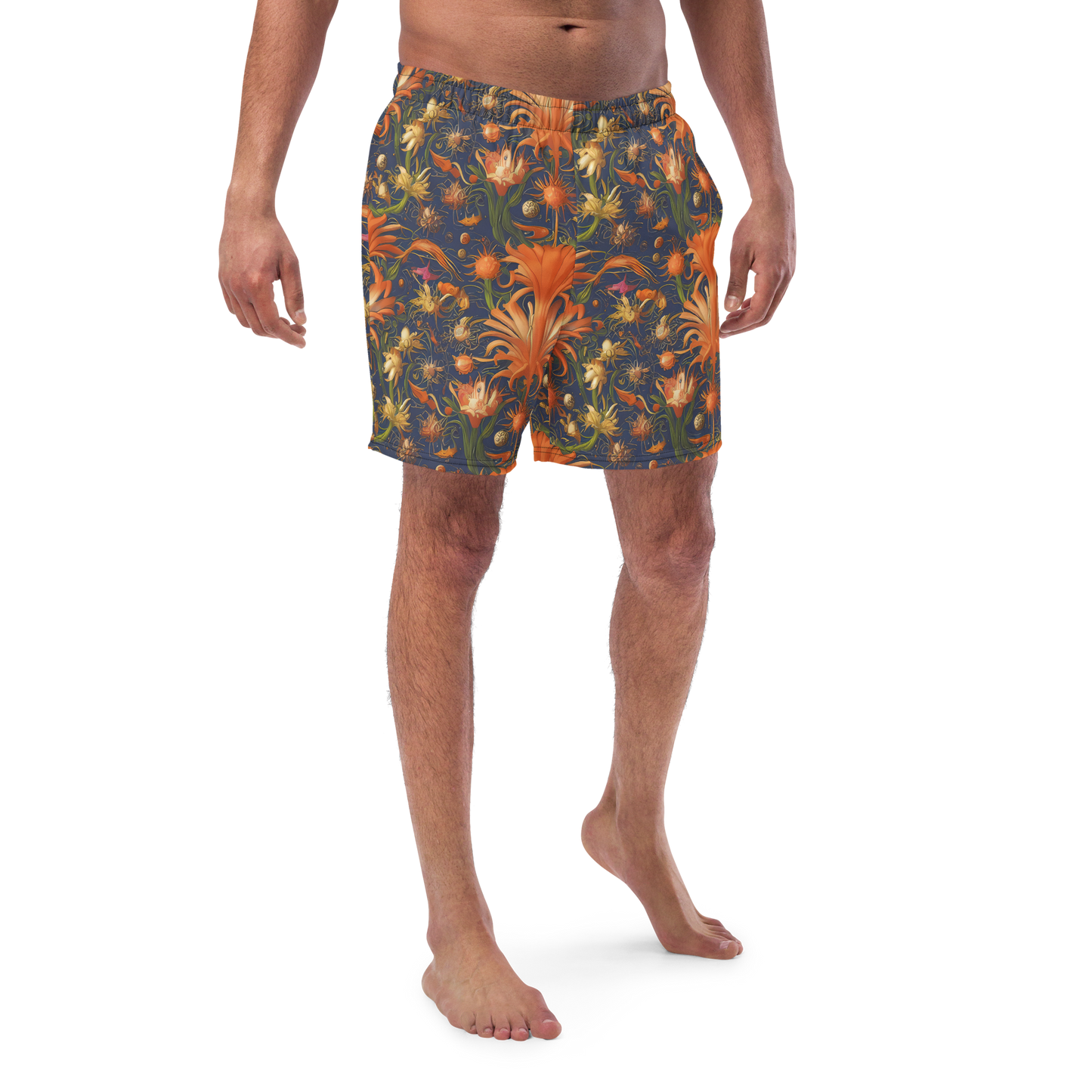 Immerse yourself in the allure of the night sky as you slip into our latest swim trunks, adorned with the enchanting 'Stellar Blooms' pattern. Vibrant orange, yellow, and cream blossoms burst forth amongst verdant greenery, set against the celestial deep blue of a starry night. This exquisite design echoes the masterful botanical artistry of the past while capturing the mysterious charm of the cosmos. Perfect for those with an artistic flair and a penchant for the wonders of the universe, these trunks will make you the embodiment of style whether you're lounging by the pool or strolling along the shore.