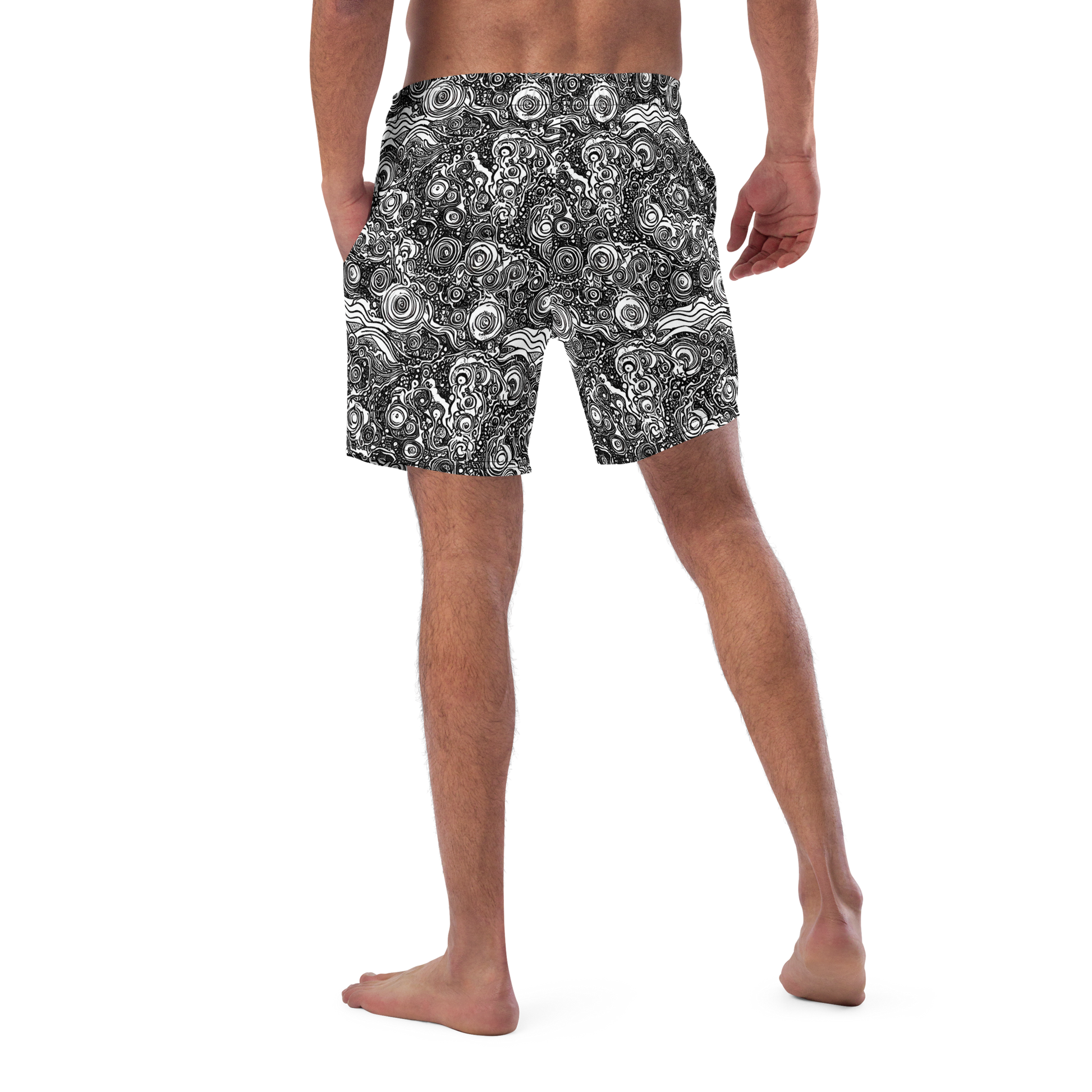 Unleash your adventurous spirit this summer with our "Swirling Stories" swim trunks, where the mystique of a cosmic dance meets cutting-edge style! This entrancing monochrome pattern, with its intricate spirals and fluid lines, creates a hypnotic sense of motion that’s perfect for making a statement at the beach, pool, or chic urban event. Crafted for the introspective yet bold individual, these trunks ensure you not only look great but feel great too, inviting curiosity and conversation wherever you go.