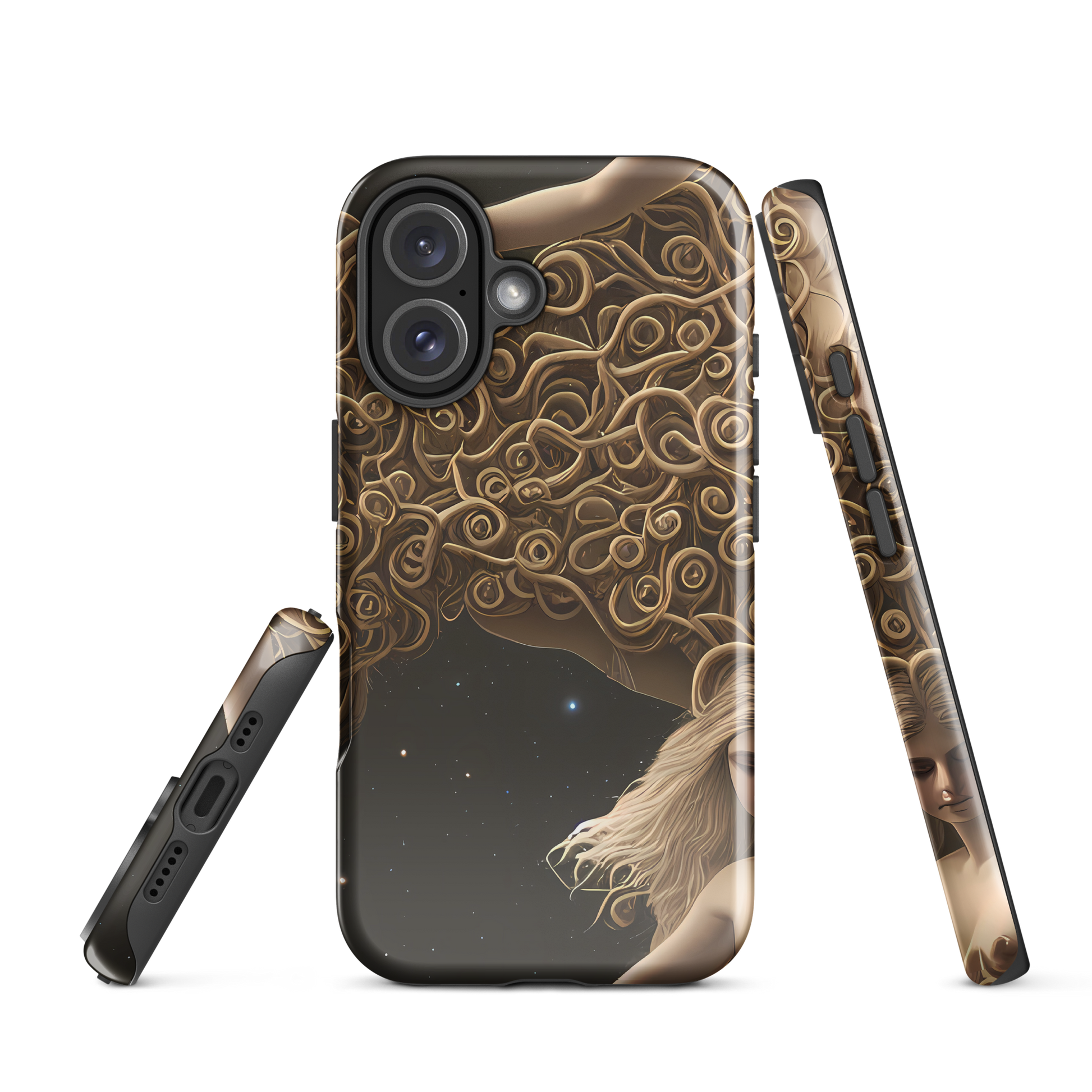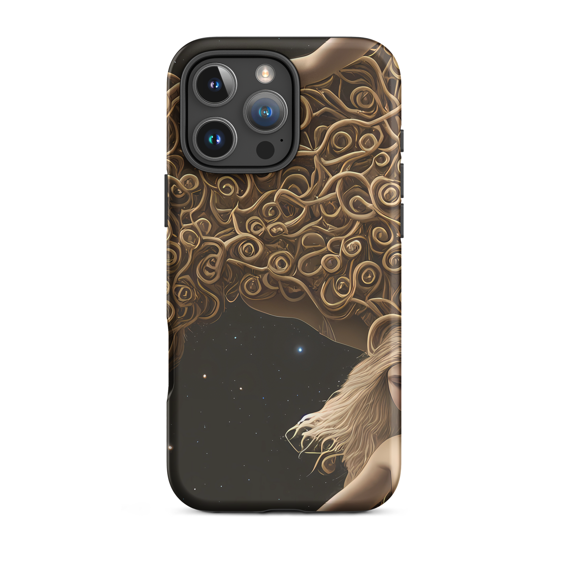 Unveil a realm of elegance and protection with our Tough Case for iPhone®, featuring the captivating "Ether Whorls" design. This case transforms your phone into a masterpiece of intertwining golden spirals set against a deep, celestial backdrop, exuding mystical allure and sophistication. Perfect for those who cherish the ethereal and timeless, this case is your ideal companion for upscale events or everyday elegance. Crafted with a durable polycarbonate outer shell and a shock-absorbing TPU inner lining, it ensures your device remains safe and stylish. Elevate your phone's aesthetic with a design that's as unique as you are, and make a statement wherever you go!