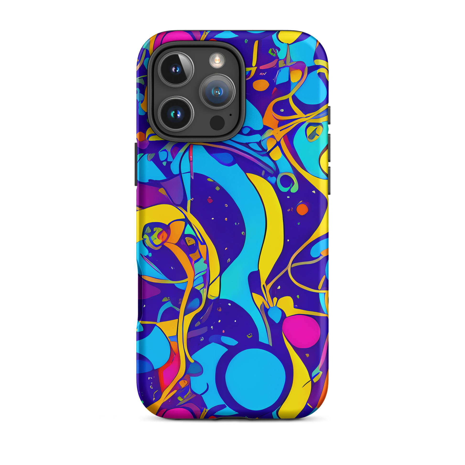 Unleash your creative spirit with the "Spectral Tangle" Tough Case for iPhone®, a bold fusion of art and protection. This case features an electrifying pattern of intertwining shapes and colors, with vibrant electric blues, purples, and bursts of neon yellow and orange, capturing the edgy essence of modern graffiti art. Perfect for making a statement at music festivals or creative gatherings, this case not only protects your phone but also complements your expressive style. Crafted with a durable, dual-layer design, it combines an impact-resistant polycarbonate outer shell with a shock-absorbing TPU inner lining to keep your phone safe and stylish all year round.
