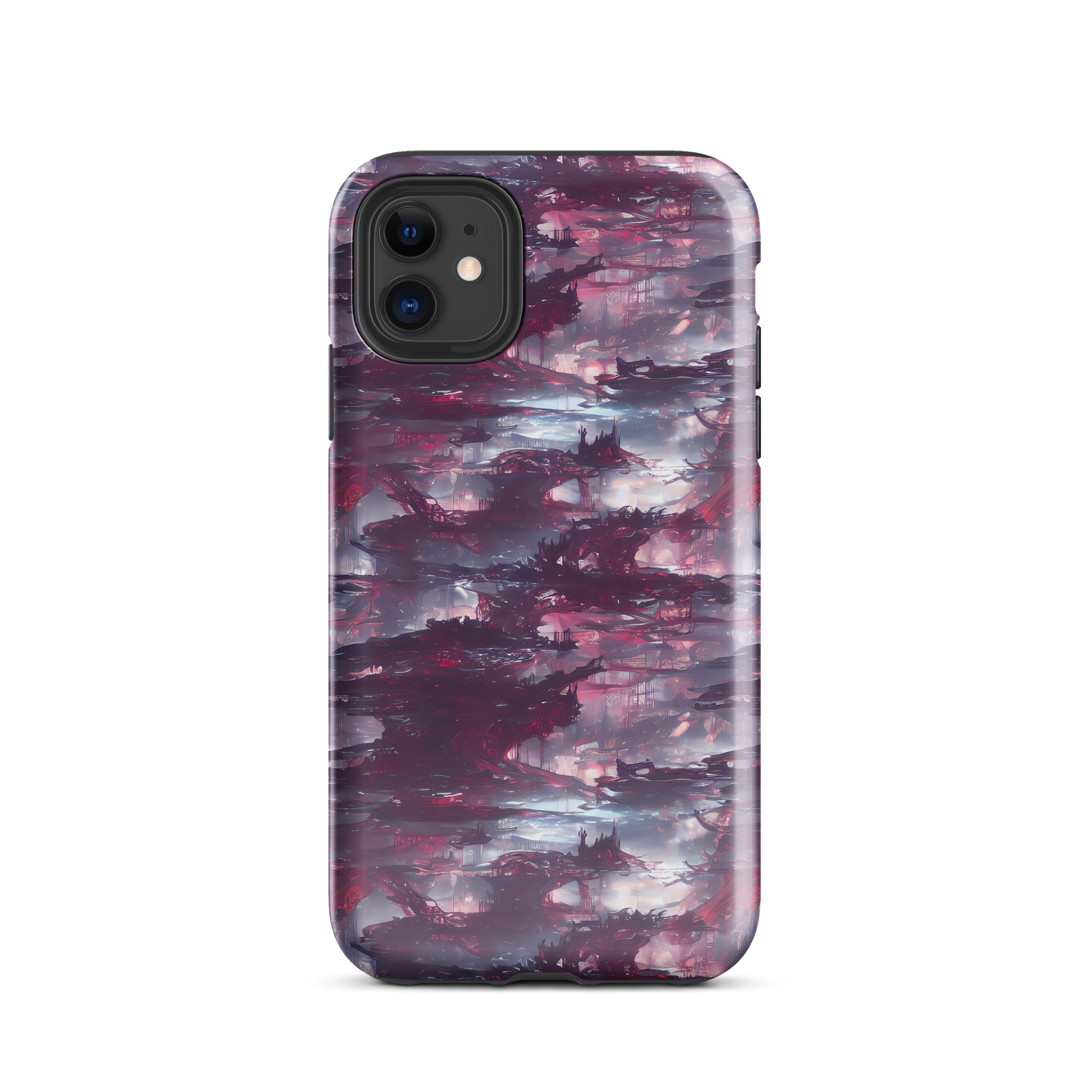 Elevate your phone's style with our "Twilight Fortresses" Tough Case for iPhone®. This captivating case features a stunning pattern of deep purples and rich magentas, seamlessly woven with ethereal silvers and soft pinks, reminiscent of a fantastical skyline at dusk. With its intricate, almost architectural design, this case is perfect for those who dare to embrace elegance and the avant-garde. Crafted with a durable dual-layer construction, the case combines an impact-resistant polycarbonate outer shell with a TPU inner lining for optimal protection. Make a bold statement and keep your device safe and fashionable, no matter the season!