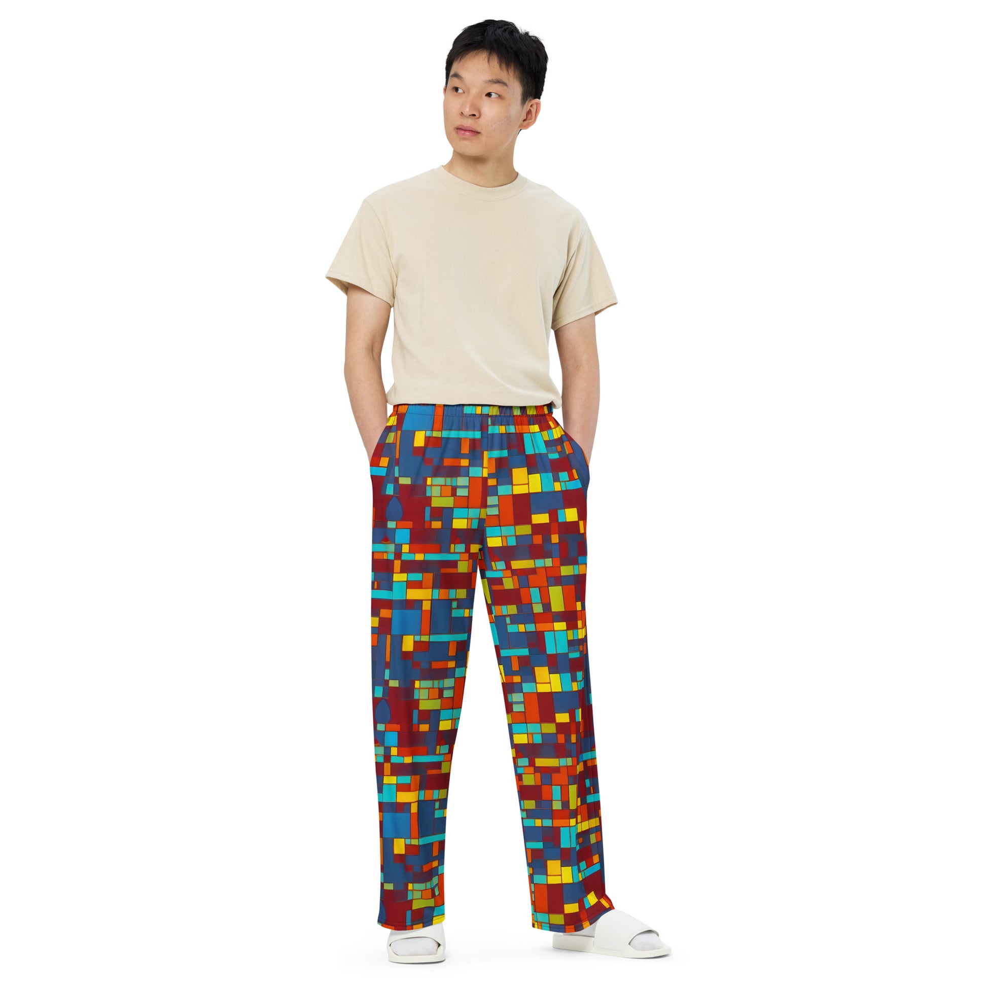 Step into the cosmos of style with our AI-Designed Wide-Leg Pants, featuring the captivating "Astral Grid" pattern from the "Psychedelic Deep Space (SD 1.5)" collection. This stunning design showcases a vibrant interplay of geometric shapes in fiery reds, electric blues, and sunny yellows, making these pants a true statement piece for any creative gathering or summer festival. Experience the perfect blend of art and comfort, where pajama-level softness meets bold, abstract elegance.