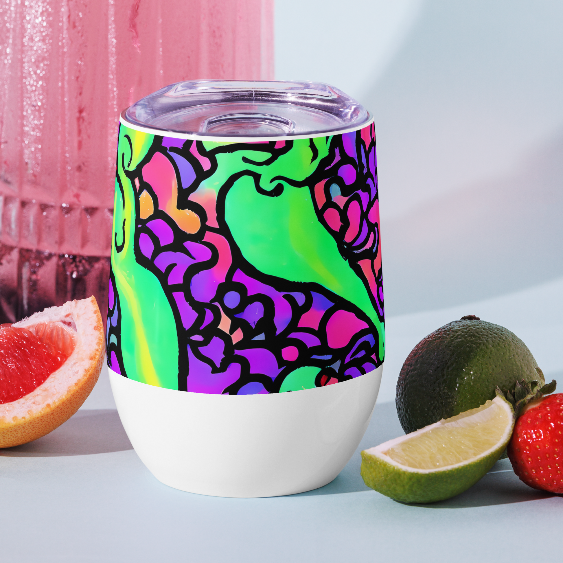 Immerse yourself in the exuberance of our latest wine tumbler, wrapped in the "Kent's Crescendo" design! This masterpiece swirls with the electrifying neon green, pink, and purple hues, capturing the essence of a dramatic artistic legacy. Its bold, abstract shapes are a nod to the adventurous spirit, perfect for those who wish to elevate their social affairs with a touch of artistic confidence and style.