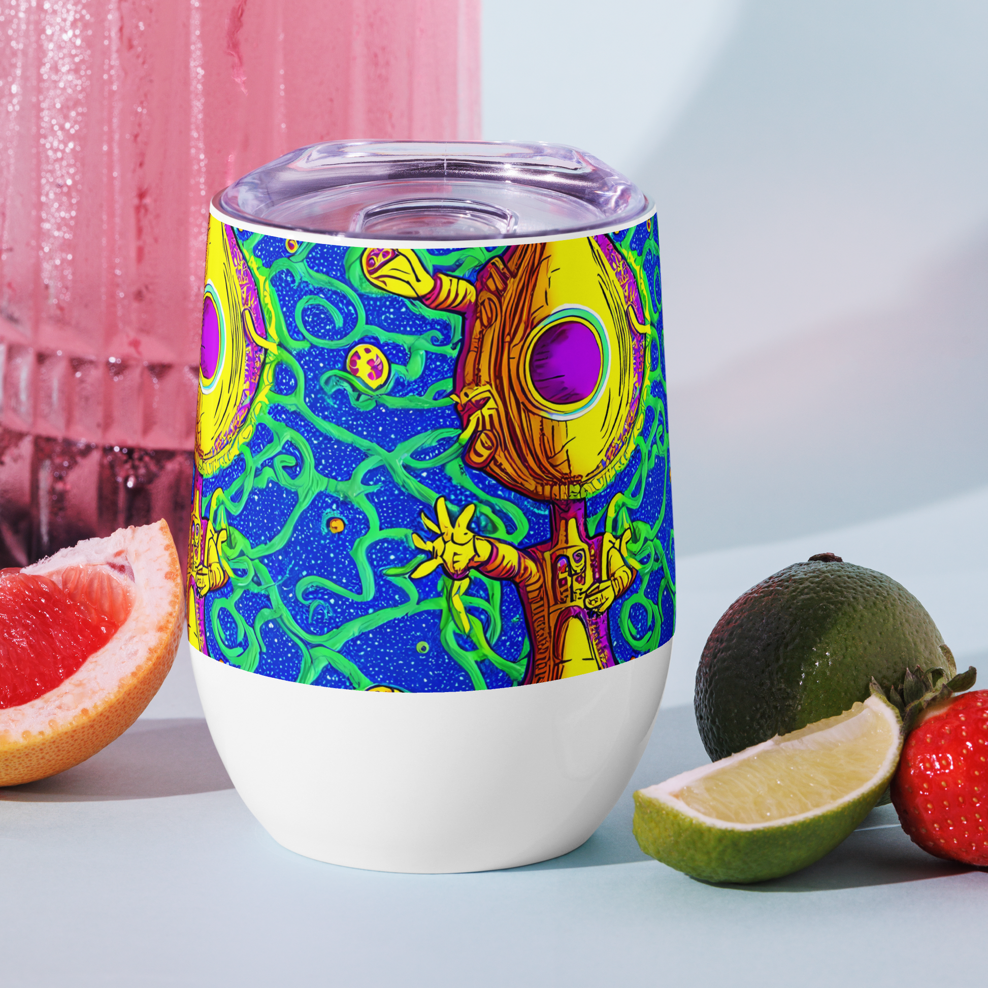 Elevate your beverage experience with our custom-designed wine tumbler, featuring a vibrant tapestry of electric blues and vivid yellows intertwined with whimsical shapes and ethereal textures. Inspired by fantastical urban landscapes, this design showcases playful characters and surreal elements that dance across a cosmic backdrop, making it perfect for those who love to stand out at music festivals, creative events, or any celebration of individuality and imagination.