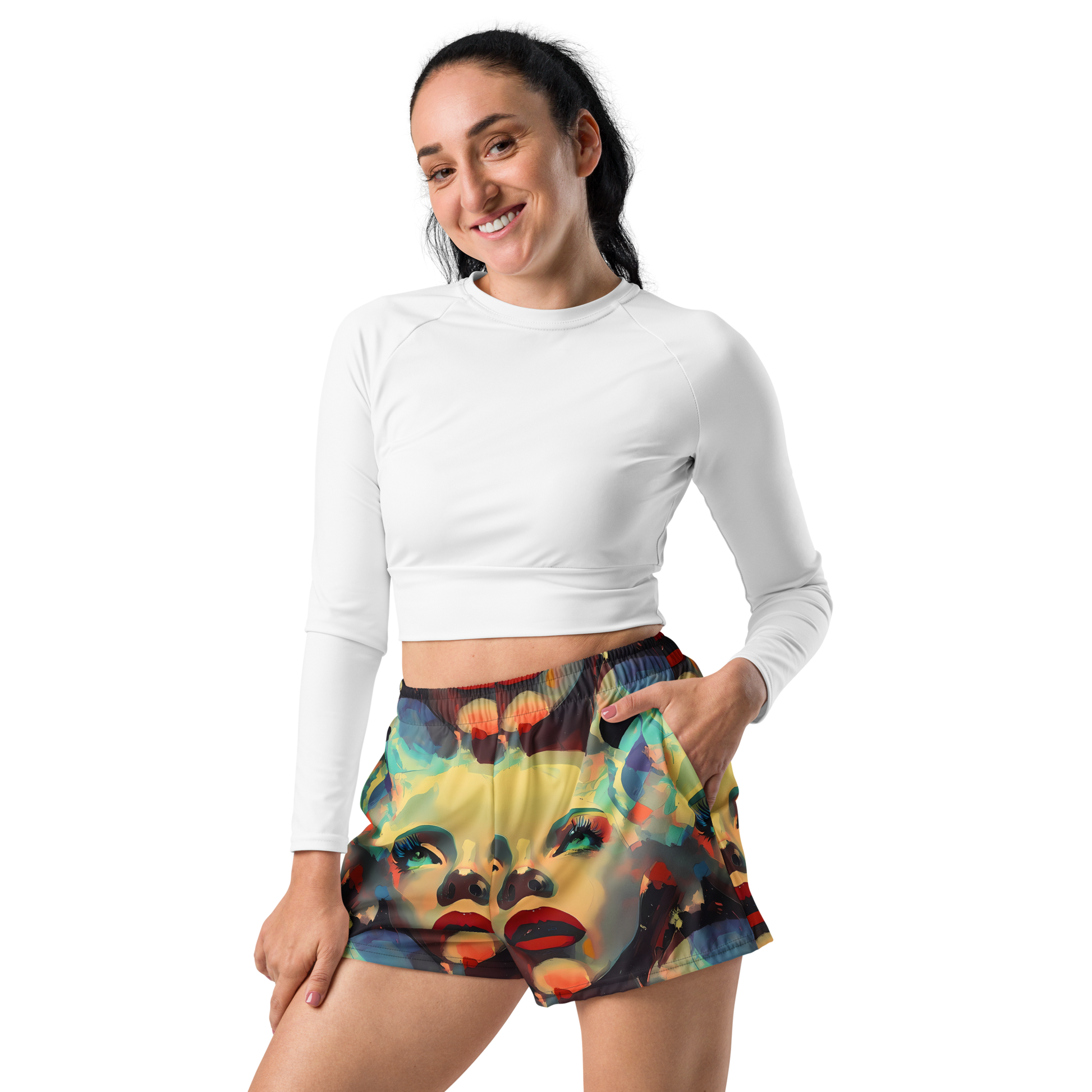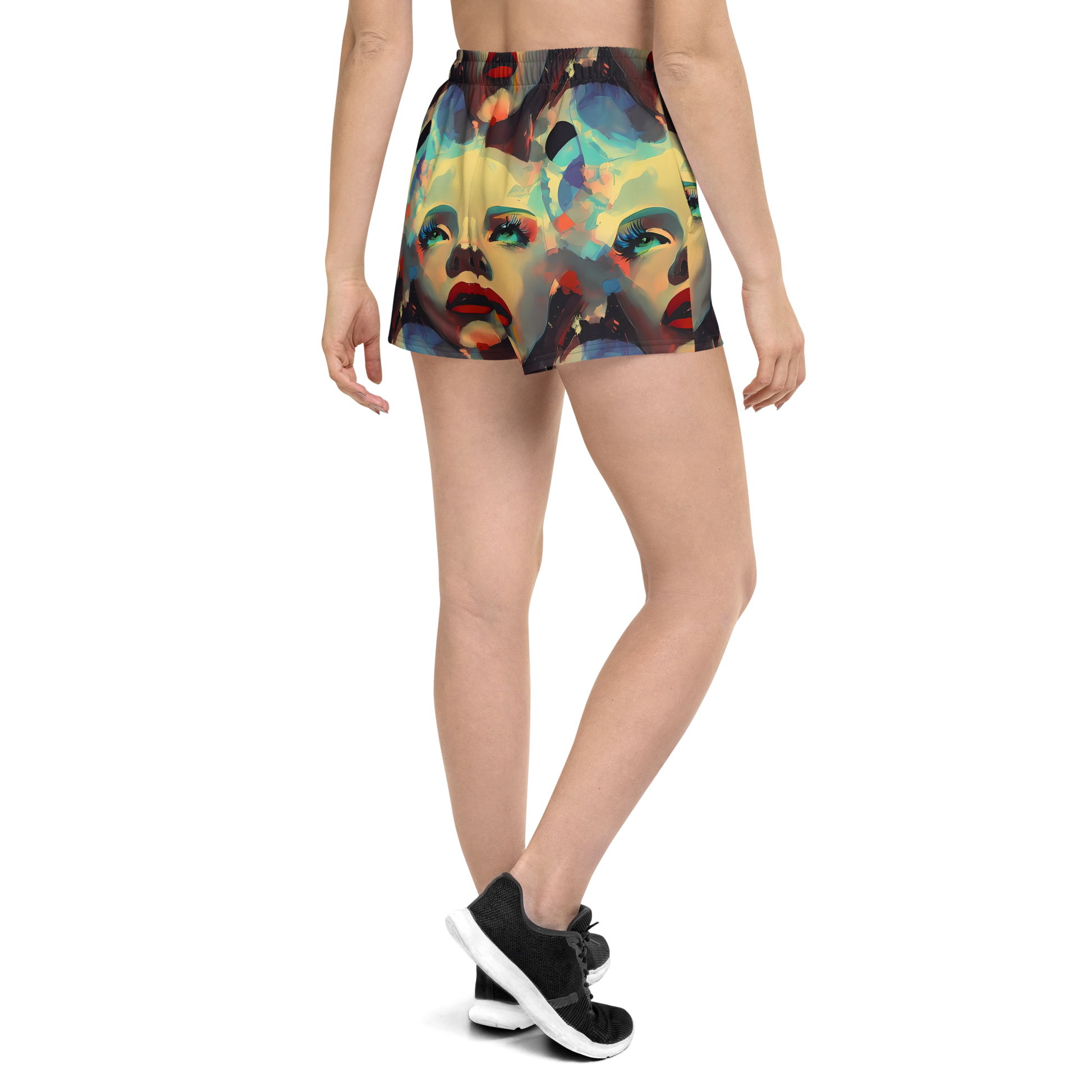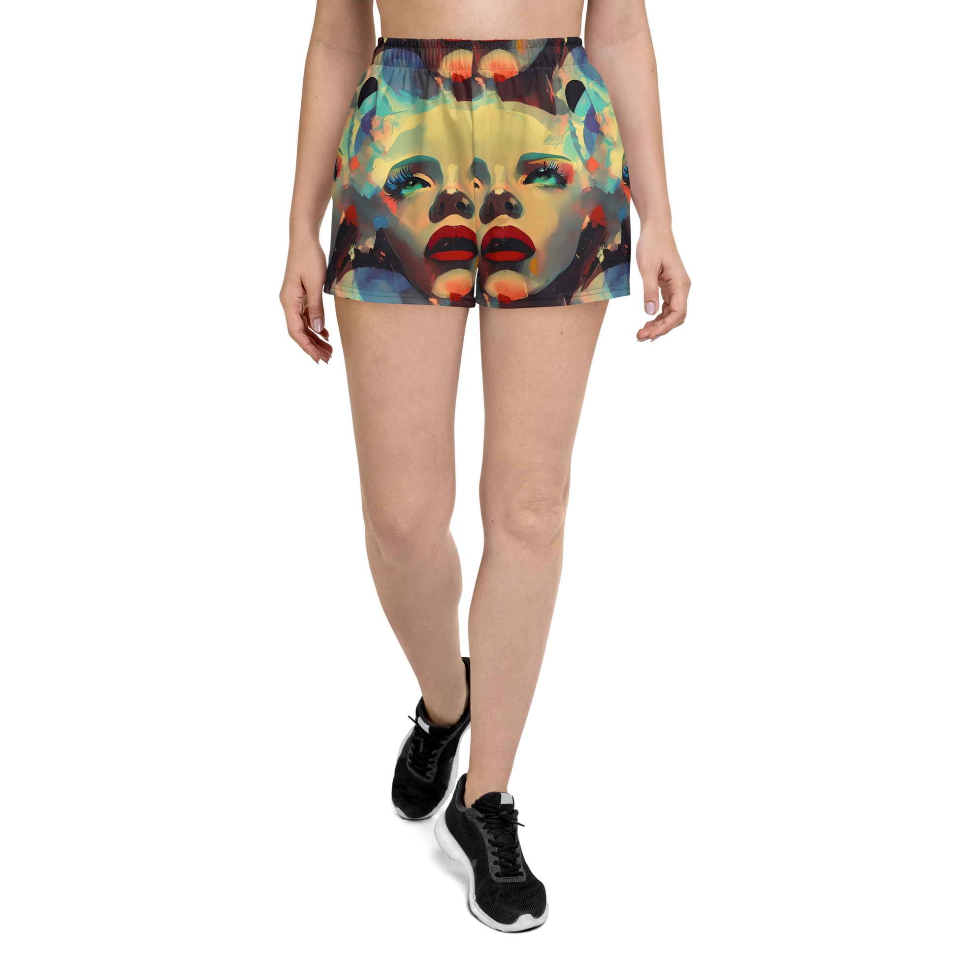 Step into a world of vibrant creativity with our AI-designed athletic short shorts, featuring the mesmerizing "Astral Reflections" pattern. Embrace the bold, expressive faces with striking green eyes and red lips, set against a backdrop of swirling, abstract shapes in vibrant hues of blue, yellow, and orange. Perfect for artistic gatherings, avant-garde events, or making a statement in any season, these shorts are designed for those with a bold, creative personality.