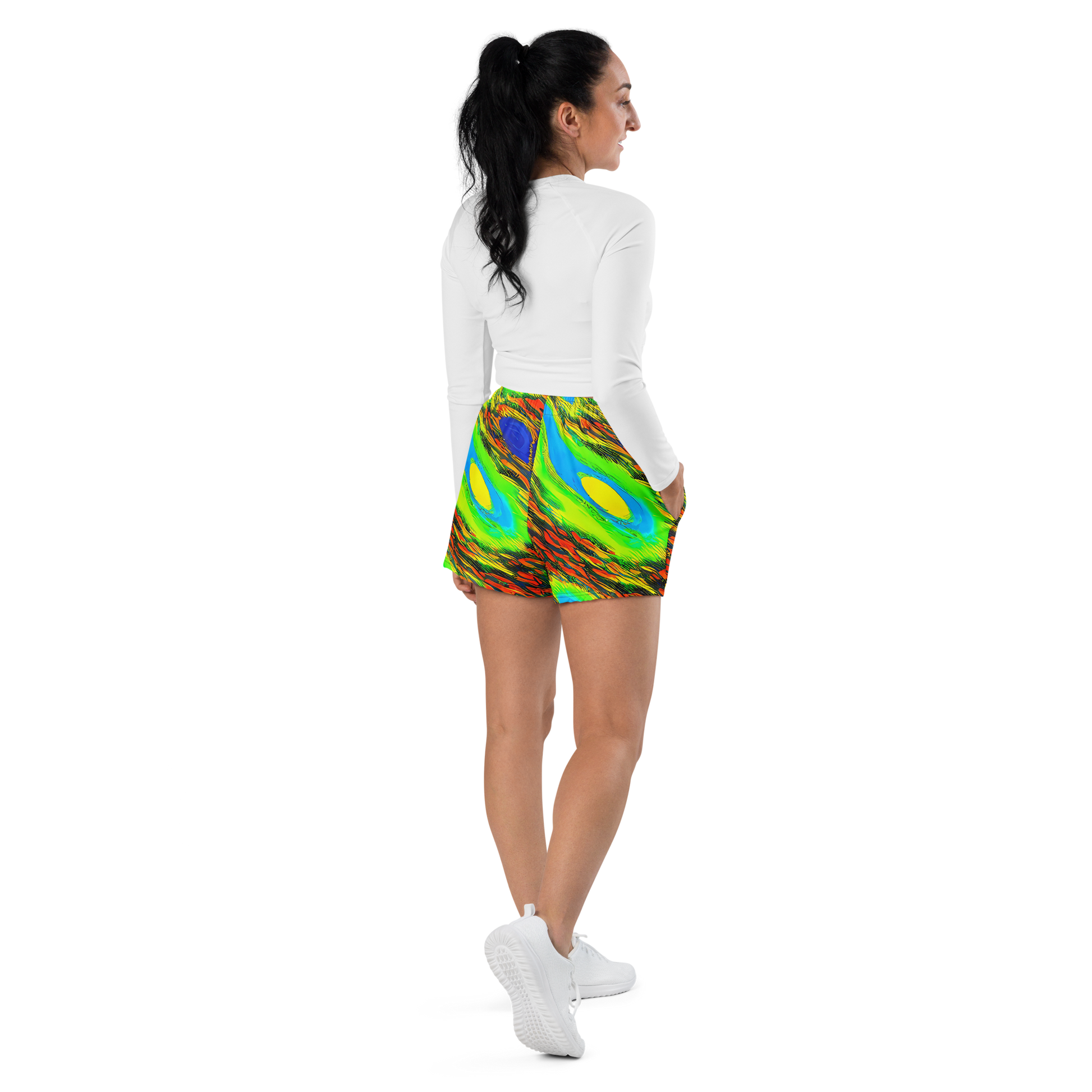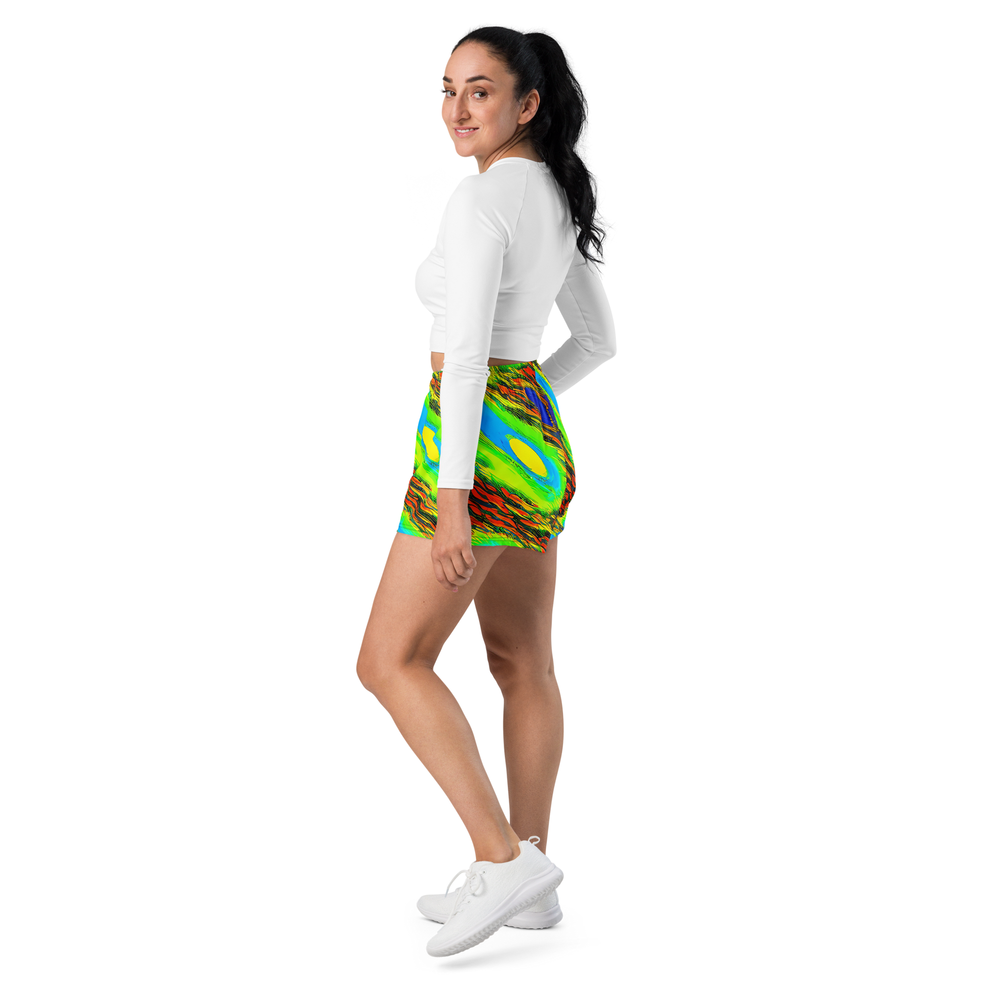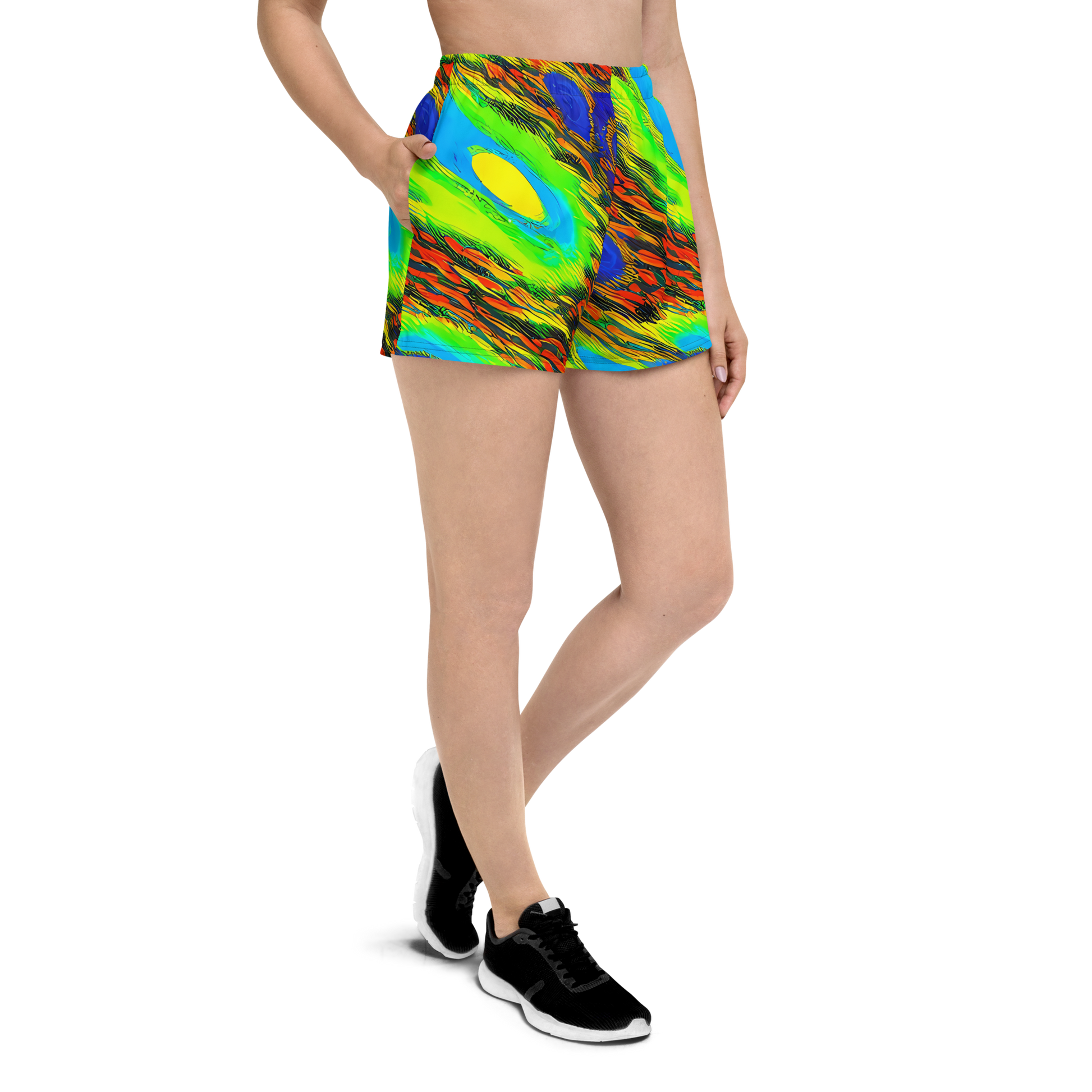 Unleash your inner artist with our Women's Athletic Shorts, enlivened by a mesmerizing pattern that channels the spirit of the great Eliot Hodgkin. Swirls of electric blues, fiery reds, and luminous yellows dance across the fabric, creating a vibrant tapestry that captures organic energy and movement. Perfect for those who wish to make a bold statement, these shorts are a wearable piece of art that will turn heads at any creative gathering or art-inspired event.