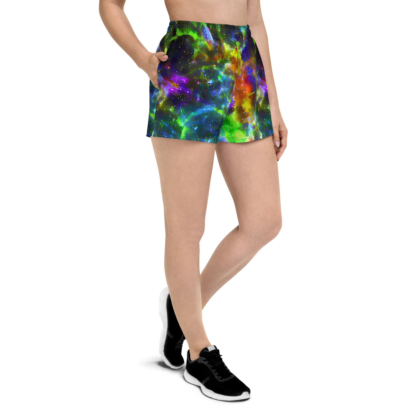 Step into the cosmos with our "Neer Nebula" Women's Athletic Shorts, where vibrant hues of emerald green, sapphire blue, and fiery orange swirl against a backdrop of deep space black. These shorts are not just a piece of activewear; they're a bold statement of your unique style, designed for those who dare to stand out. Perfect for everything from intense workouts to casual outings, the "Neer Nebula" pattern channels the artistic brilliance of Eglon van der Neer, making every movement feel like a dance among the stars.