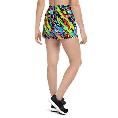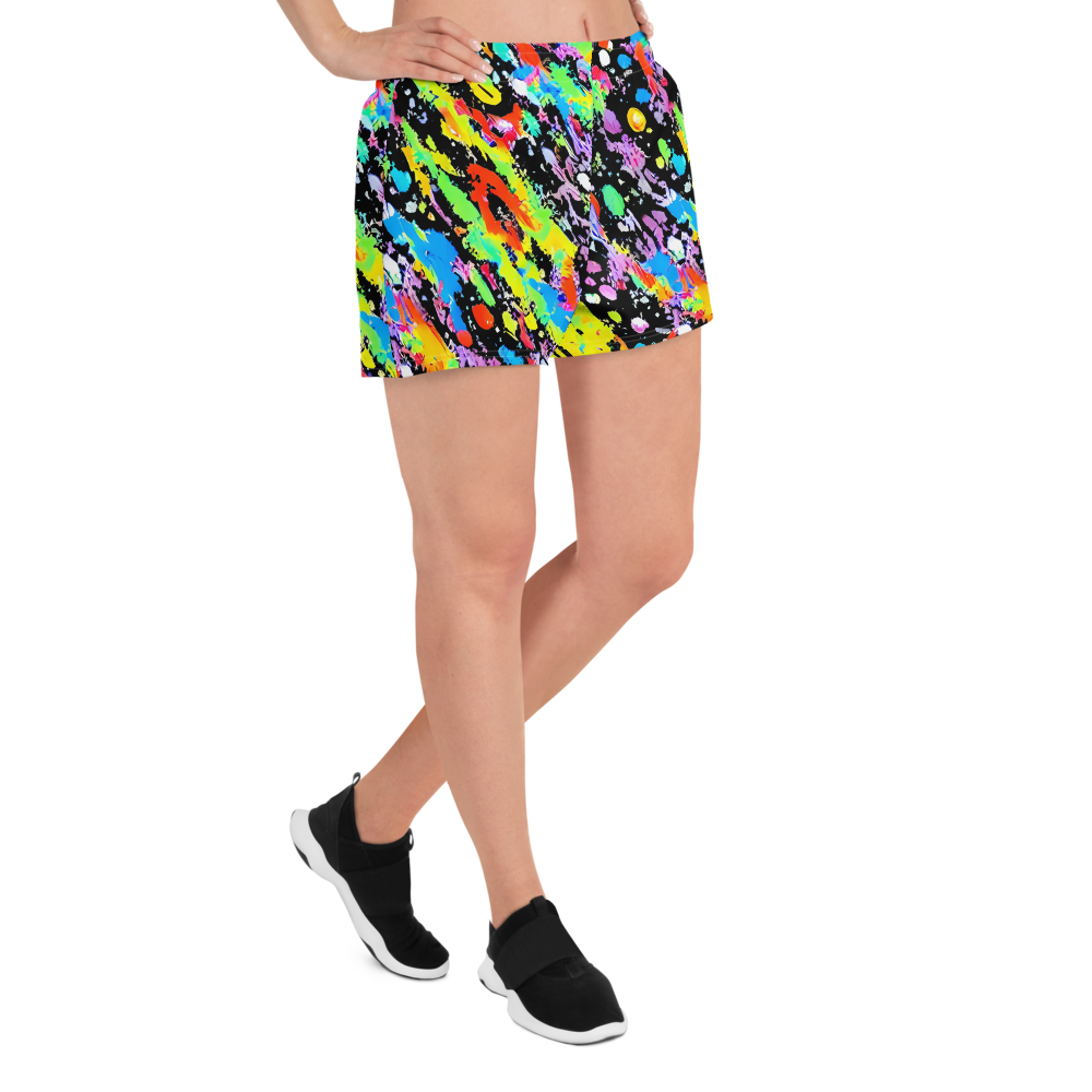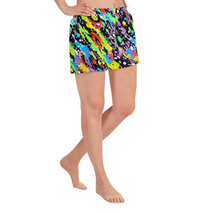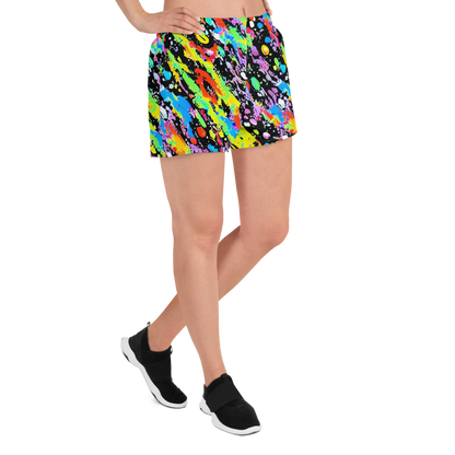 Step into a world of vibrant energy with our AI-designed athletic short shorts, featuring a dynamic pattern that bursts with neon yellow, electric blue, fiery red, and vivid purple on a bold black canvas. Inspired by iconic drip paintings, these shorts exude a playful yet edgy vibe, perfect for artistic events, music festivals, and urban streetwear. Crafted with 91% recycled polyester and 9% spandex, they offer the perfect blend of stretch and support, ensuring you stay comfortable and stylish during any activity.