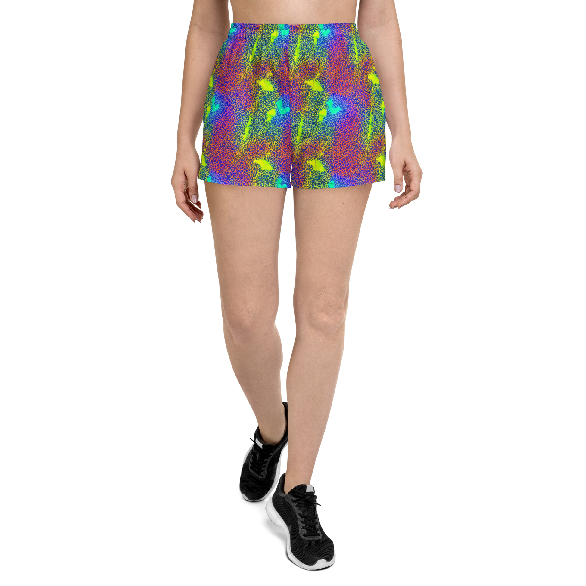 Ignite your workout wardrobe with our electrifying athletic shorts, featuring a kaleidoscopic design that weaves neon blues, yellows, and greens into a mesmerizing red-orange matrix. Designed for those who dare to dazzle, these shorts are your ticket to turning heads at every summer bash, music festival, or any place where your dynamic energy shines brightest. Embrace the vibrance of life and let your spirit soar with every move you make.