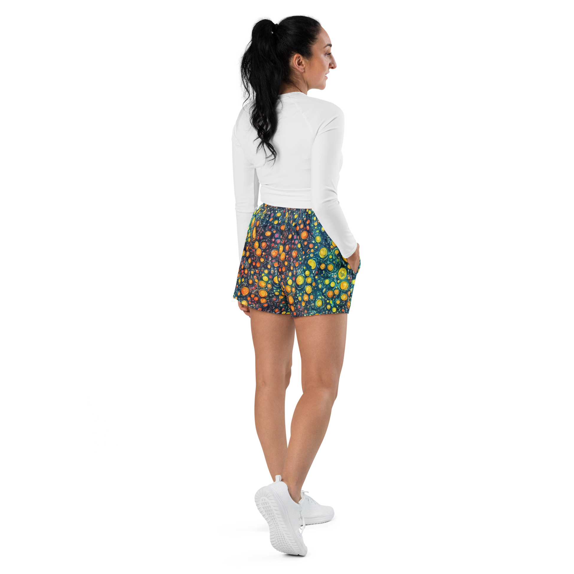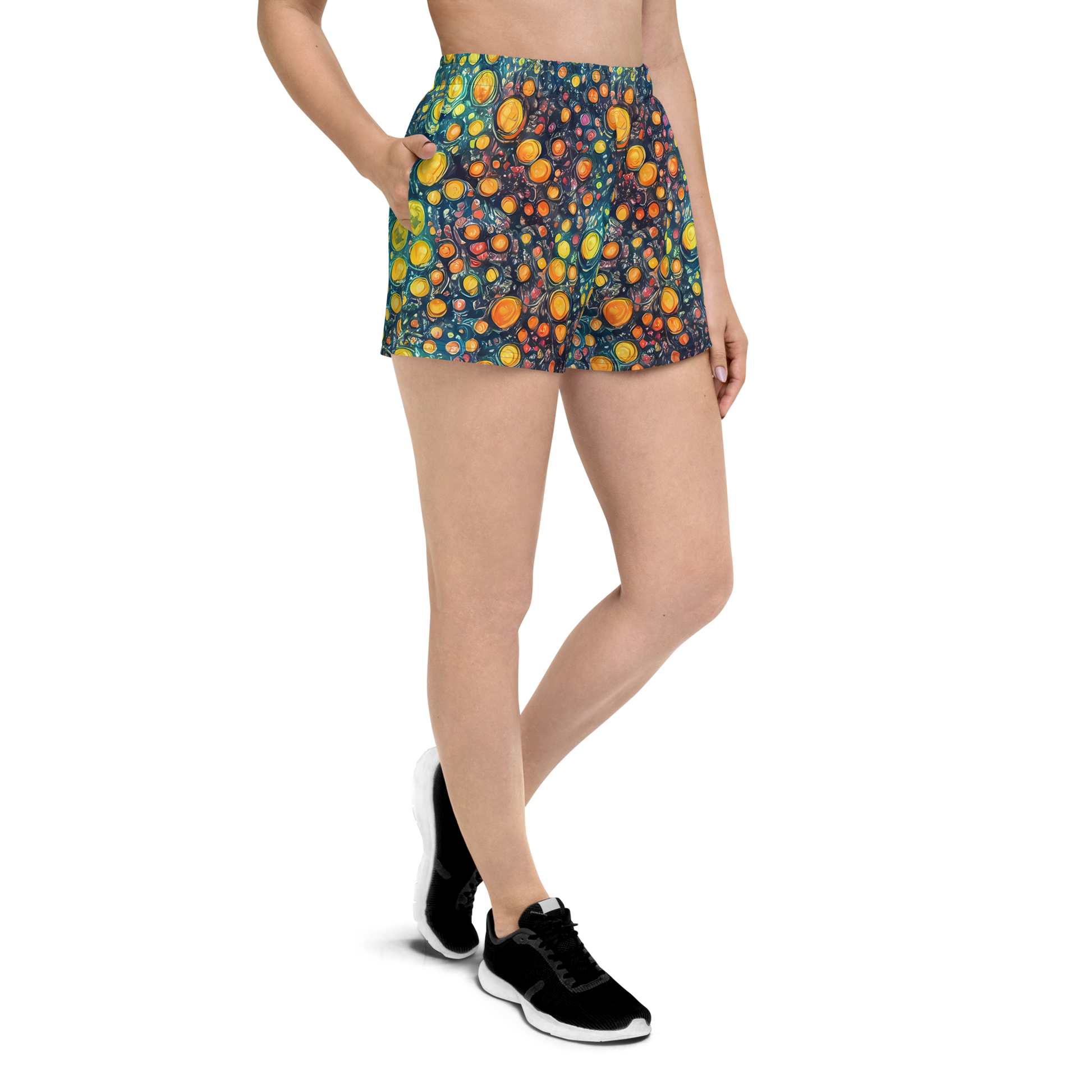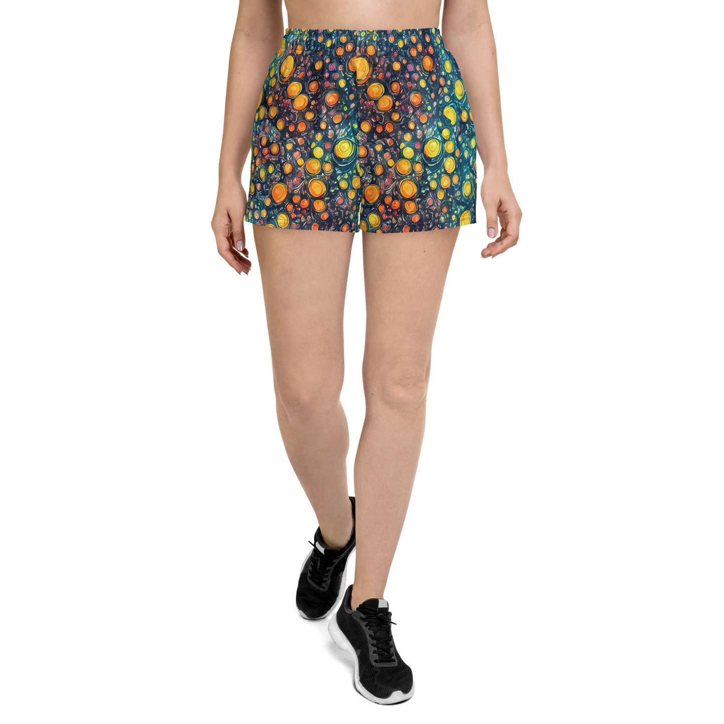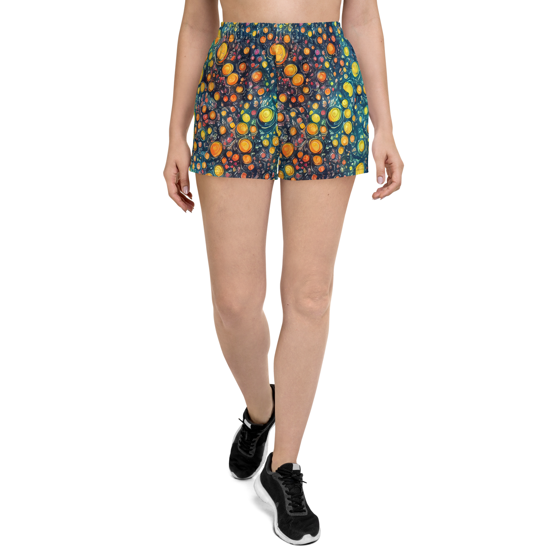 Conquer the cosmos and your workouts with our "Starry Orbits" Women's Athletic Shorts! Draped in the magic of the night sky, these shorts feature a mesmerizing pattern of swirling celestial bodies in a vibrant palette of yellows, oranges, and deep blues, reminiscent of a Van Gogh masterpiece. The dynamic design of planets in motion, adorned with twinkling stars, is not just a fashion statement—it's an invitation to embody the spirit of wonder and exploration in every stride.