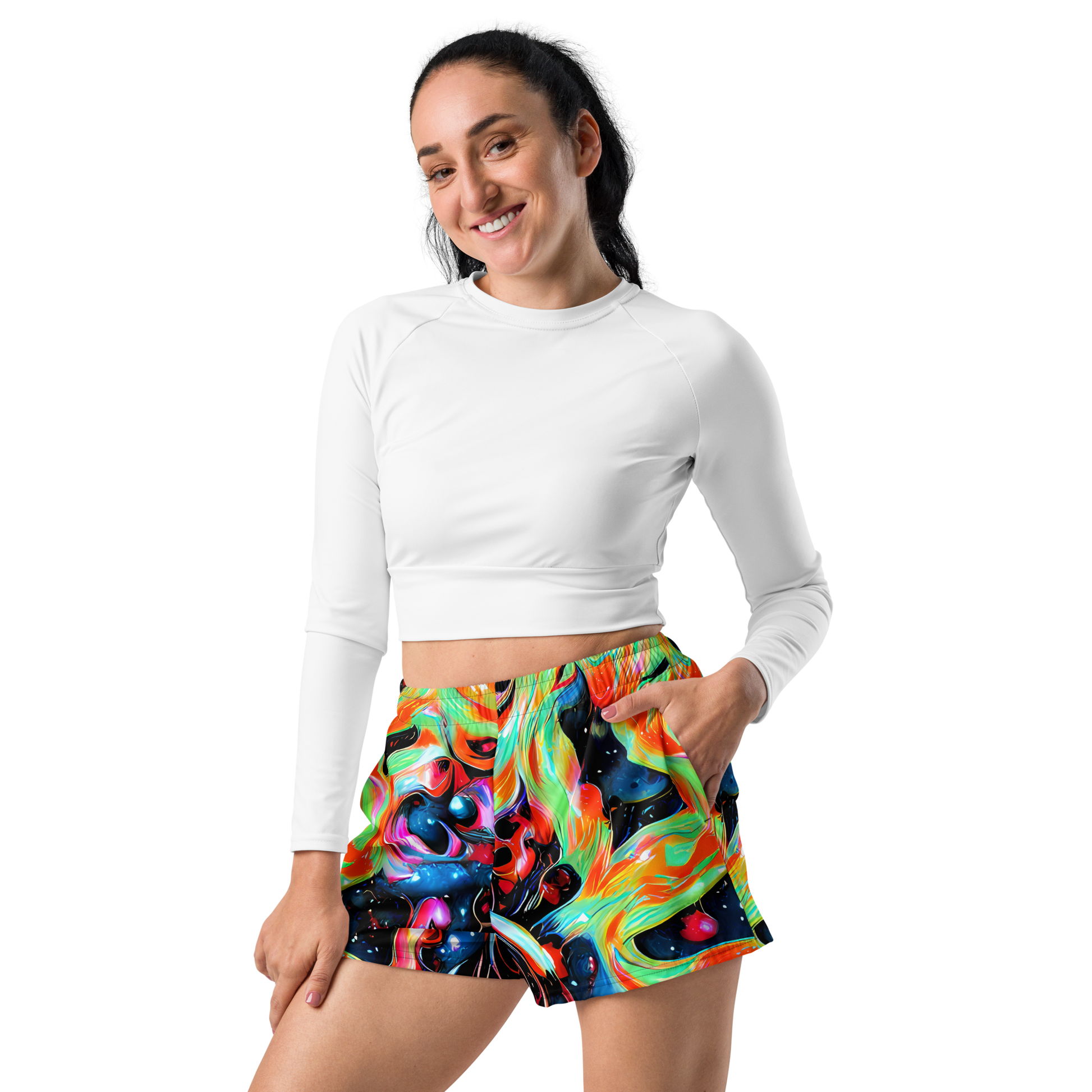 Ignite your workout wardrobe with a touch of artistic rebellion! Our Women's Athletic Shorts boast a hypnotic pattern of swirling oranges, deep blues, and electrifying neon, centered around a stylized female visage that exudes strength and sensuality. Perfect for those who carry a bold spirit into their fitness and creative endeavors, these shorts are not just attire, but a wearable piece of art.