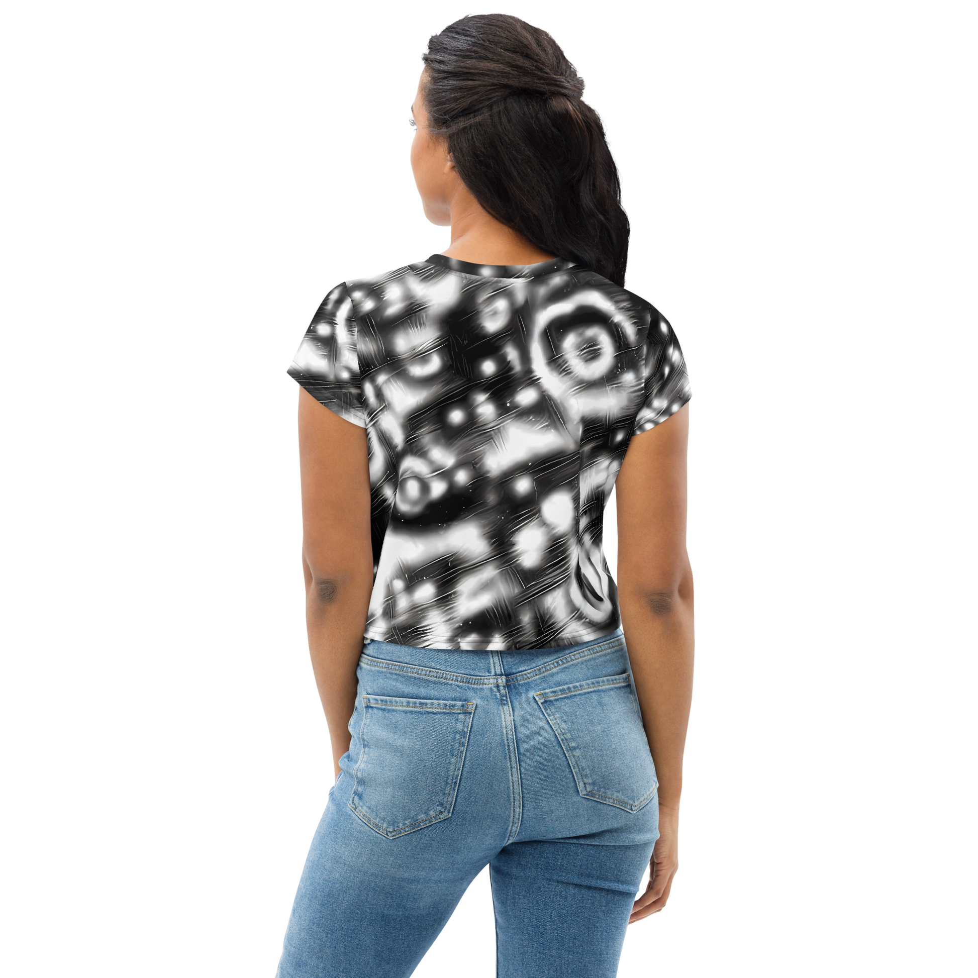 Step into a world where fashion meets fine art with this captivating crop tee, adorned with a hypnotic array of spirals and circular motifs that dance in a harmonious ballet of light and shadow. This high-contrast, black and white top is a tribute to the dramatic flair of abstract expression, perfect for those who command attention and appreciate the nuances of a timeless monochromatic palette.