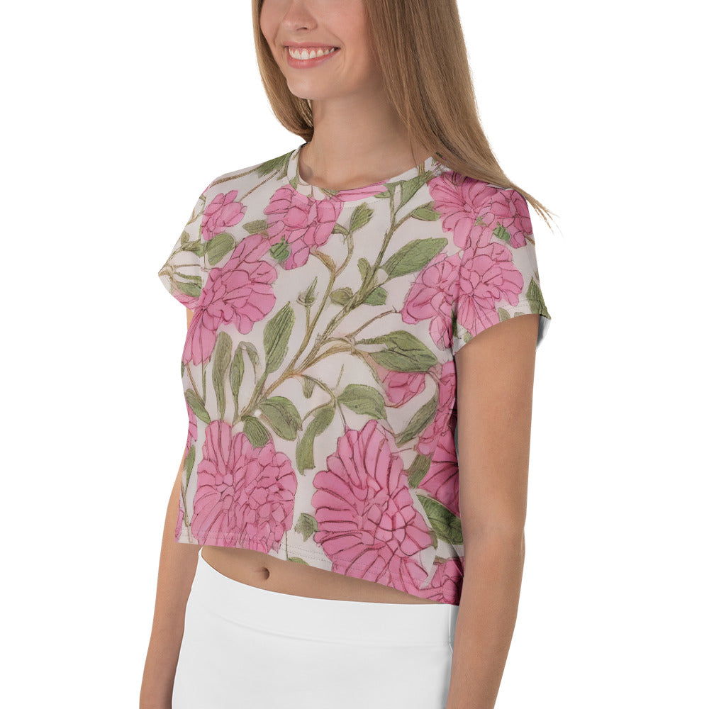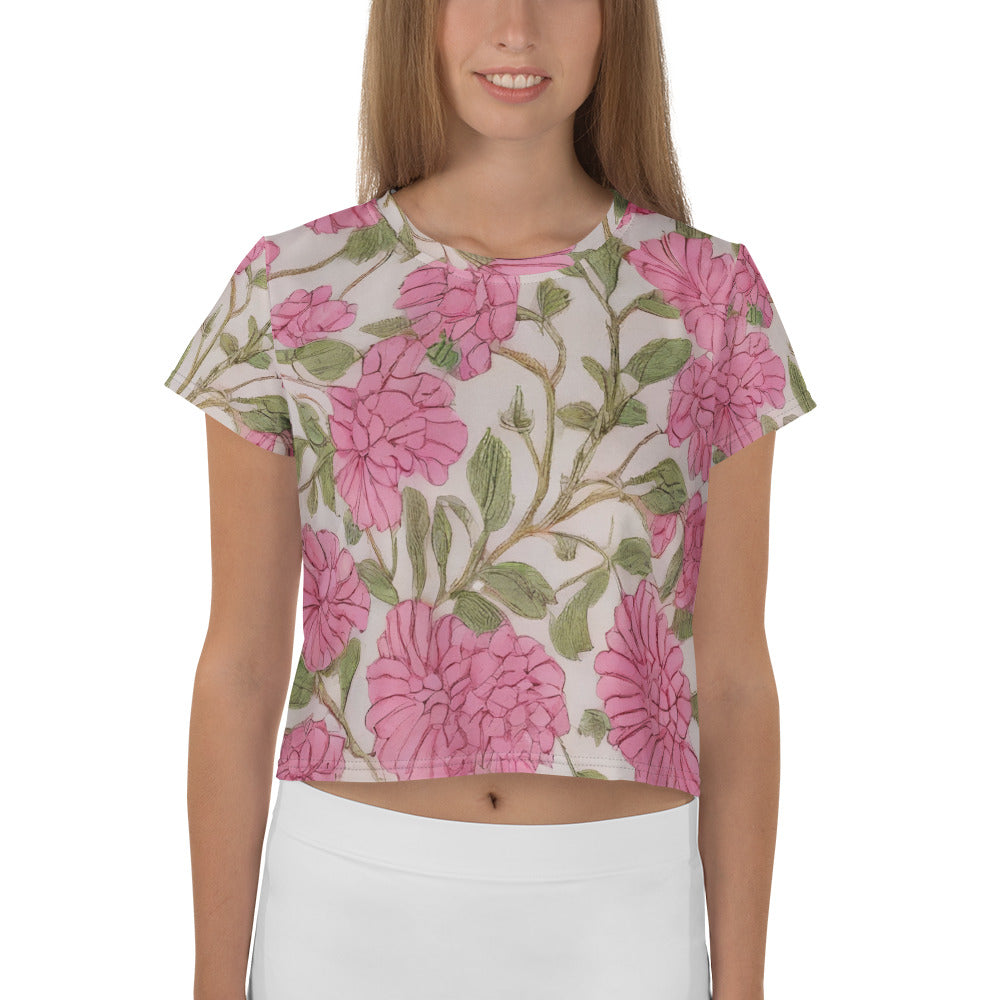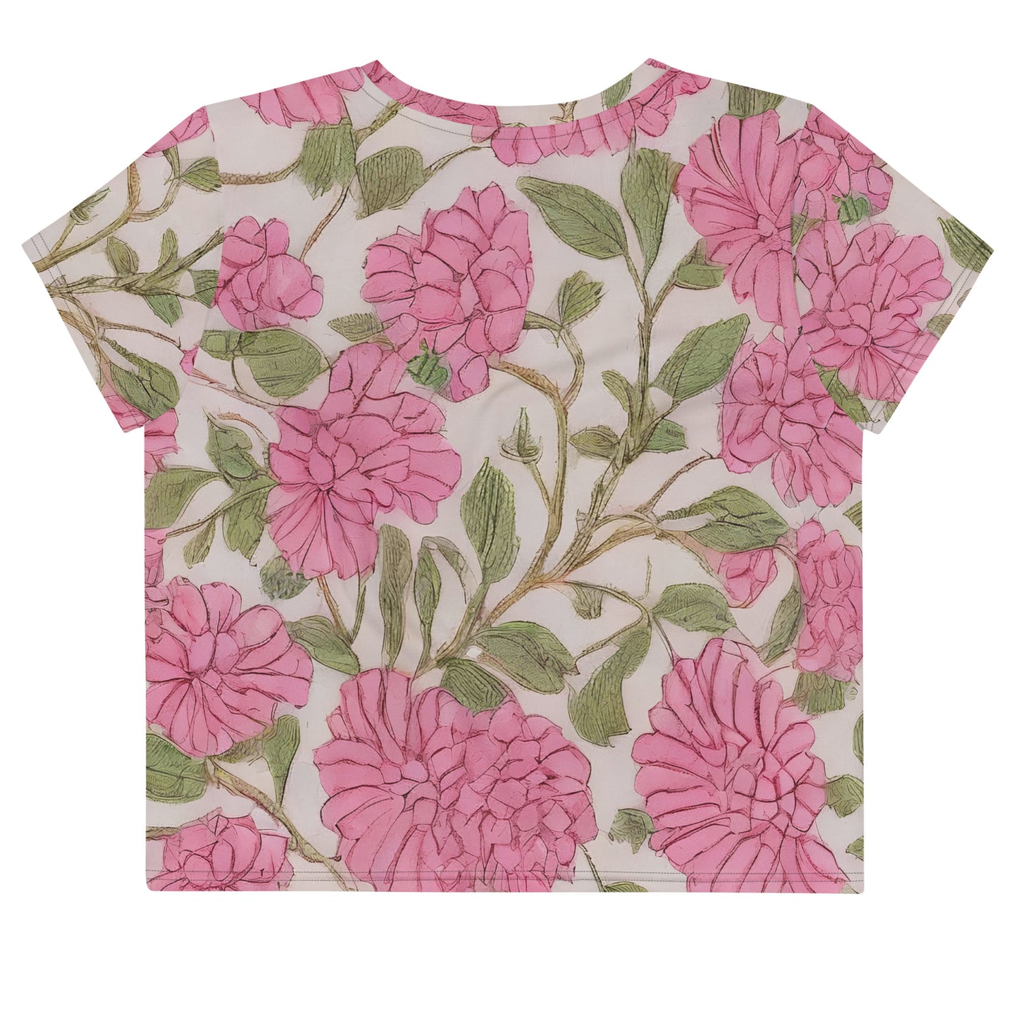 Step into a world of elegance and whimsy with our Women's Crop Tee featuring the enchanting "Blossom Symphony" pattern. Adorned with vibrant pink florals and delicate green leaves against a soft neutral backdrop, this tee captures the essence of romantic nostalgia and artistic flair. Perfect for sunny spring garden parties or chic summer brunches, this crop tee is designed for the free-spirited woman who isn't afraid to showcase her unique style.