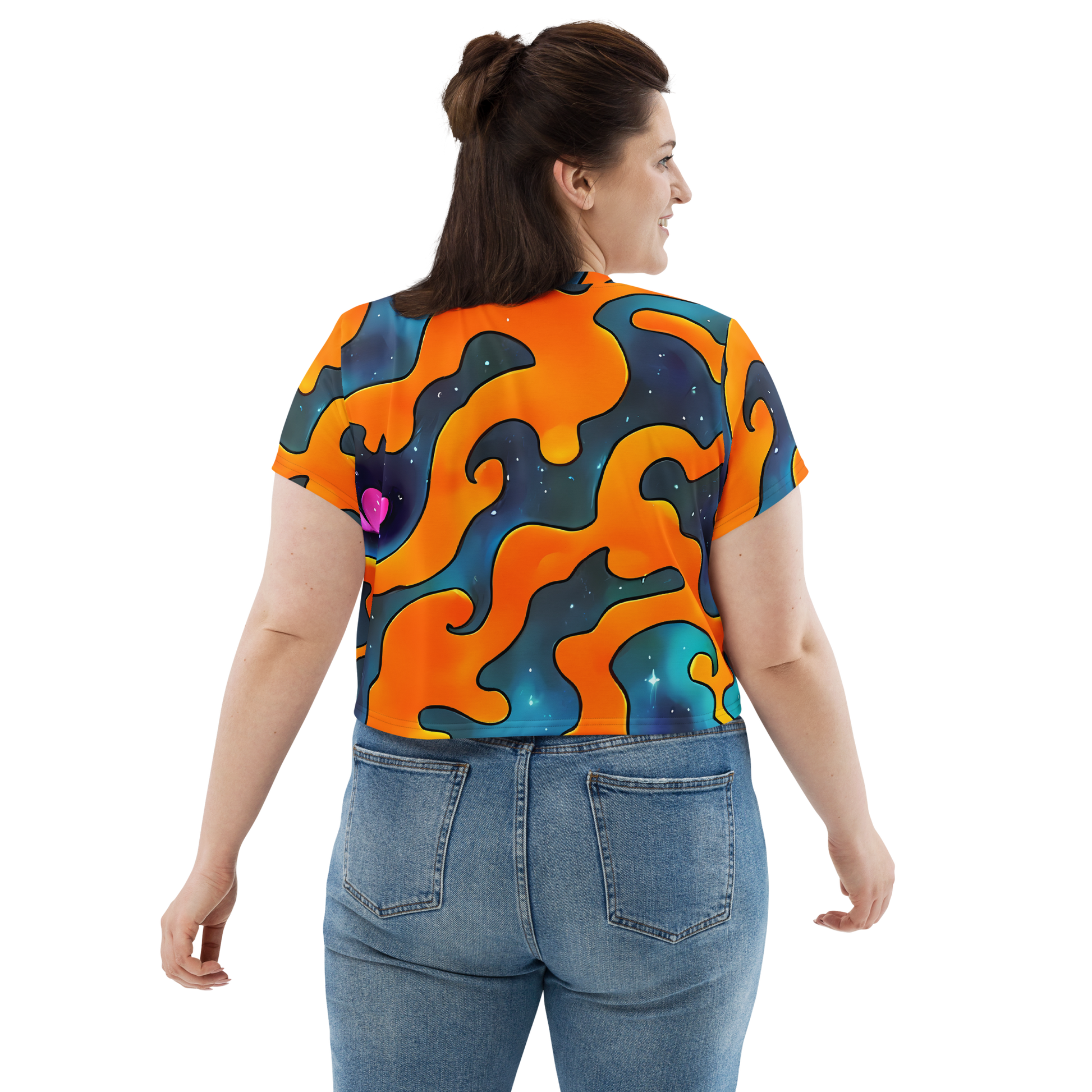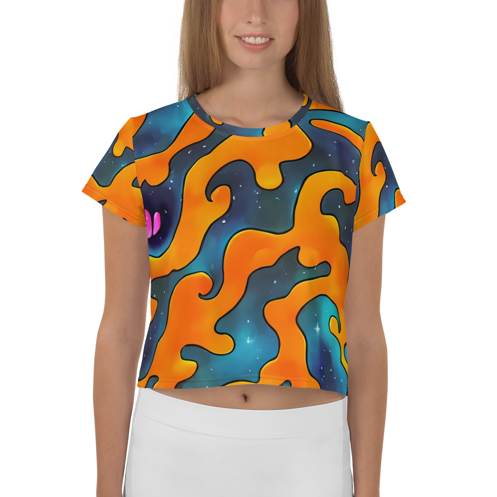 Our Women's Crop Tee is a celestial marvel, featuring a pattern that captures the awe of the cosmos right on your attire. The harmonious clash of orange amoeba-like shapes floating on a deep blue starry canvas creates a visual symphony that's bound to turn heads. With its smooth, glossy texture and energetic colors, this top is a tribute to the bold and the imaginative, ready to make a statement wherever your adventures take you.