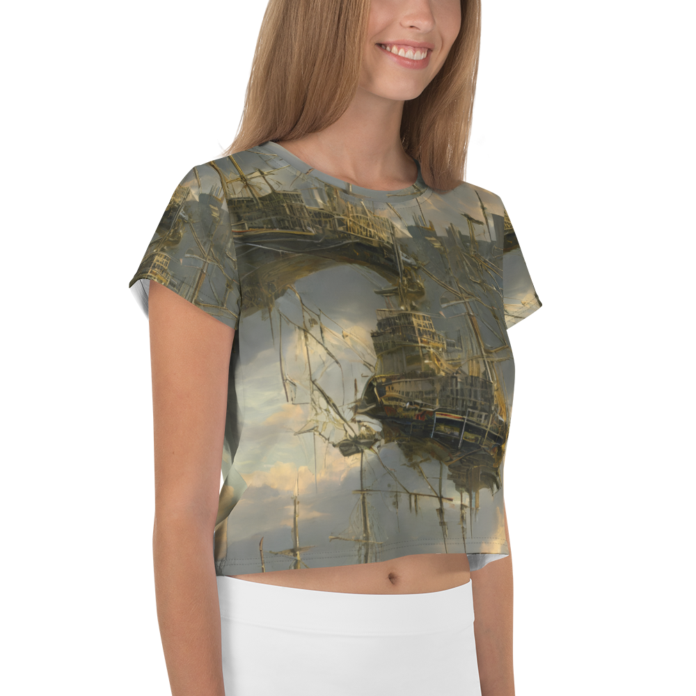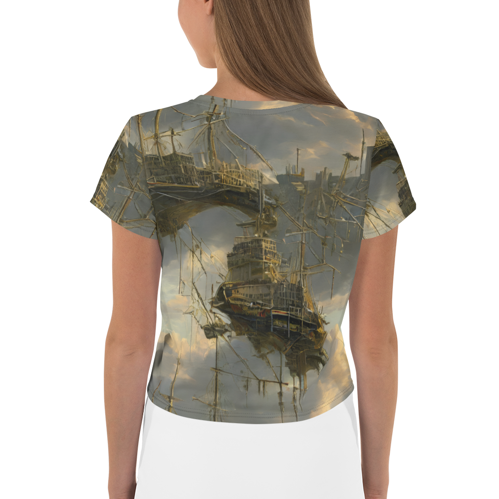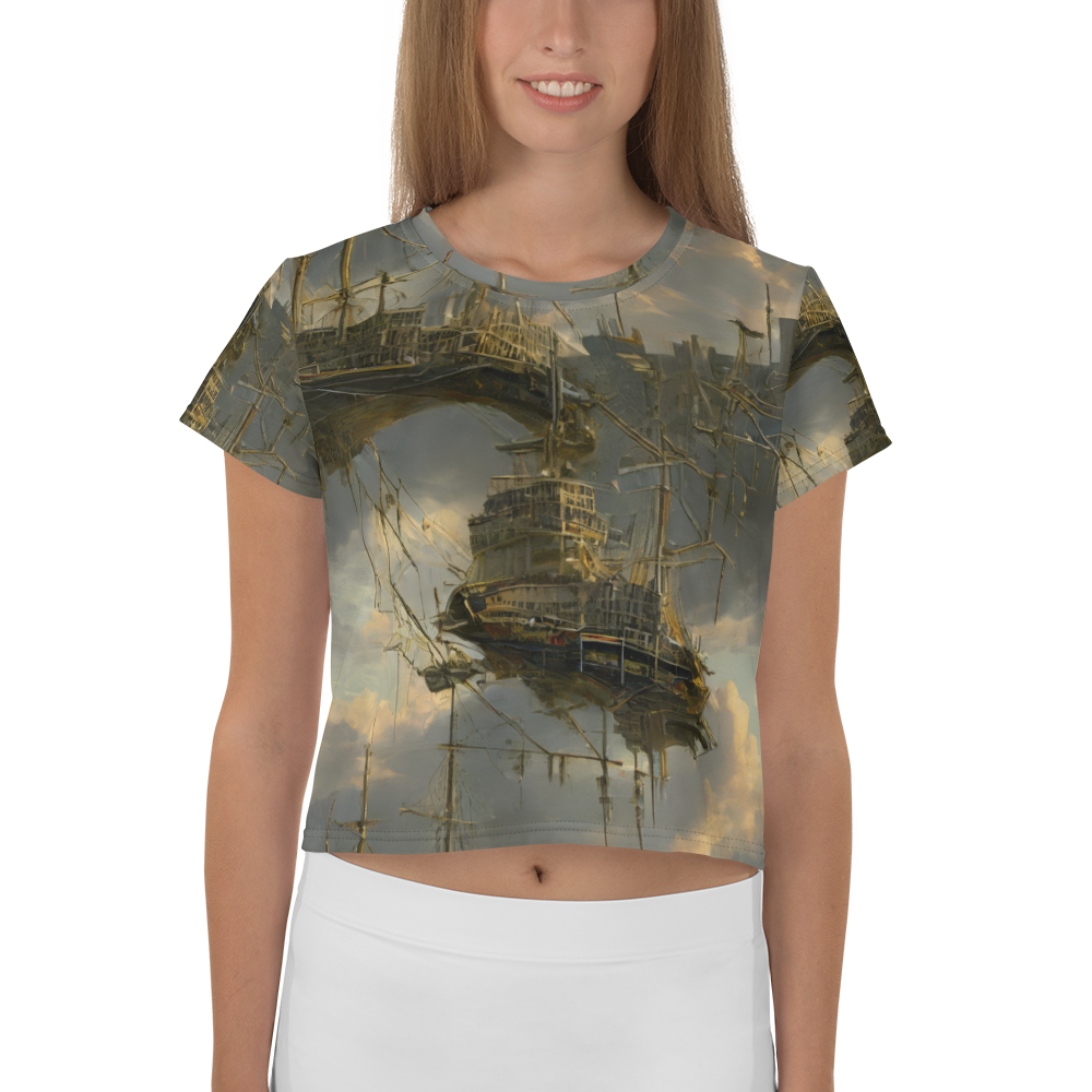 Set sail on a journey of style with our Women's Crop Tee featuring the enchanting "Ethereal Armada" pattern! This captivating design blends steampunk aesthetics with digital fantasy, showcasing intricate ship silhouettes amidst swirling clouds in muted gray, gold, and blue. Perfect for the bold and imaginative, this crop tee not only makes a stunning statement but also offers unparalleled comfort and flexibility, making it an essential addition to your wardrobe for any tech-inspired gathering or avant-garde art event.