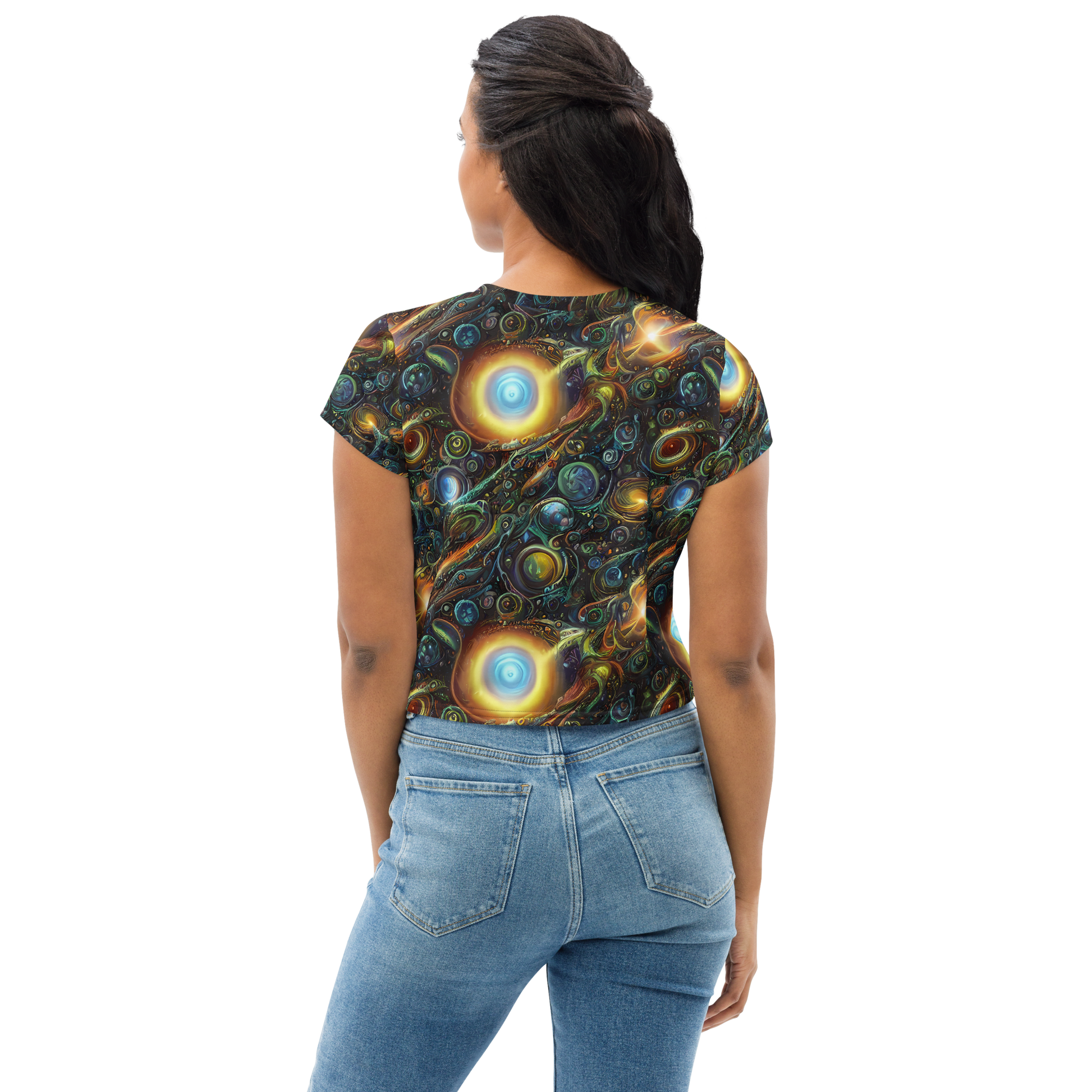 Step into a realm of enchantment with our mesmerizing Women's Crop Tee, swirling with iridescent blues, greens, and a touch of cosmic gold and orange. This top is not just a piece of clothing, but a portal to a universe of style, inspired by the fantastical art of otherworldly dimensions. It's a statement piece for the bold and the creative, ready to turn heads at any event, in any season.
