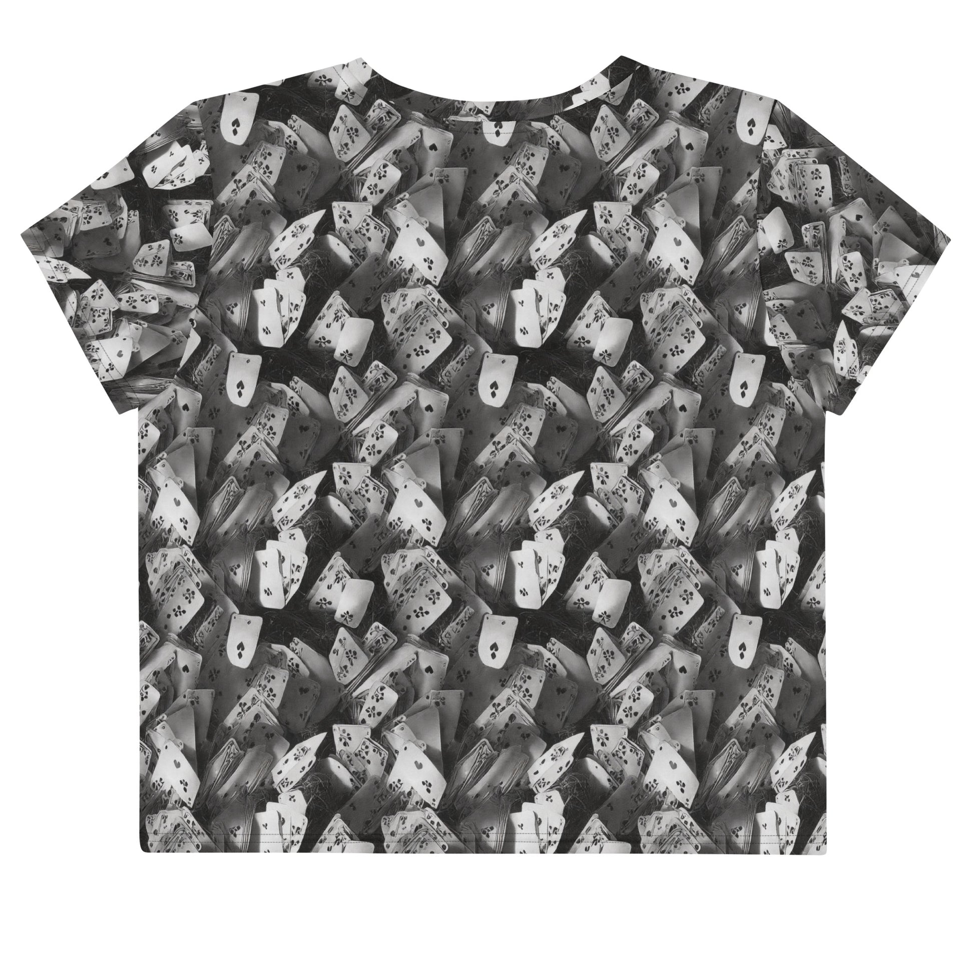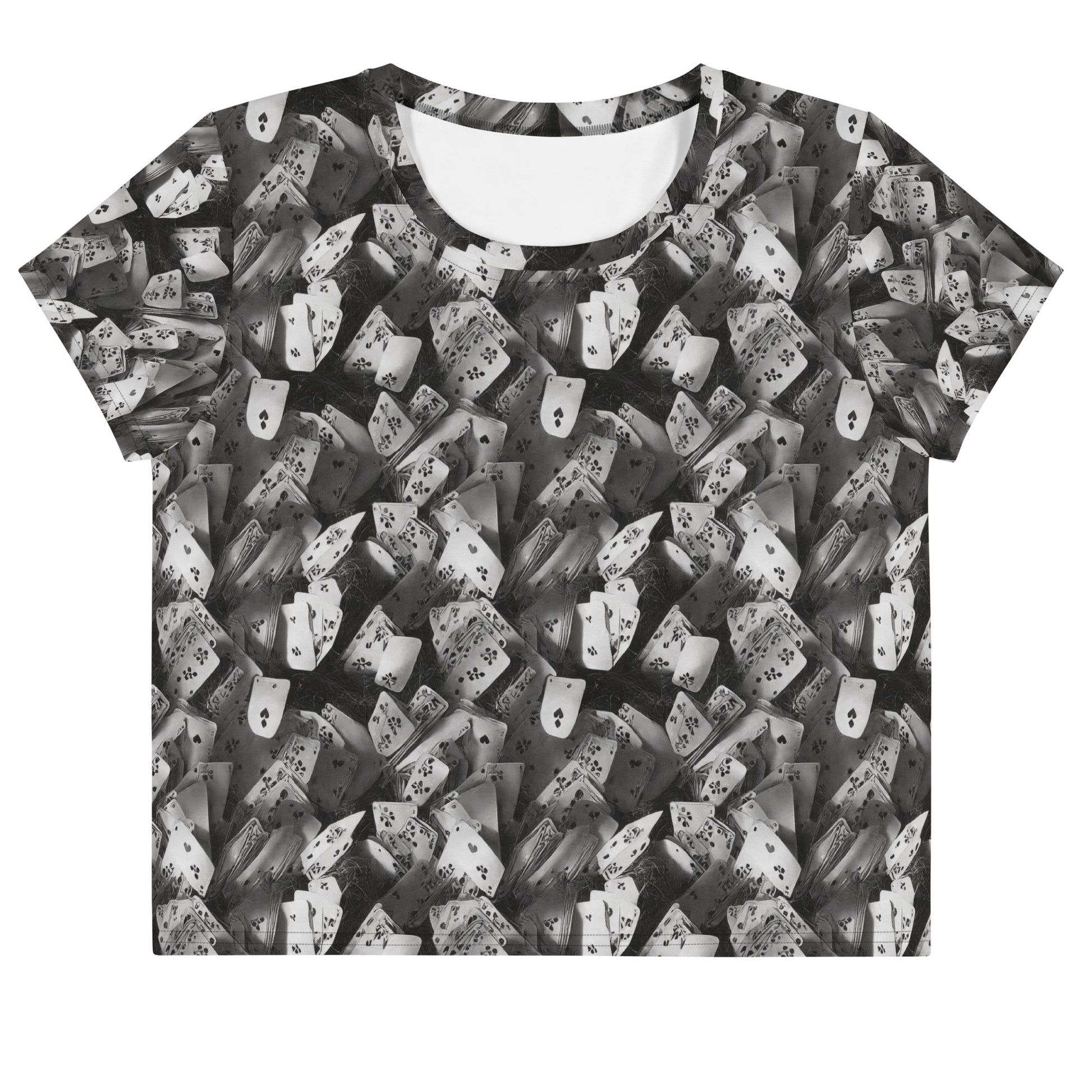 Step into a world of whimsy and intrigue with our "Fortune’s Folly" Women's Crop Tee! This striking piece features a captivating monochrome pattern that intertwines scattered playing cards with a surreal, dreamlike texture, making it the perfect choice for the adventurous spirit. With its bold black and white contrast, this crop tee is designed for those who thrive on the unexpected and are ready to make a statement at any autumnal gathering or avant-garde event. Embrace your unique style and let your personality shine!