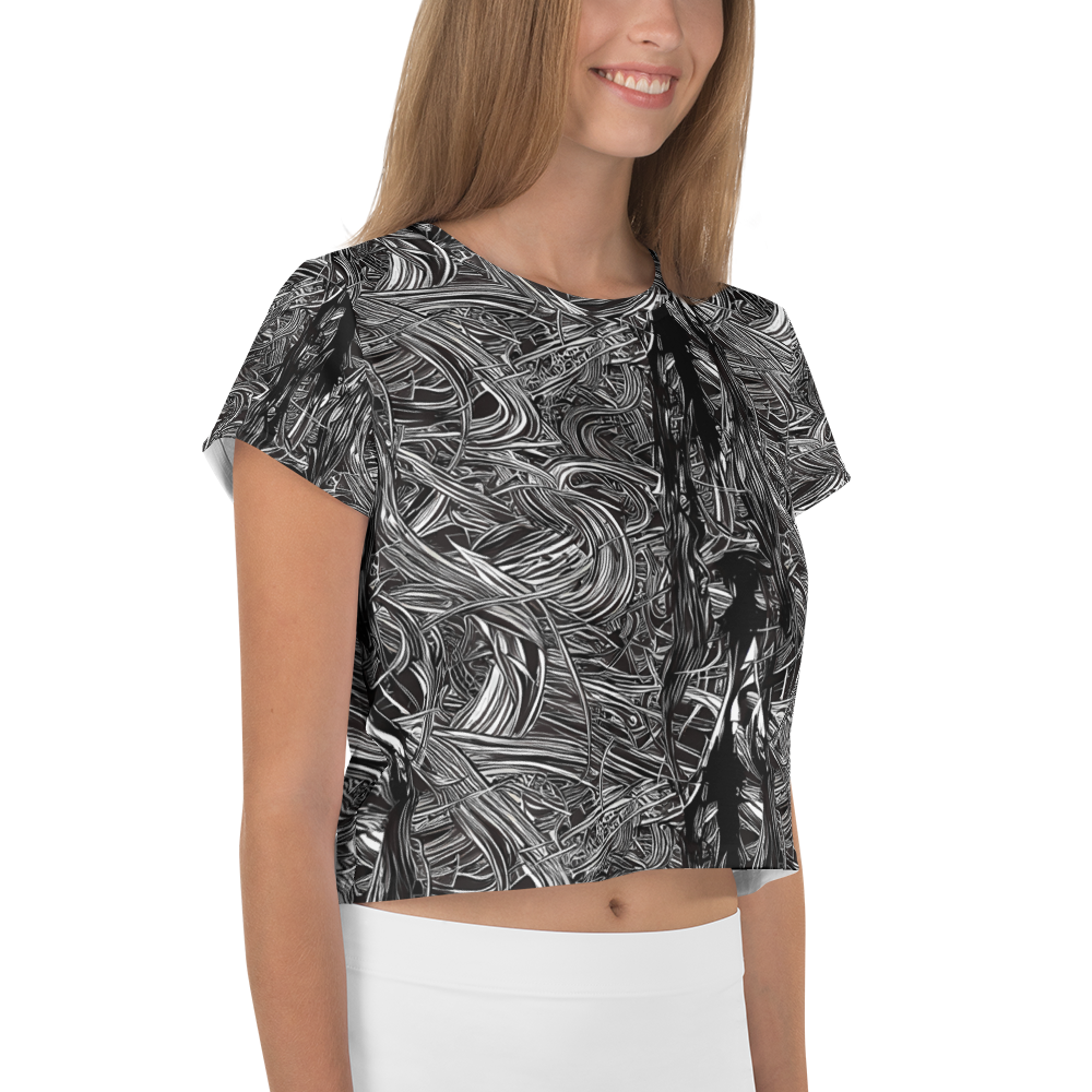 Unleash your creativity and make a bold statement with our Women's Crop Tee featuring the mesmerizing "Mesmeric Tangles" pattern. This captivating design, inspired by intricate and chaotic lines in striking black and white, evokes a sense of depth and mystery, making it the perfect addition to your fall and winter wardrobe. Whether you're heading to an avant-garde event or simply want to elevate your urban streetwear, this crop tee is tailored for those who dare to stand out and embrace their unique style.