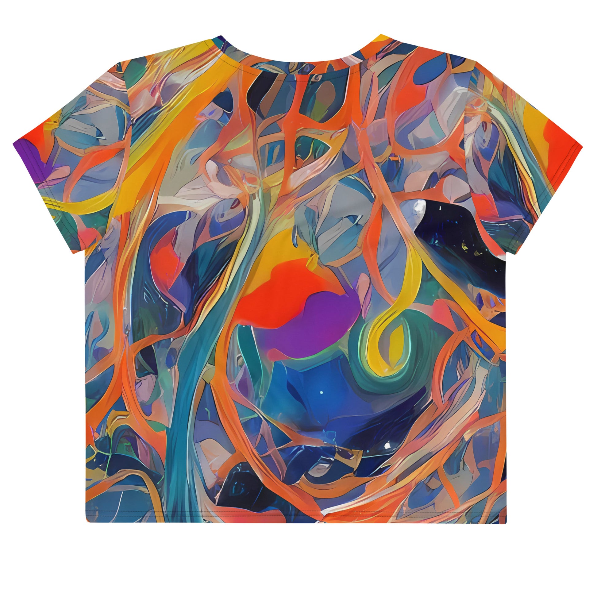 Unleash your artistic spirit with our Women's Crop Tee featuring the vibrant "Vivid Tangle" pattern! This dynamic design, inspired by the energetic brushwork of Cecily Brown and the mystical symbolism of John Duncan, intertwines bold, swirling lines and a palette of fiery oranges and deep blues. Perfect for creative events or gallery visits, this crop tee is not just a piece of clothing—it's a wearable work of art that embodies your unique style and flair.