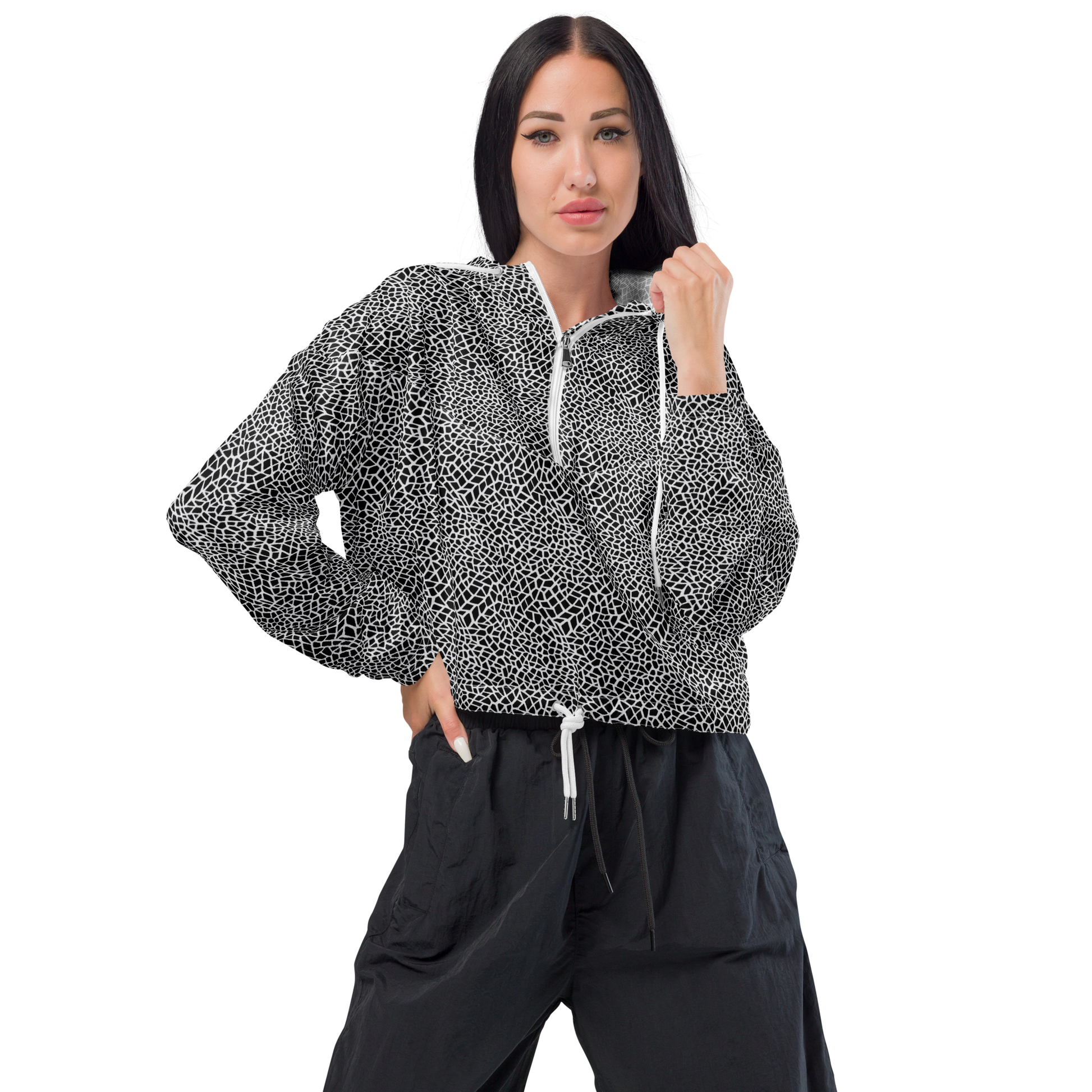 Unleash your inner artist with our AI-designed Women's Cropped Windbreaker, featuring the stunning "Abstract Expressionism" pattern by Goy~C Hashiguchi and Benjamin Block. This unique piece not only showcases a vibrant and eye-catching design but also elevates your style with its lightweight, waterproof fabric—perfect for any adventure, rain or shine!
