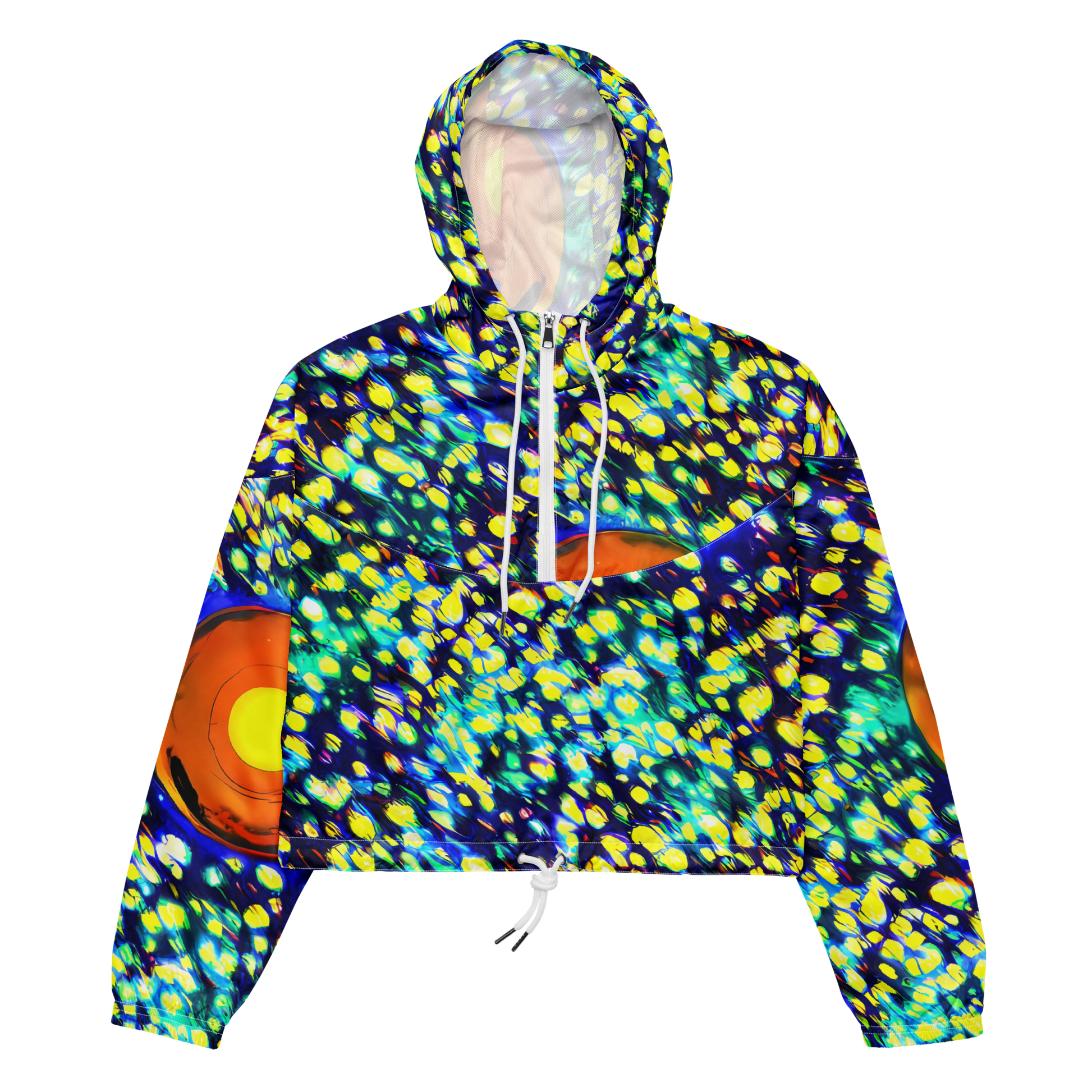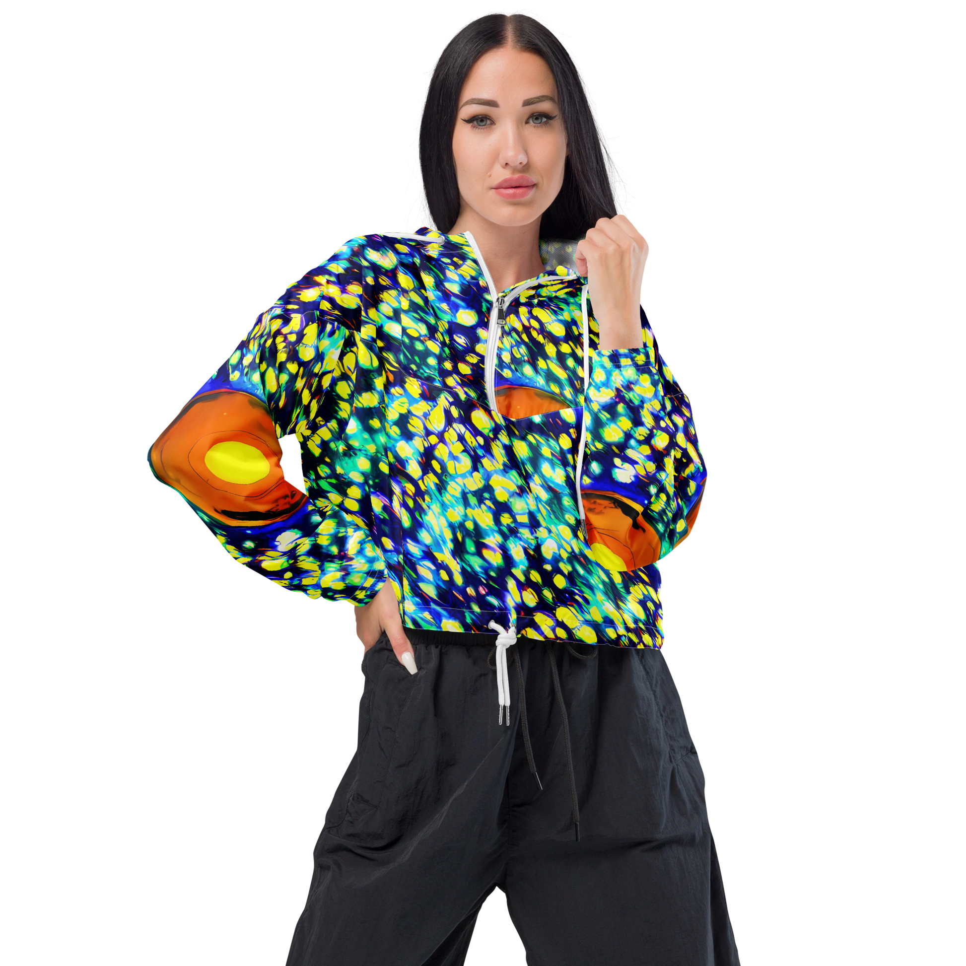 Unleash your adventurous spirit with our AI-designed Women's Cropped Windbreaker, featuring the stunning "Illuminated Whirl" pattern. This vibrant design, with its electric blues, vivid yellows, and warm oranges, captures the essence of a cosmic dance, making you the center of attention at art exhibitions or summer festivals. Lightweight and waterproof, this windbreaker is not just a fashion statement—it's your all-weather ally, blending style and functionality seamlessly.