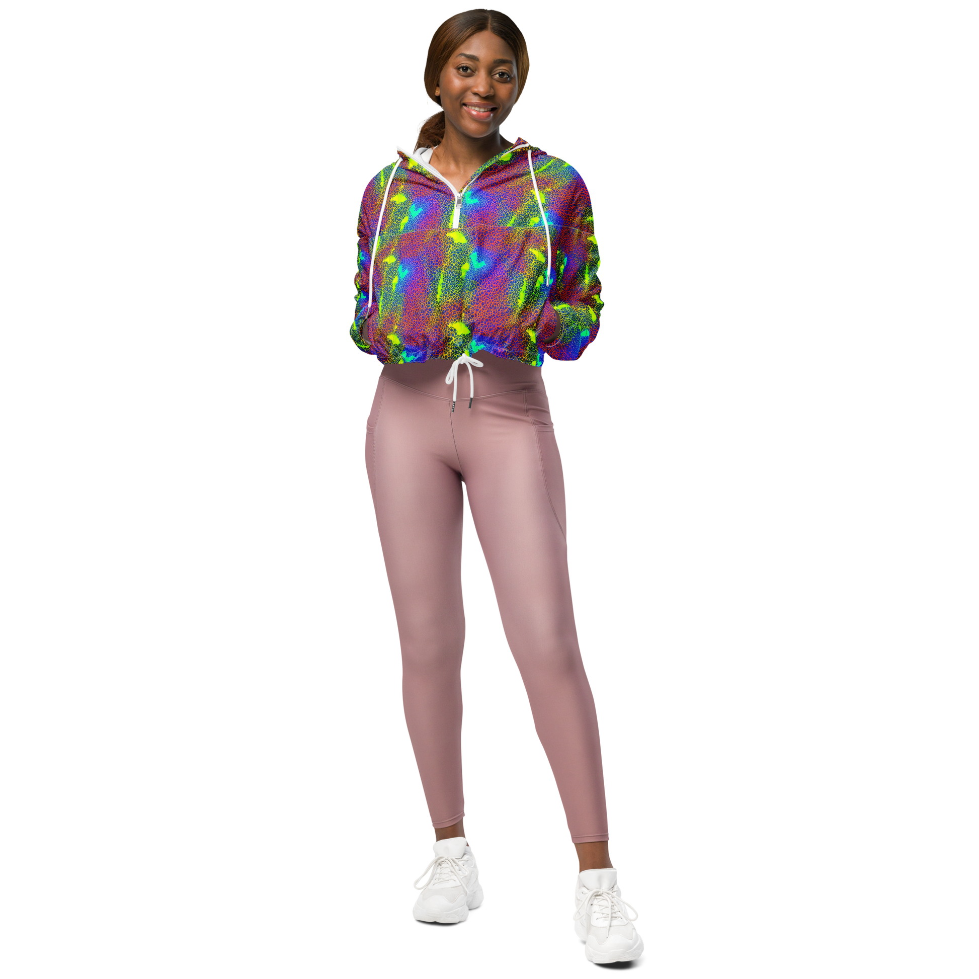 Ignite your wardrobe with the electrifying vibrancy of our latest cropped windbreaker, featuring a mesmerizing interplay of neon blues, yellows, and greens set against a rich red-orange backdrop. This piece is a visual symphony of interlocking shapes that brings the essence of a psychedelic cellular kaleidoscope to life. Tailored for the audacious spirit, it's the ultimate expression for those who command attention at every turn, from pulsating music festivals to lively summer soirées.