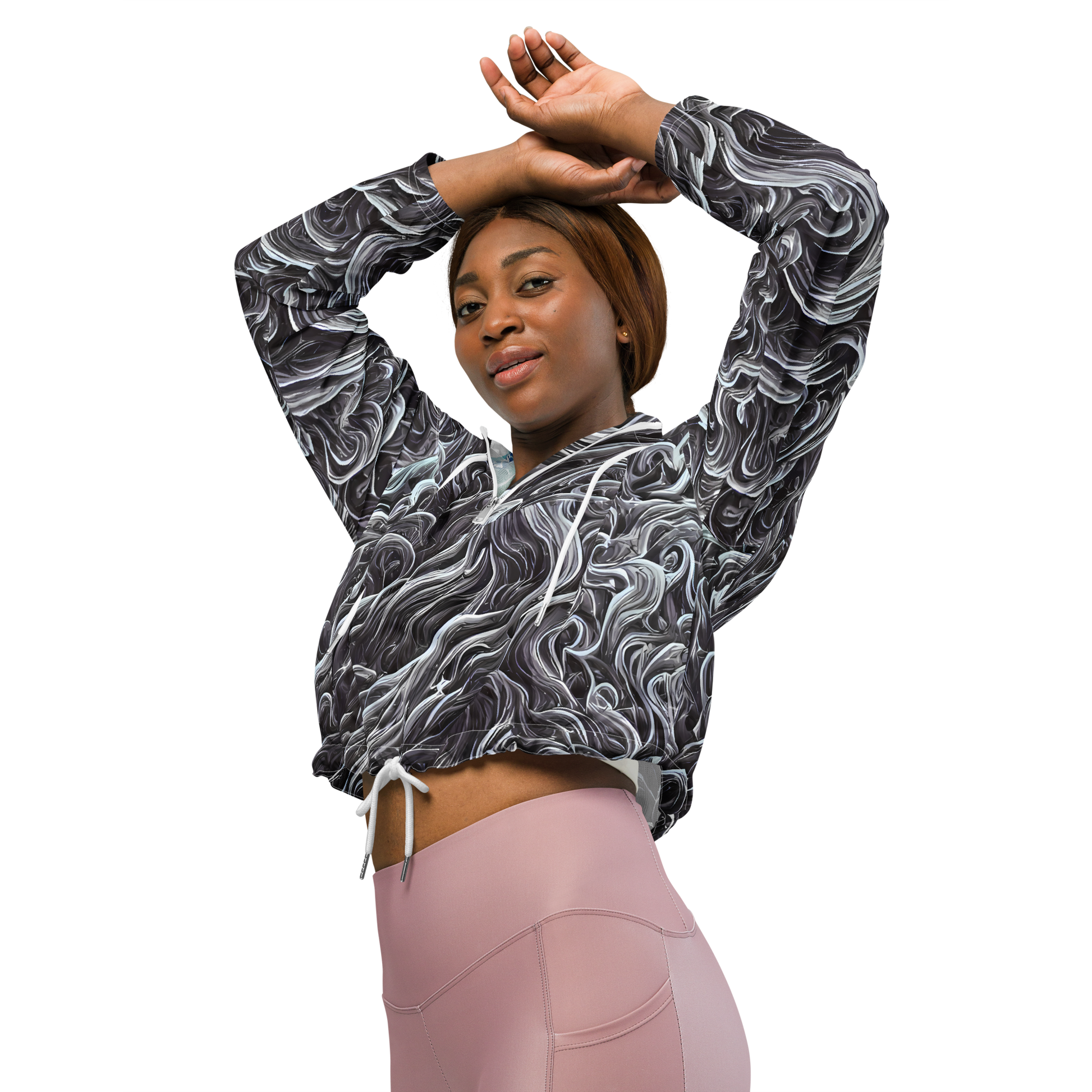 Wrap yourself in the essence of autumnal artistry with our latest Women's Cropped Windbreaker. Draped in a captivating design, this piece features fluid, organic lines in soothing shades of cool grey and soft white, reminiscent of the emotional landscapes painted by a master of the sublime. The dreamlike quality of its dynamic pattern adds a touch of elegance and introspection, making it the perfect companion for creative events or casual chic gatherings.