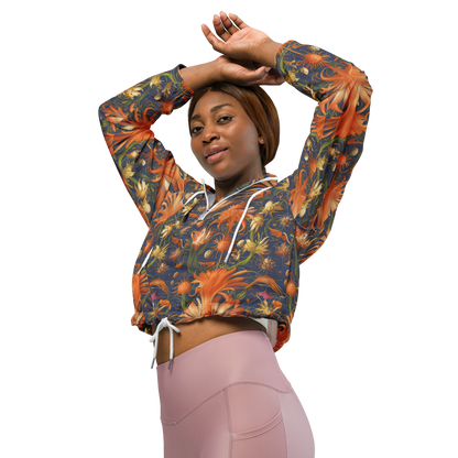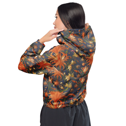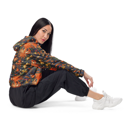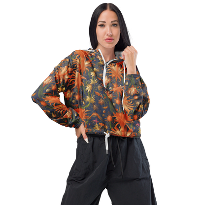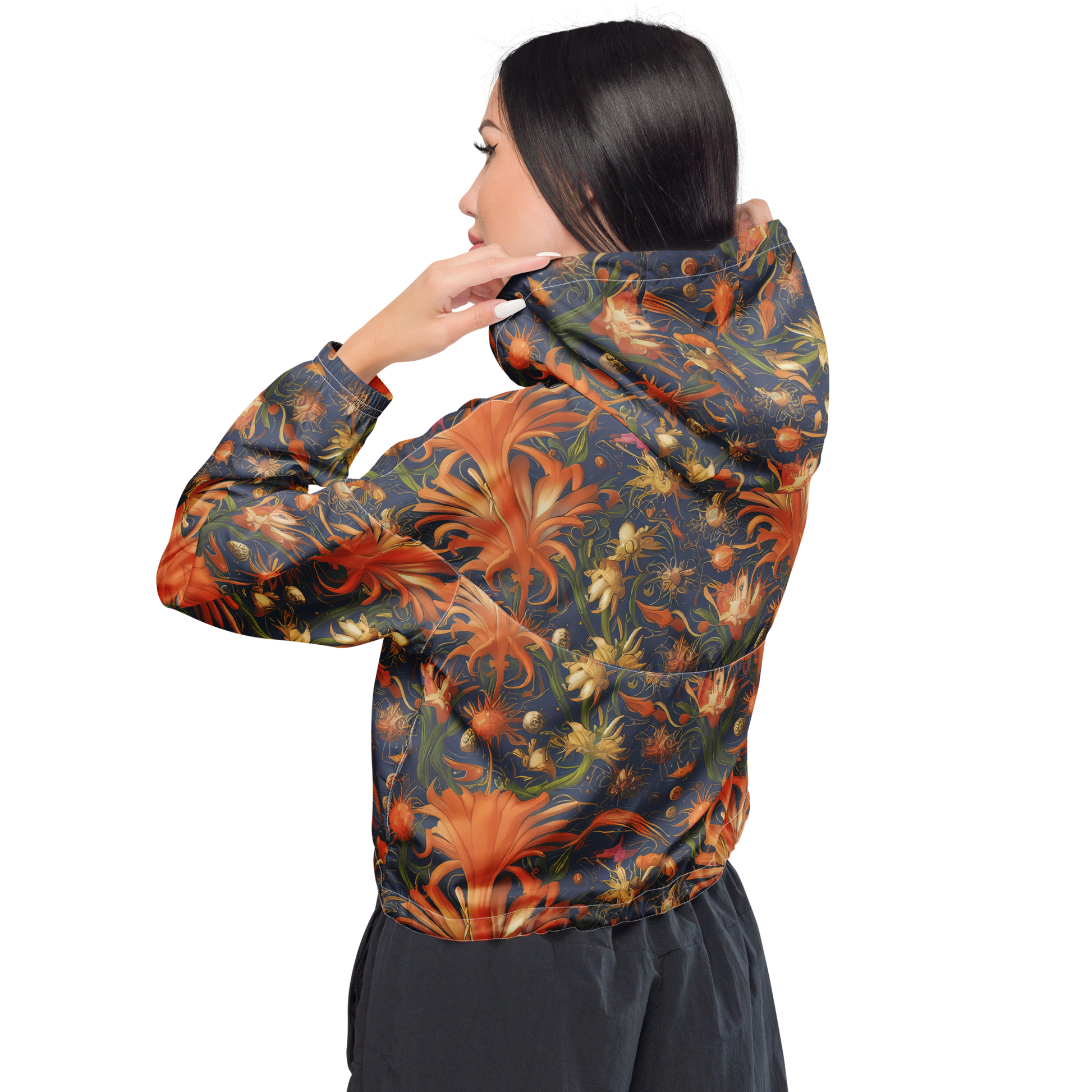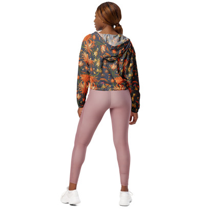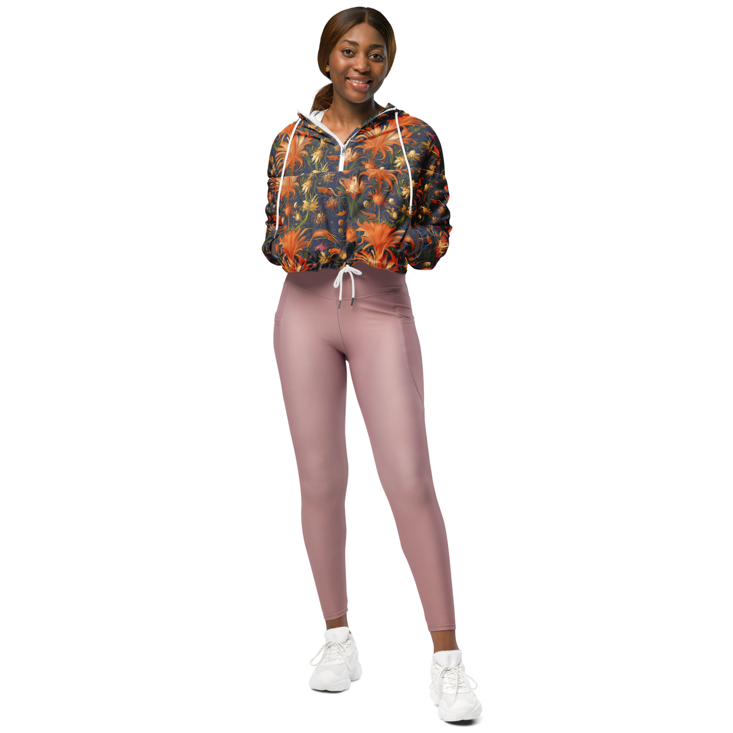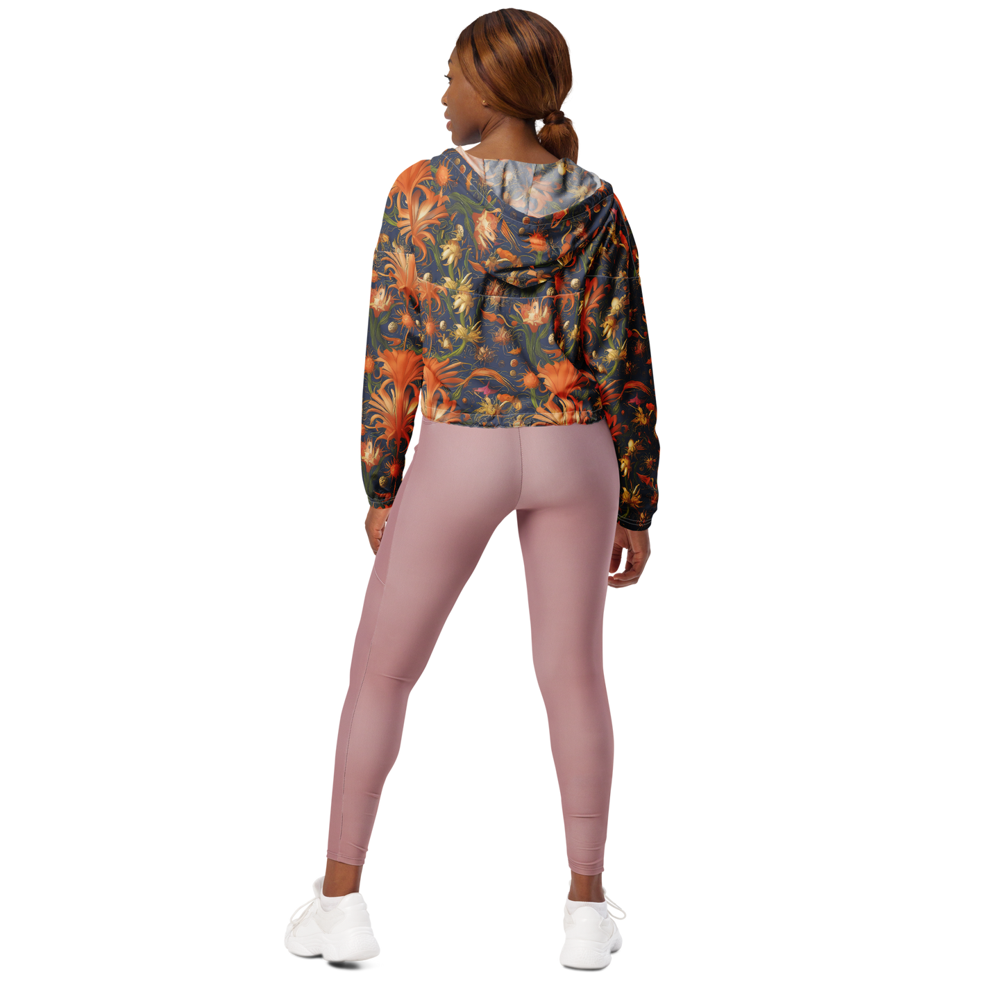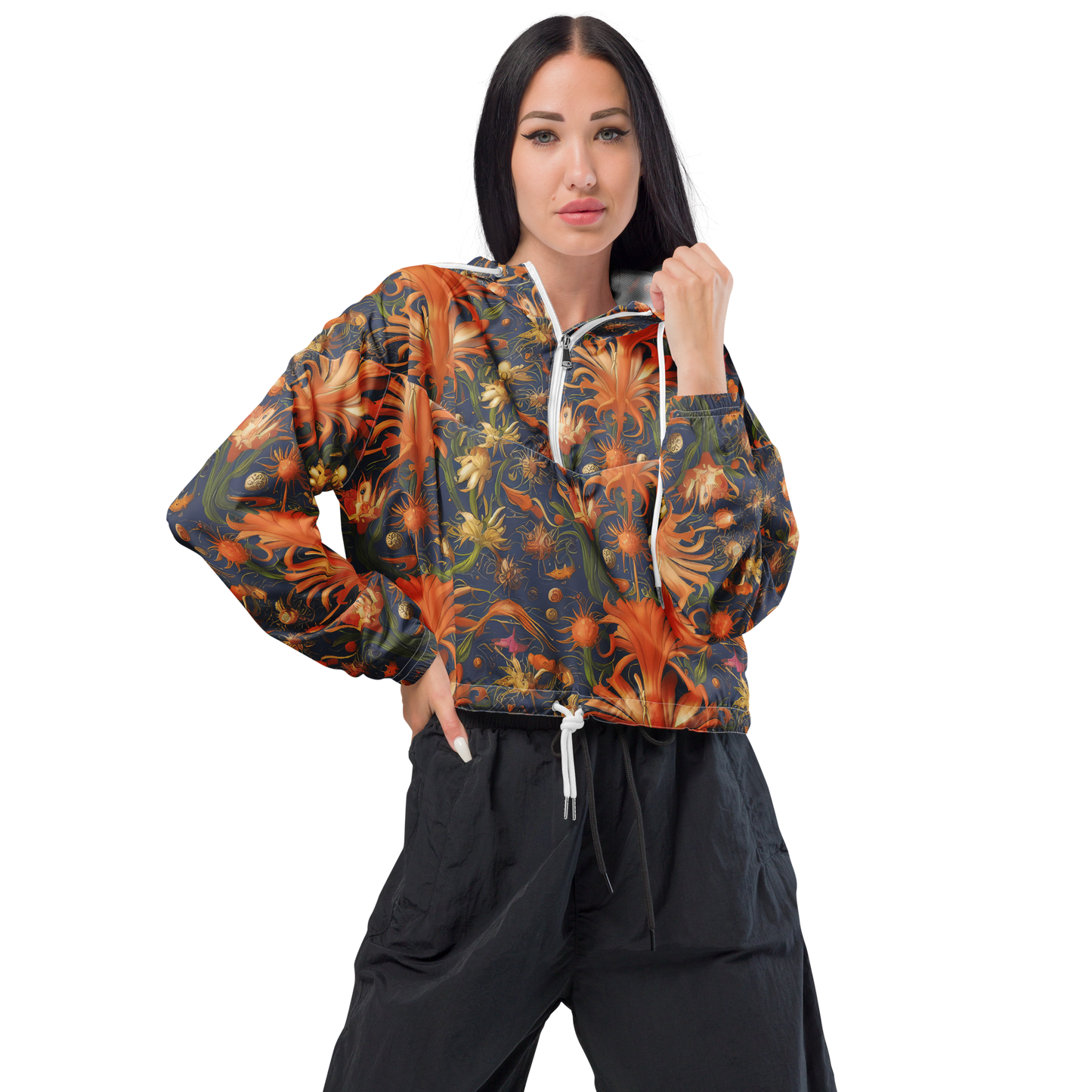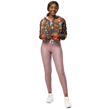 Wrap yourself in the celestial charm of our cropped windbreaker, adorned with the "Stellar Blooms" pattern. This enchanting piece is a sartorial tribute to the night sky's splendor, featuring a vibrant tapestry of orange, yellow, and cream florals entwined with verdant greenery on a deep blue canvas. Perfect for art enthusiasts and stargazers alike, it's your go-to layer for spring flings or autumnal outings. Embrace the cosmos and make a statement that's as unique as the universe itself.