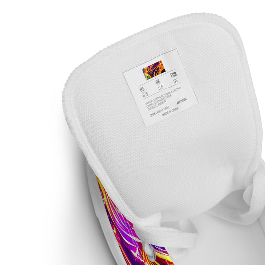 Unleash your inner dreamer with our Women's High Top Canvas Shoes, featuring an ethereal blend of deep blues, purples, and fiery oranges in fluid, swirling shapes that evoke a sense of cosmic wonder. Inspired by fantastical art, these shoes are perfect for festivals, evening events, or artistic gatherings, making a bold, mystical statement. Ideal for imaginative, free-spirited individuals, these high tops will elevate your style to otherworldly heights.