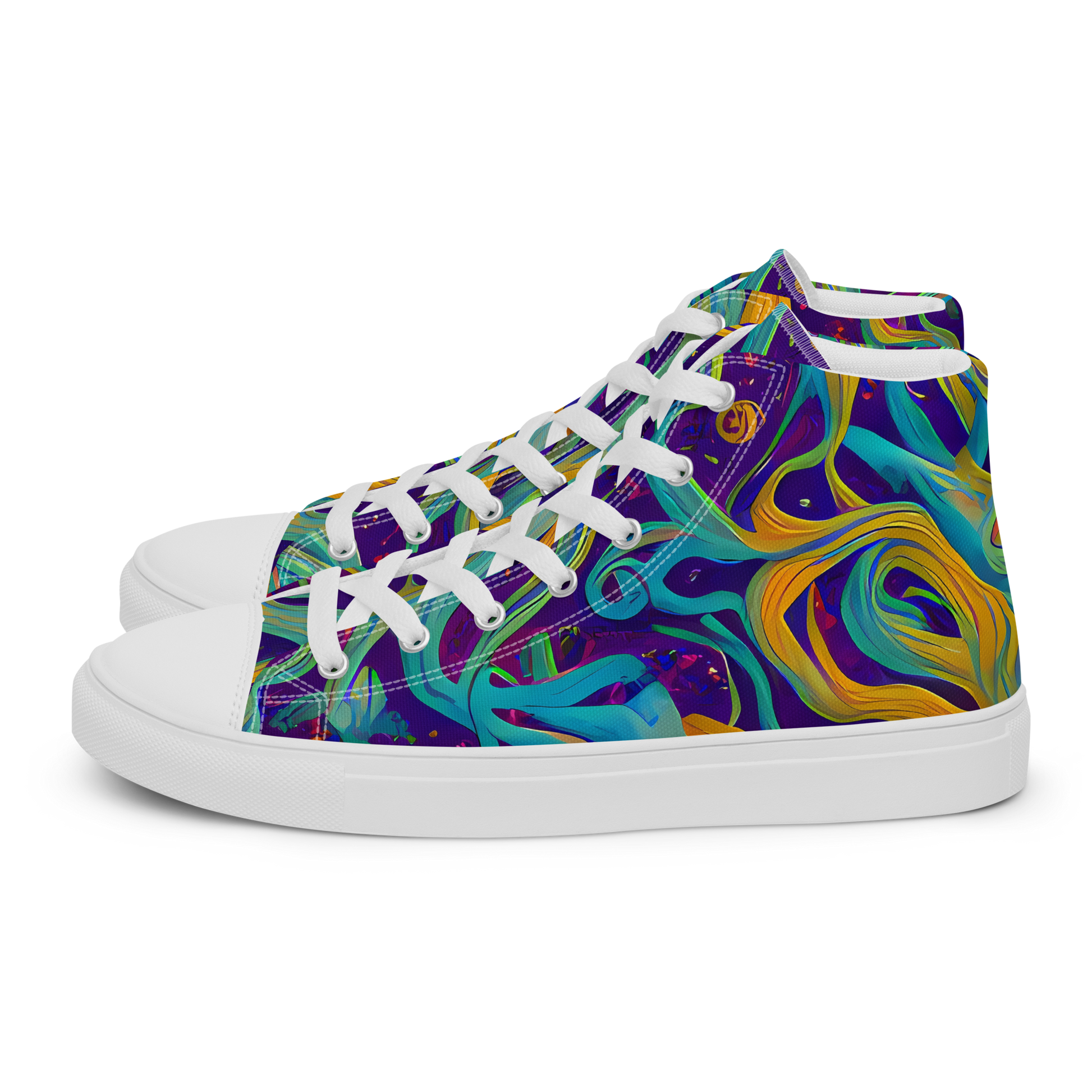 Unleash your inner artist with our Women's High Top Canvas Shoes, featuring a mesmerizing fusion of swirling teal and golden strands against a rich, cosmic purple backdrop. This intricate design conveys a dreamlike, otherworldly vibe, perfect for free-spirited, creative individuals. Ideal for artistic gatherings, gallery openings, or bohemian festivals, these shoes are a statement piece that will elevate your style in the vibrant seasons of spring and autumn.