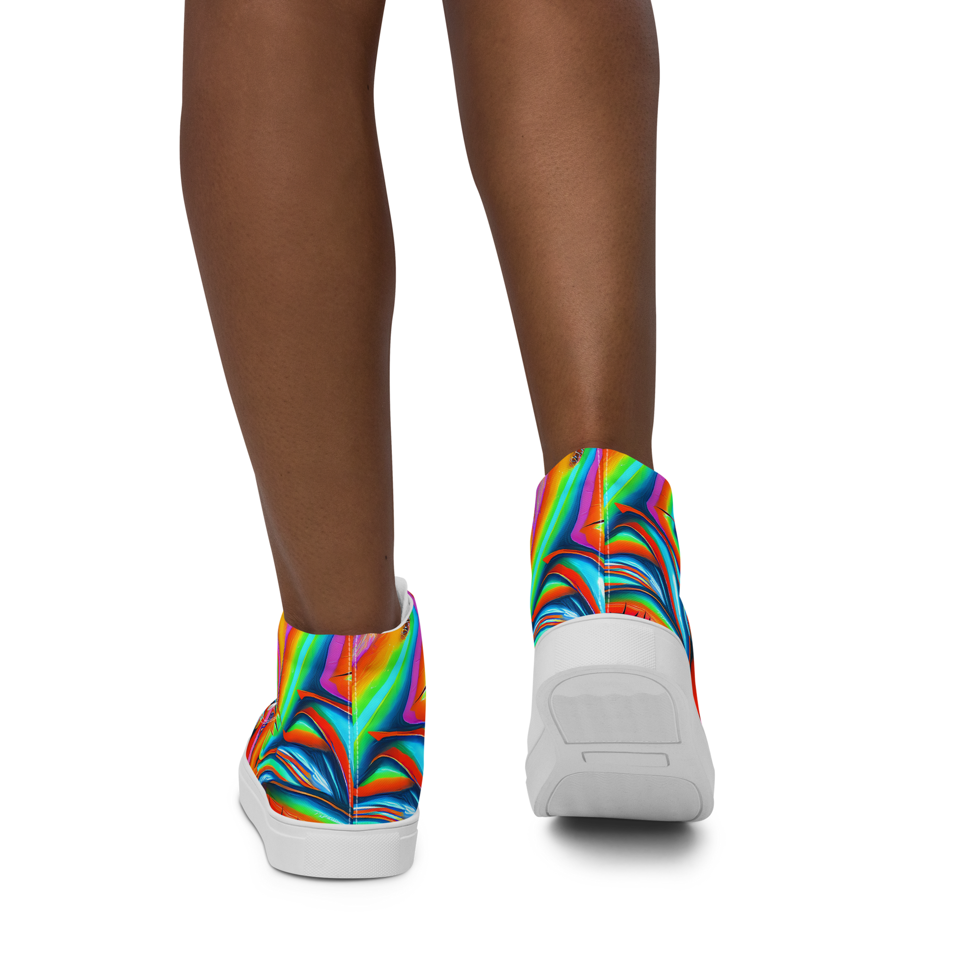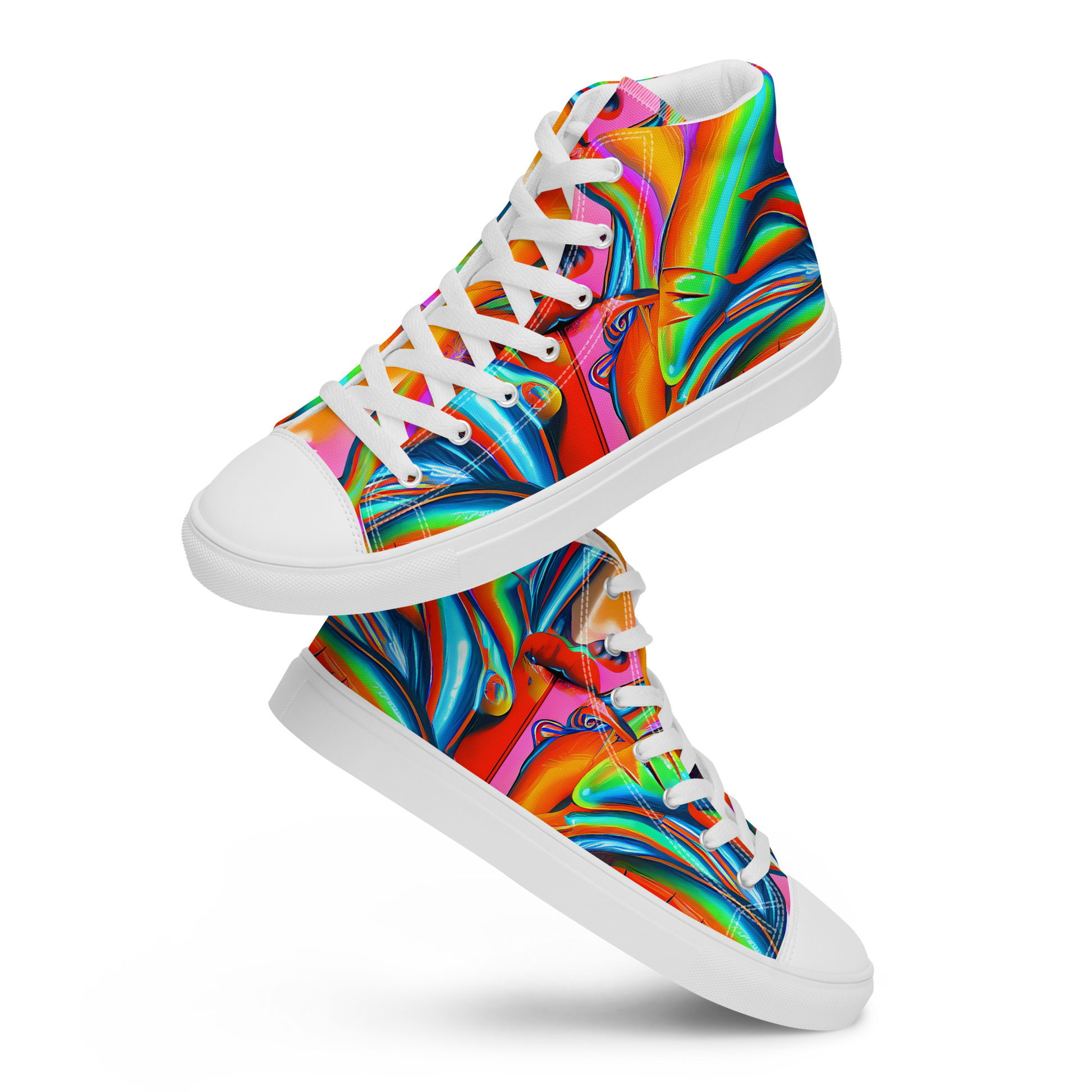 Elevate your ensemble with our mesmerizing High Top Canvas Shoes, featuring the electrifying "Kaleidovisions" design. These shoes are a canvas for your feet, showcasing a dynamic blend of electric blues, fiery oranges, and radiant greens, intermingling in a hypnotic dance. At the heart of this visual symphony, a captivating eye draws you into a world of abstract wonder, with fluid shapes that pulse with movement and life. Perfect for festival goers and art aficionados, these shoes are your ticket to standing out in the crowd this spring and summer.