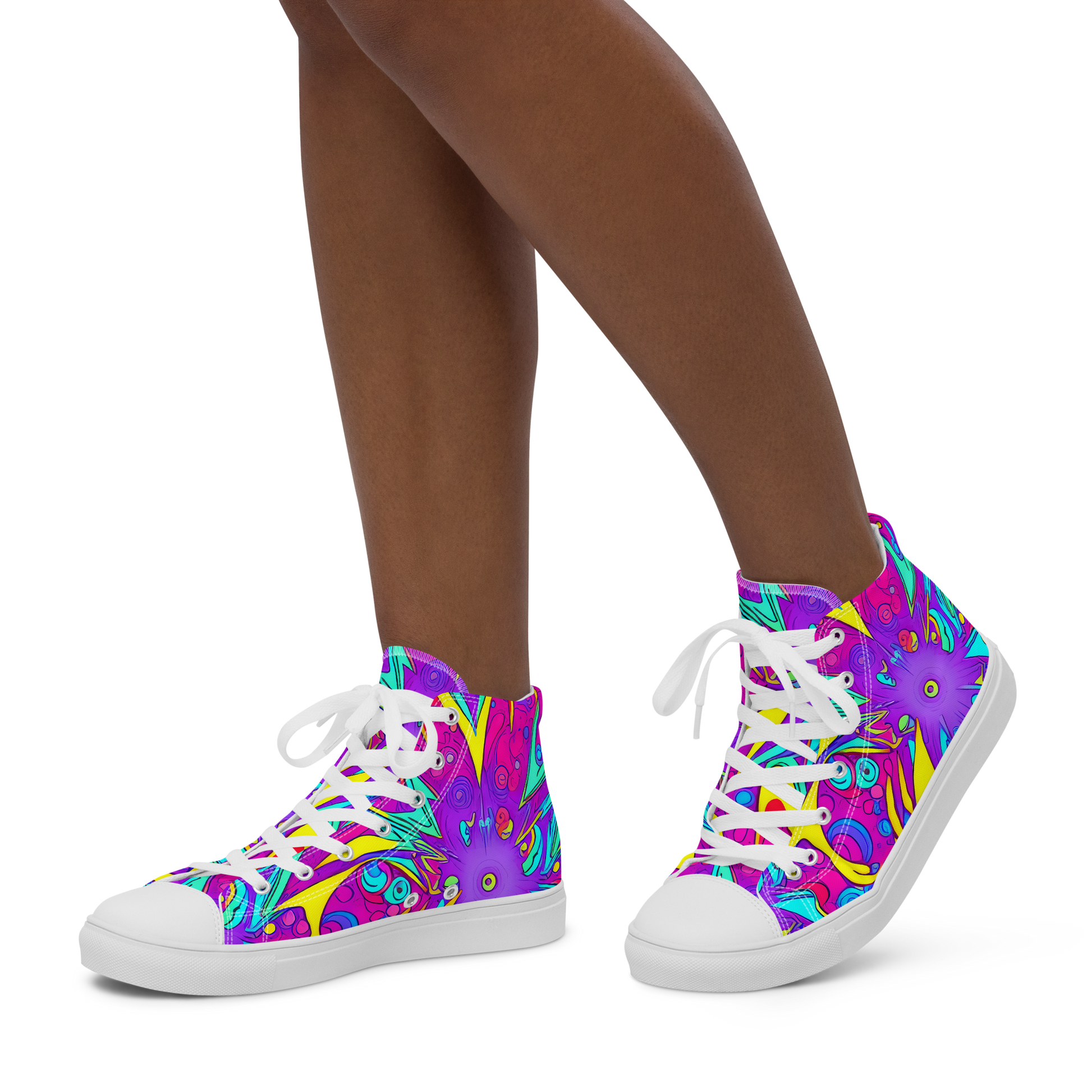 Unleash your inner cosmos with our Women's High Top Canvas Shoes, featuring a vibrant, swirling pattern of electric blue, neon yellow, and radiant magenta. Inspired by the mesmerizing expanses of deep space, these shoes are perfect for music festivals, summer gatherings, or any event celebrating creativity and individuality. Crafted to blend durability with style, they promise to keep you comfortable and chic with every step.
