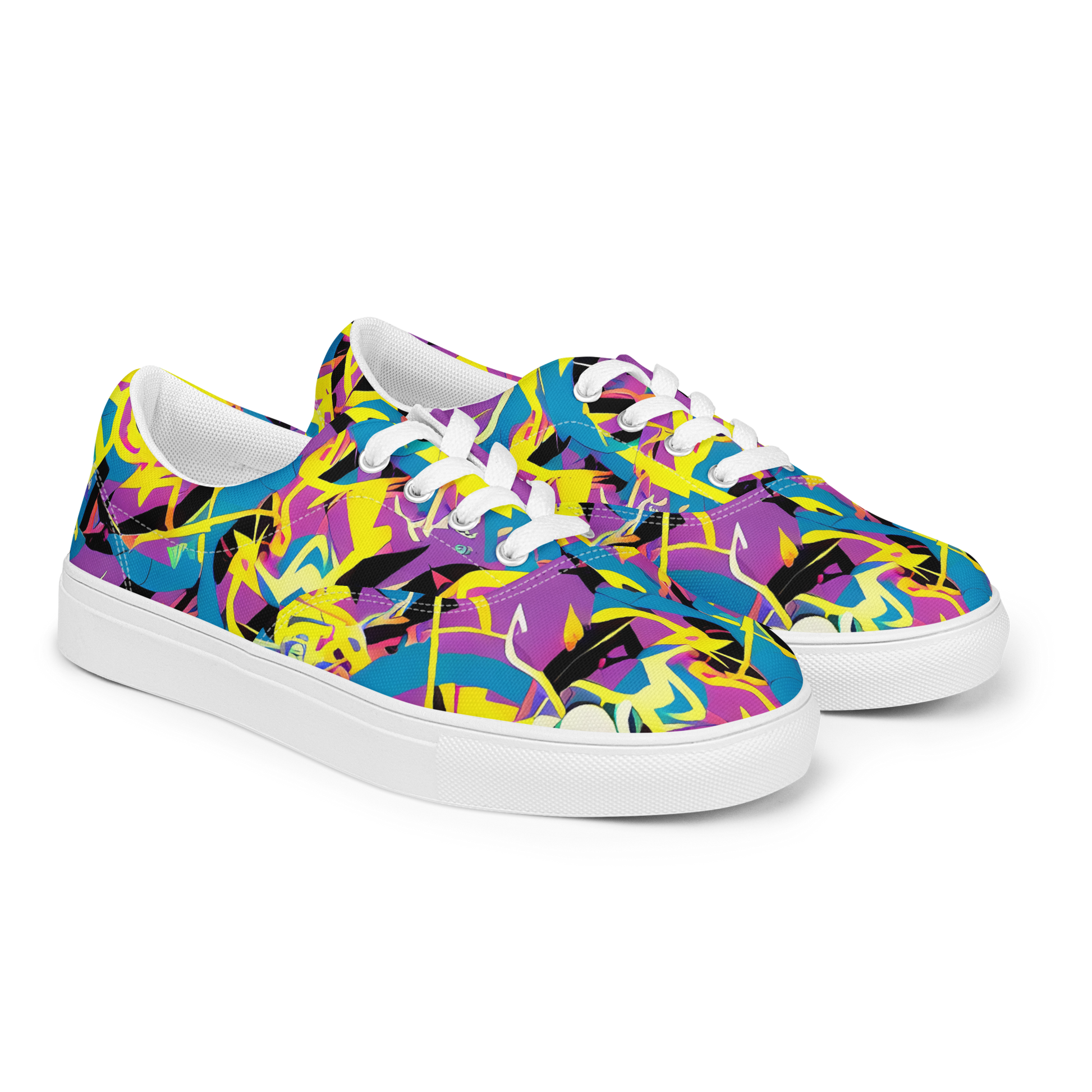 Unleash your inner cosmic adventurer with our stunning women's lace-up canvas sneakers featuring the "Galactic Sprawl" pattern! This vibrant explosion of electric blue, neon yellow, and deep purple, accented with dynamic black swirls, transforms your footwear into a bold statement piece. Perfect for music festivals, art events, or simply adding a splash of daring style to your everyday look, these shoes are as unique as your personality!