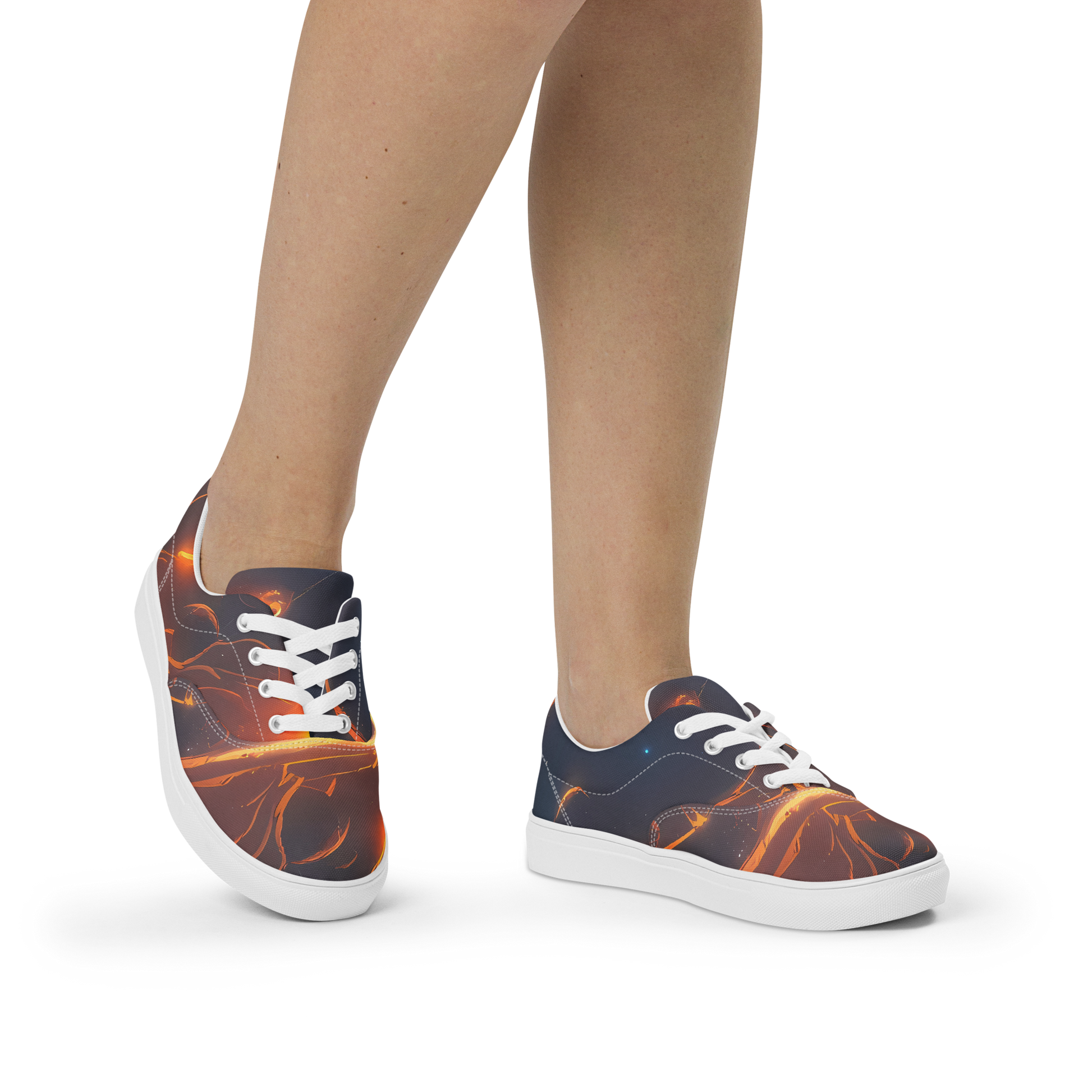 Ignite your wardrobe with our exclusive women's lace-up canvas sneakers, featuring the mesmerizing "Inferno Spirals" design. Wrap your feet in the warmth of vibrant orange and the depth of night-sky blue, masterfully swirled together to capture the essence of a fiery blaze dancing under a tranquil celestial dome. These sneakers are not just footwear; they are a wearable piece of art that embodies the spirit of autumnal revelry and the boldness of those who dare to stand out. Inspired by the dramatic contrasts in the art world, they offer a perfect blend of passion and poise for your every stride.