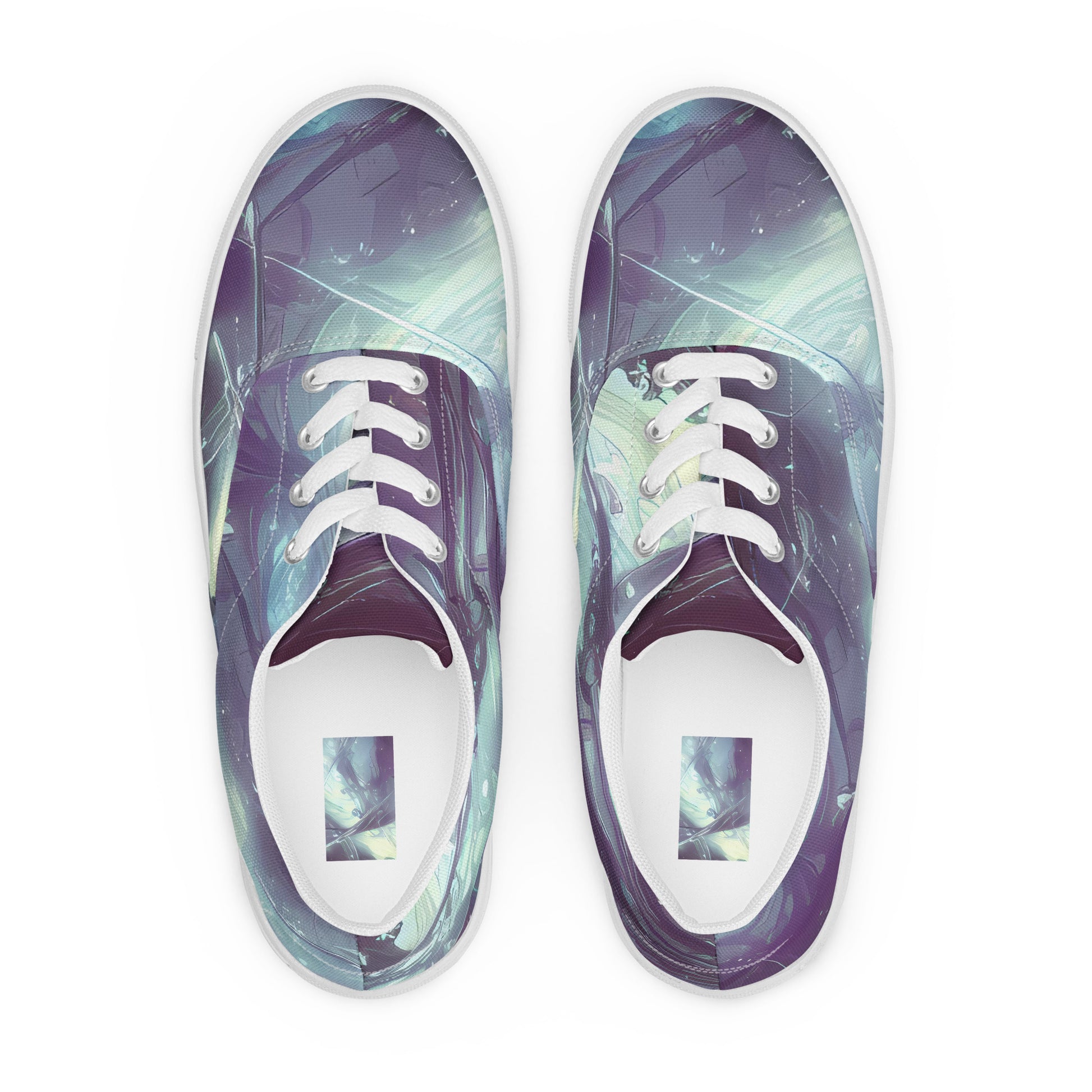 Step into a realm of futuristic elegance with our Women's Lace-Up Canvas Sneakers, featuring the mesmerizing "Nihei Shimmer" pattern. This exclusive design fuses abstract, cybernetic lines with ethereal landscapes in iridescent blues and silvers, creating a stunning visual that transcends seasons. Perfect for avant-garde events or artistic gatherings, these shoes are not just footwear; they are a statement of individuality and innovation!