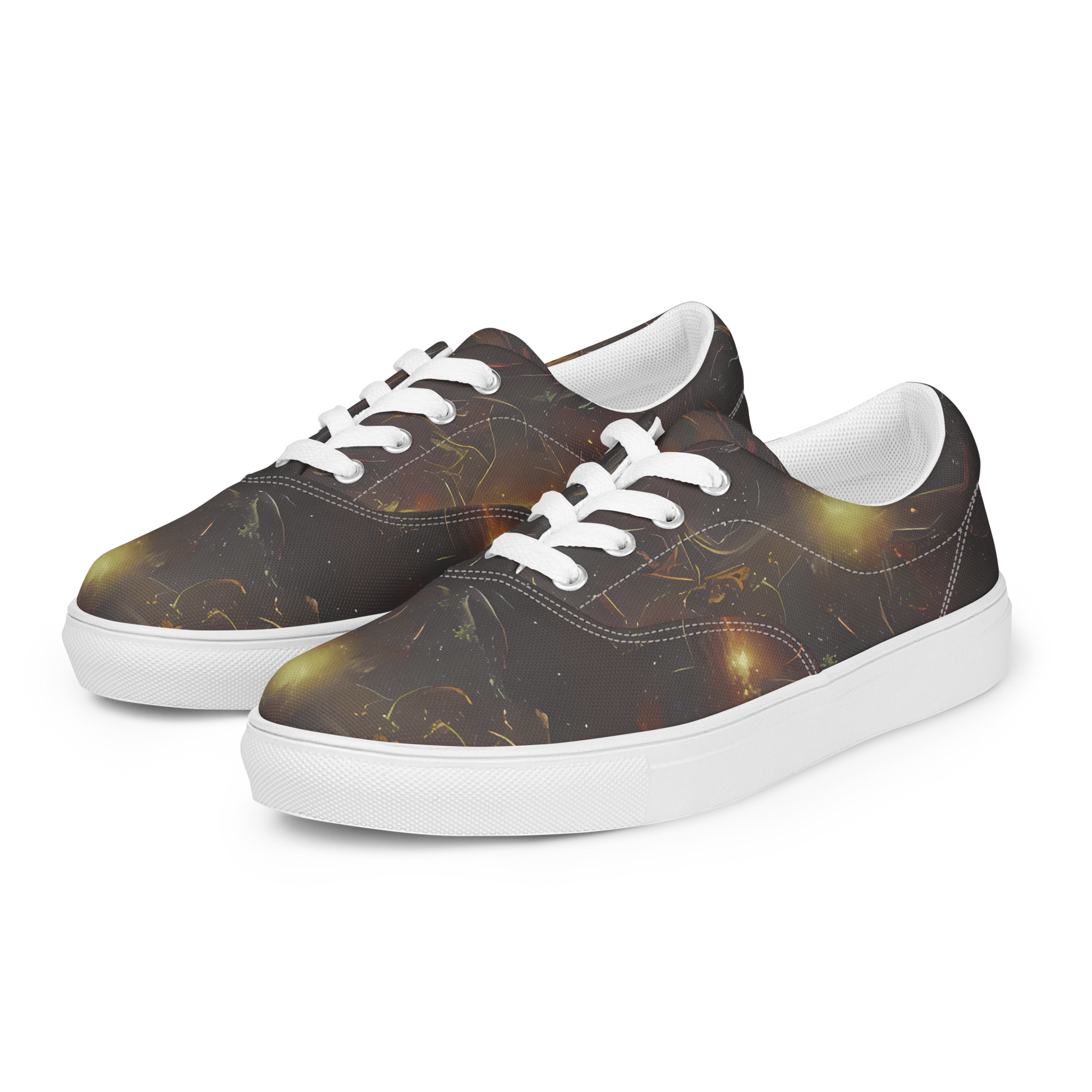 Unveil the mysteries of the universe with our Women's Lace-Up Canvas Shoes, featuring the mesmerizing "Quantum Illusions" pattern. This cosmic design, with its swirling galaxies and ethereal light, blends deep blues with fiery oranges and golds, creating an otherworldly vibe perfect for bold and imaginative personalities. These sneakers are not just a statement piece; they're a journey into the cosmos, offering durable comfort and a breathable fit for your every adventure. Elevate your style and embrace the enigmatic beauty of the universe with every step.