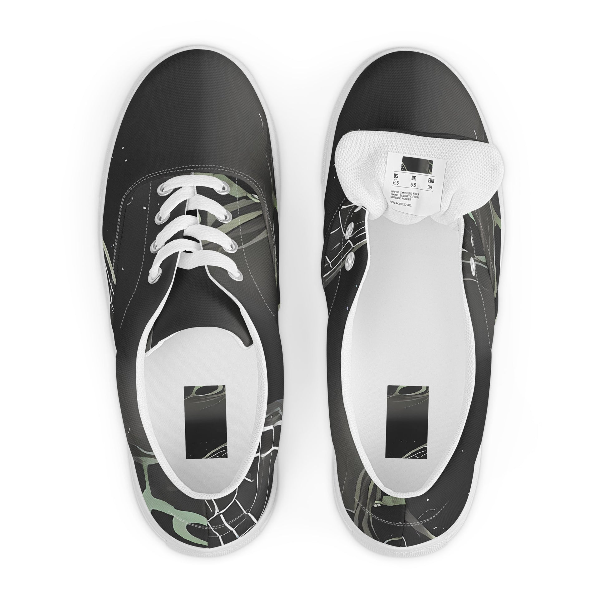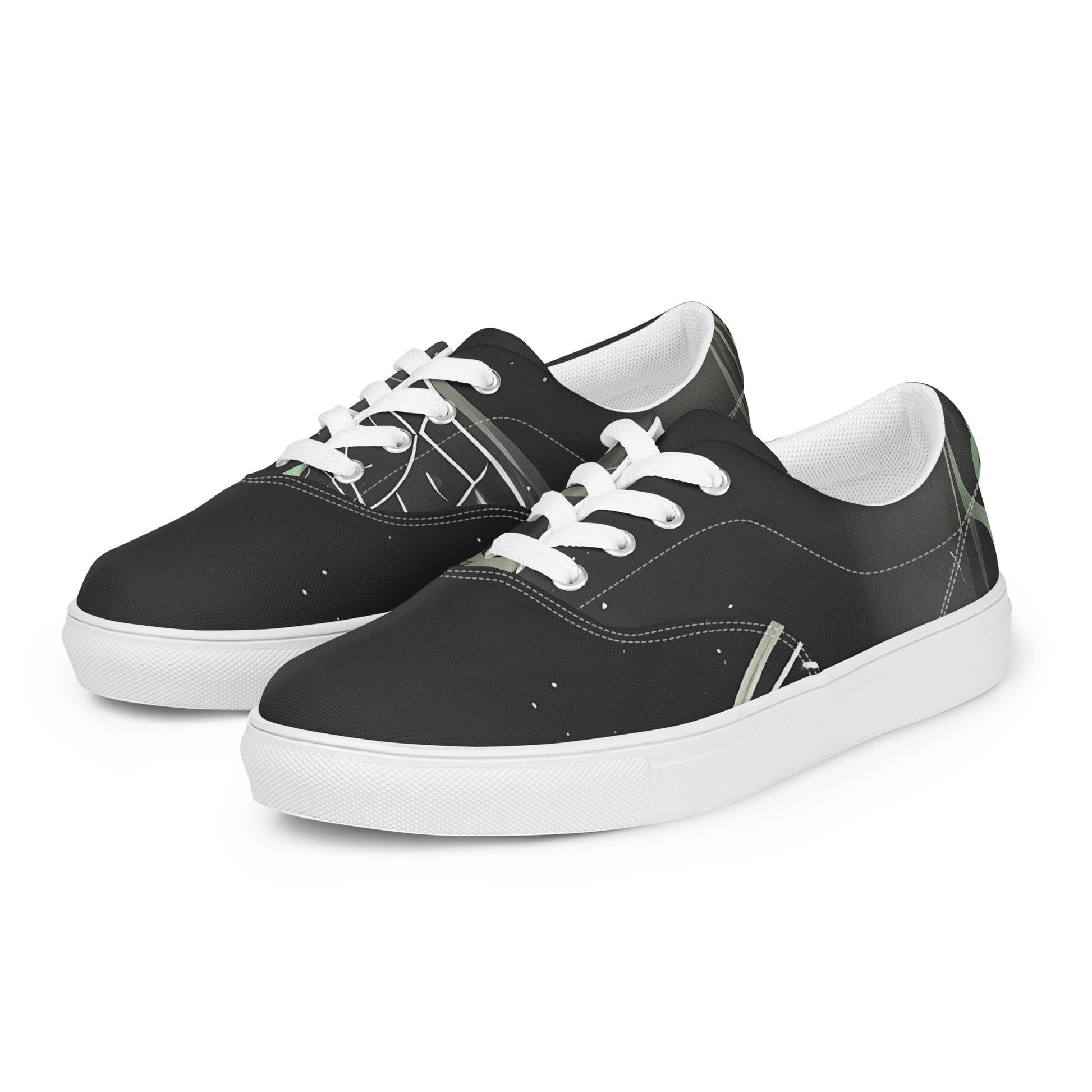 Step into a realm of artistry and elegance with our Women's Lace-Up Canvas Sneakers, featuring the captivating "Temple Drift" pattern. This unique design weaves together shadowy hues and luminous line work, embodying a fusion of cosmic mystery and timeless beauty. Perfect for autumnal gatherings or introspective winter evenings, these sneakers are not just footwear; they are a statement of individuality and style that whispers tales of the ethereal.