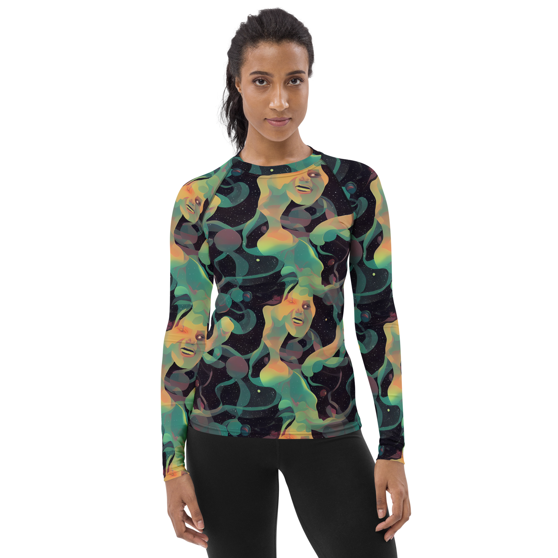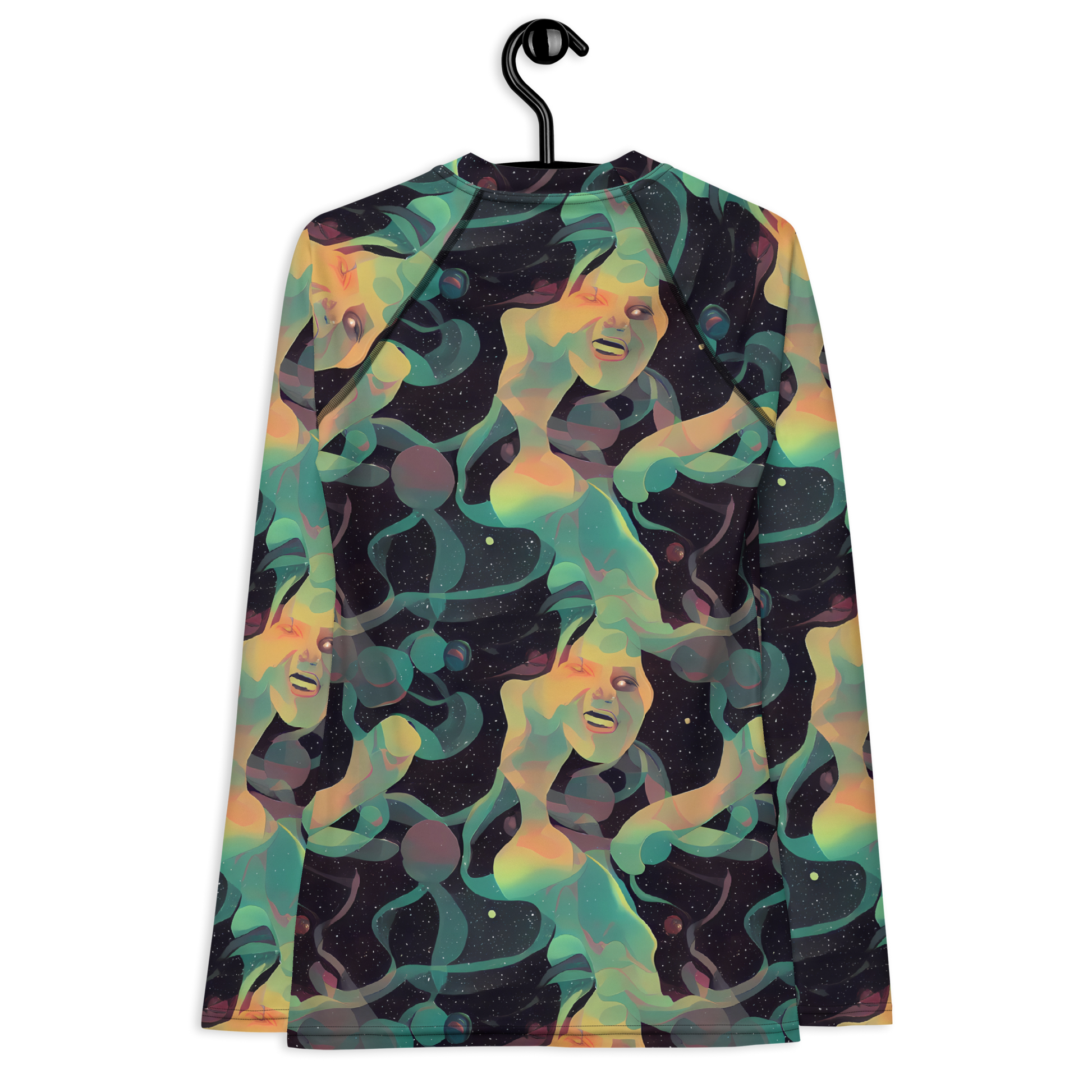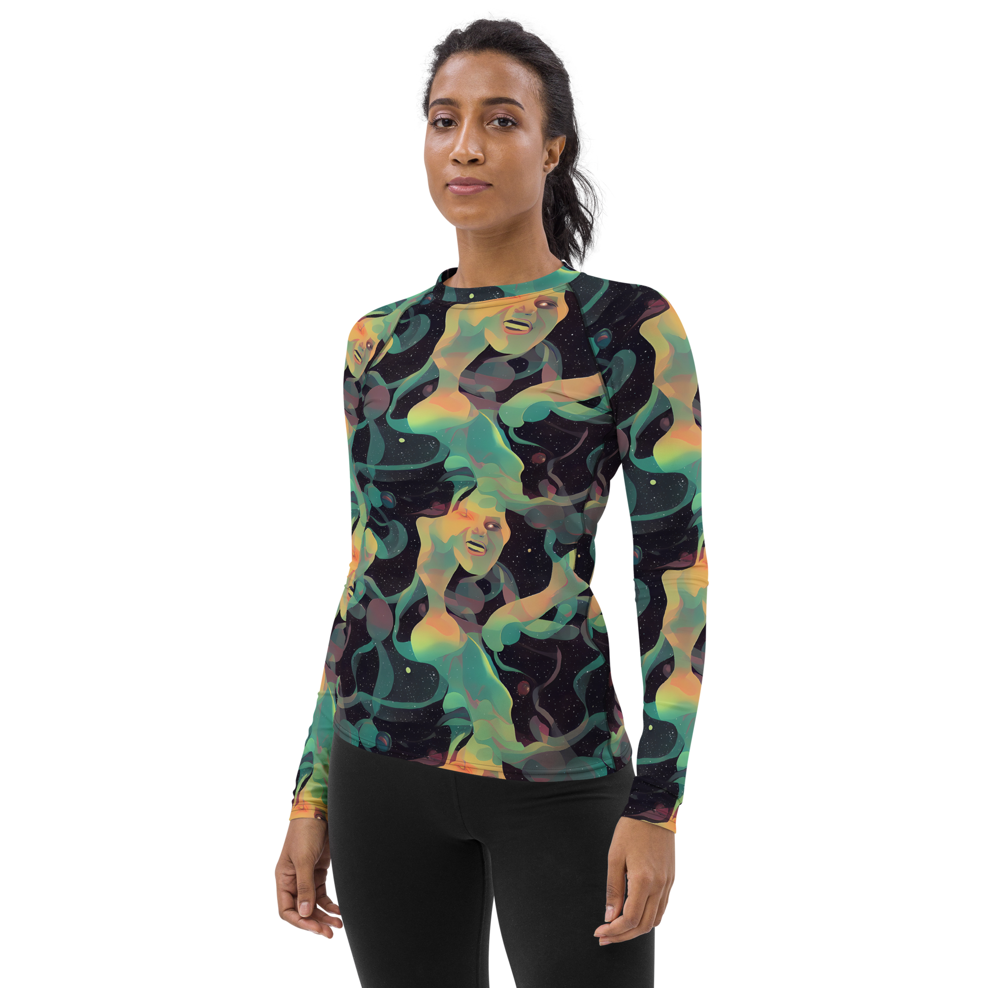 Unveil your adventurous spirit with our Women's Rash Guard, featuring a mesmerizing blend of swirling nebulae and ethereal faces in vibrant hues of teal, peach, and deep space black. This unique design evokes cosmic wonder and psychedelic exploration, perfect for festival wear, artistic gatherings, or any bold self-expression event. Crafted for the imaginative and free-spirited, this rash guard is your ideal companion for spring and summer seasons.