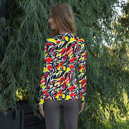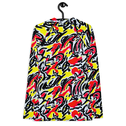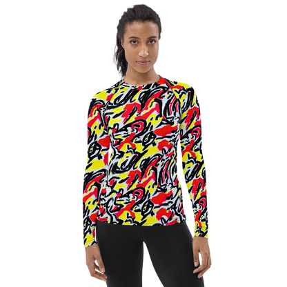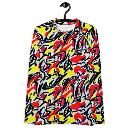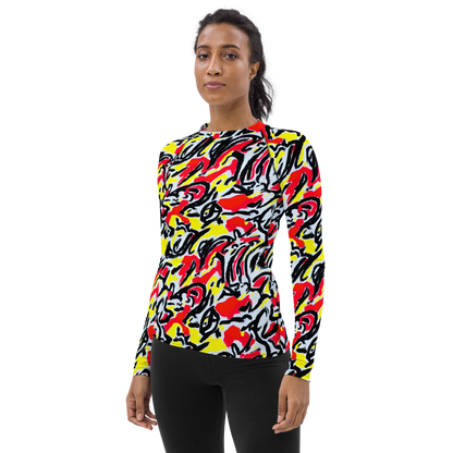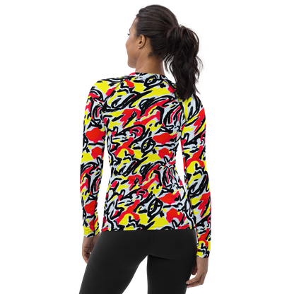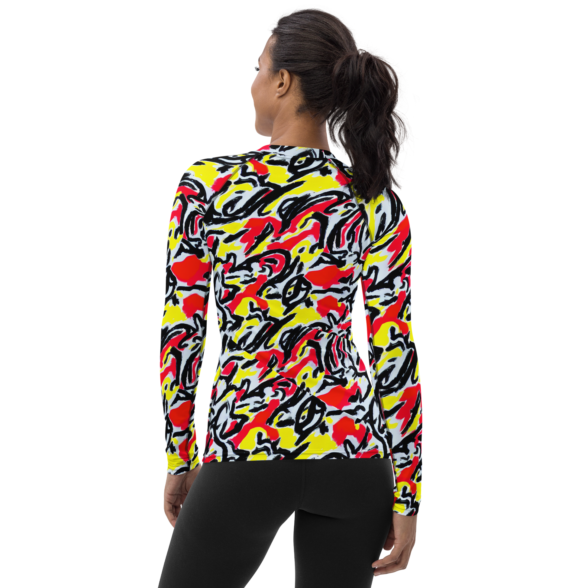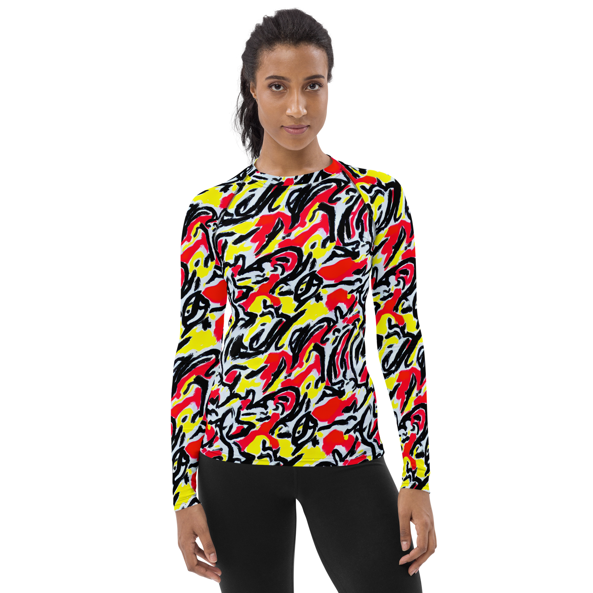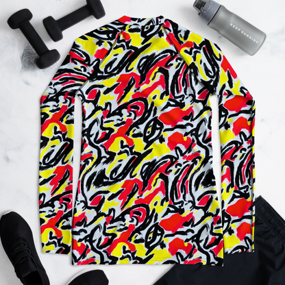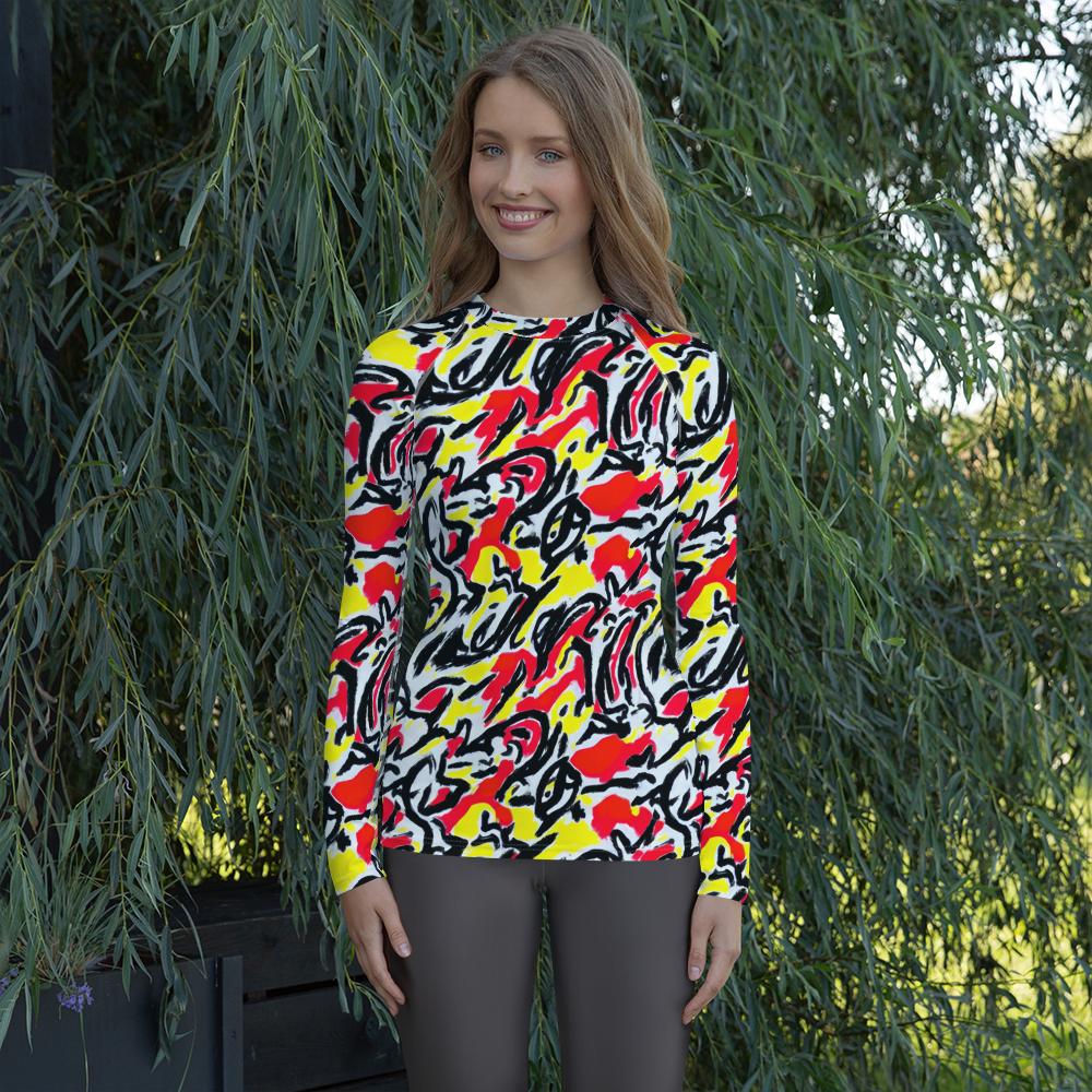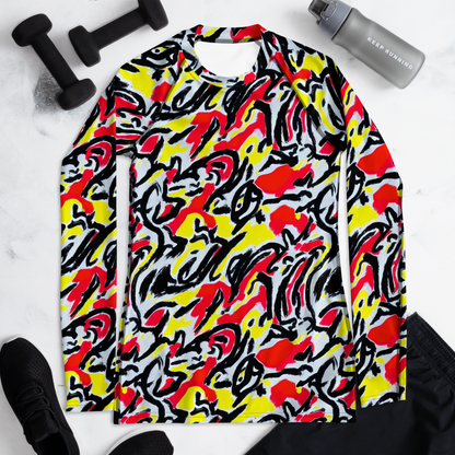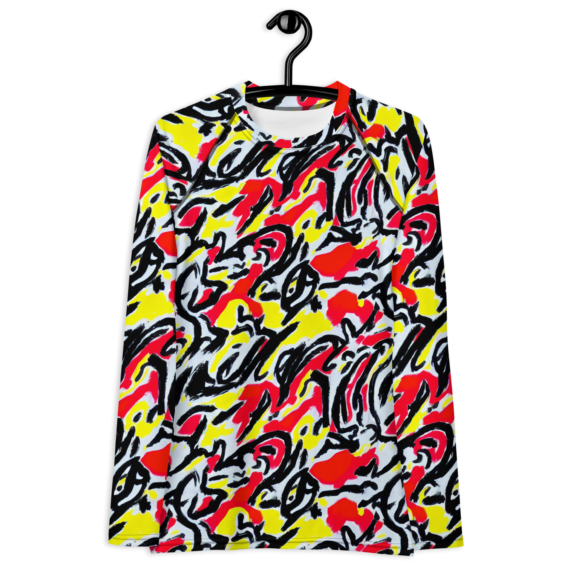 Unleash your inner artist with our long-sleeve rash guard, featuring a dynamic and bold pattern of sweeping black strokes set against a vibrant backdrop of fiery reds, sunny yellows, and stark whites. Perfect for making a statement at music festivals, art exhibitions, or vibrant summer gatherings, this rash guard is designed for those with a daring and expressive personality. Crafted with 82% polyester and 18% spandex, it offers UPF 50+ protection and a soft, stretchy fit, ensuring you stay sun-safe and comfortable during all your adventures.