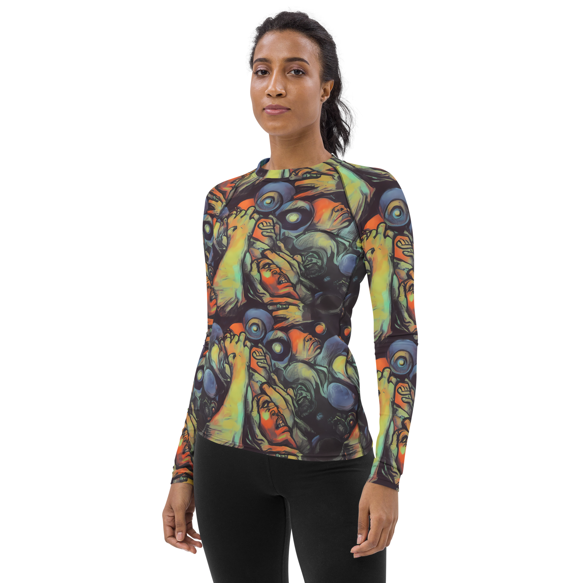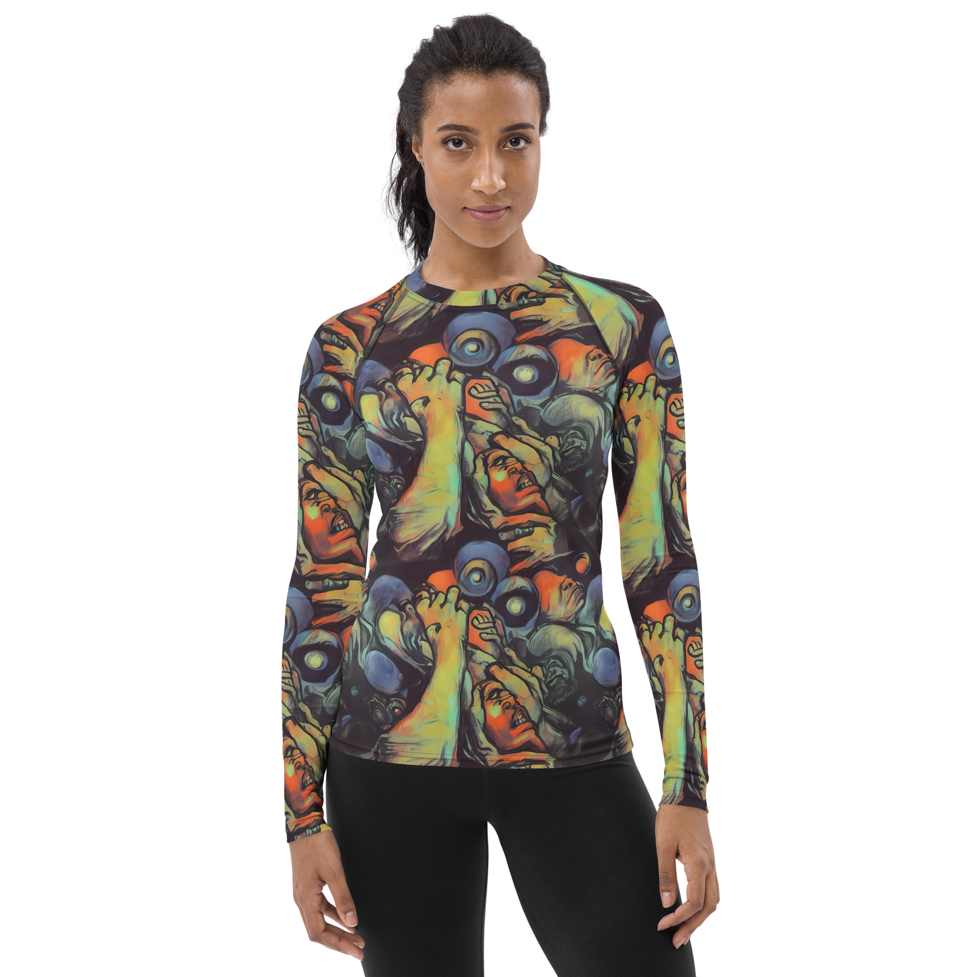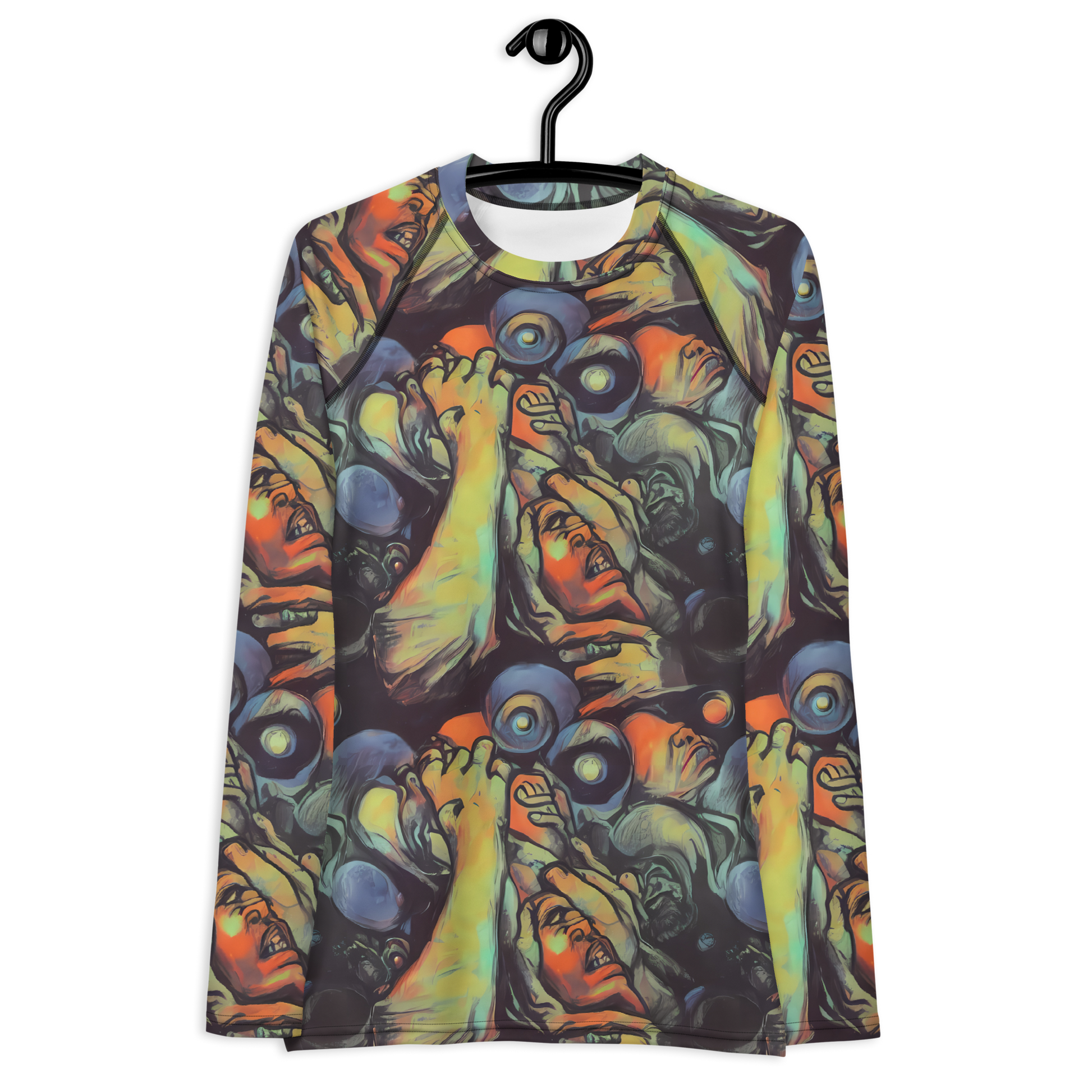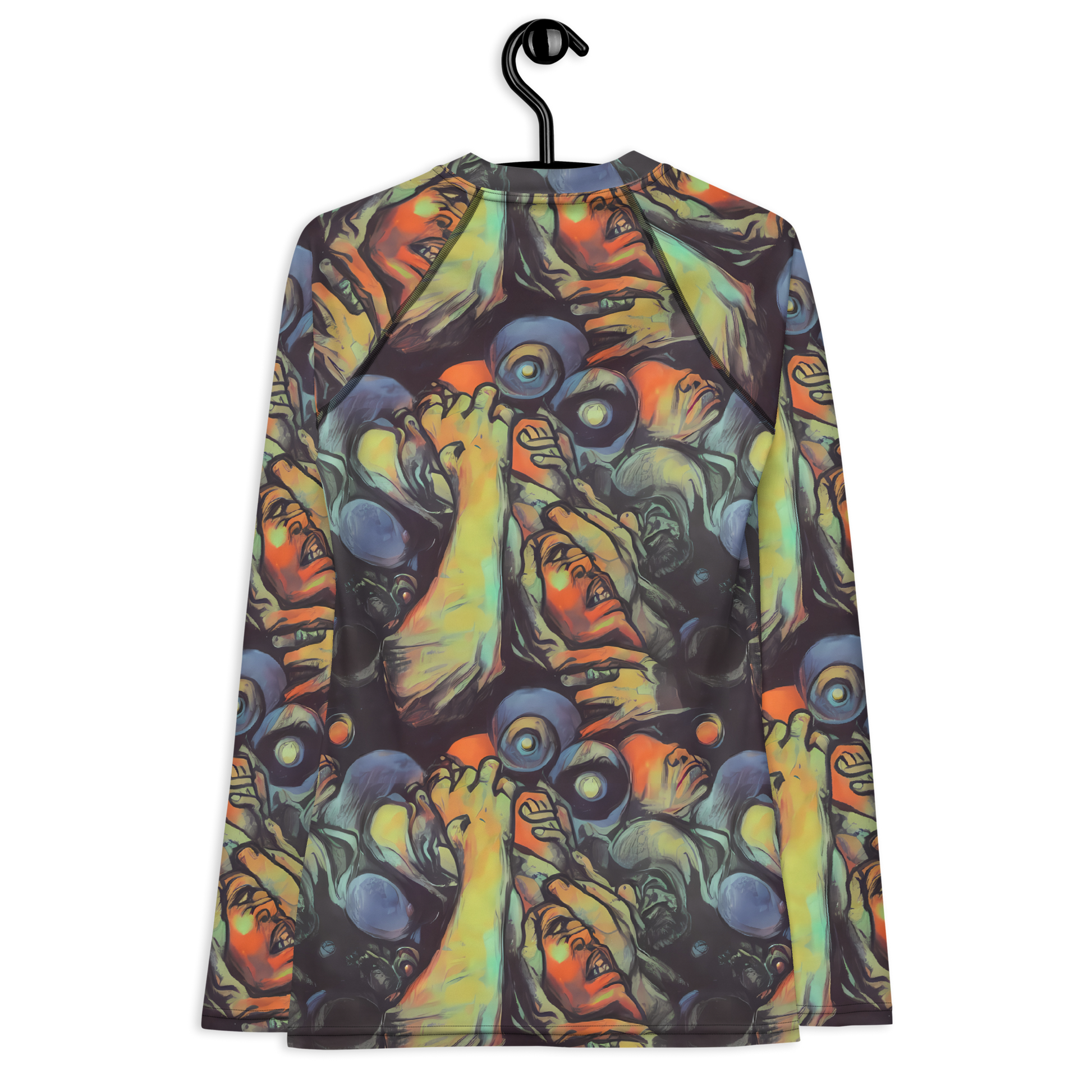 Step into a world of expressive artistry with our long-sleeve rash guard, featuring a hauntingly beautiful pattern of abstract human forms in distressed poses. Rendered in deep blacks, fiery oranges, and muted blues, this design captures emotional intensity and existential angst, perfect for those with a bold, introspective personality. Whether you're hitting the waves, exploring art exhibitions, or enjoying nighttime gatherings, this rash guard ensures you stand out with style and protection.