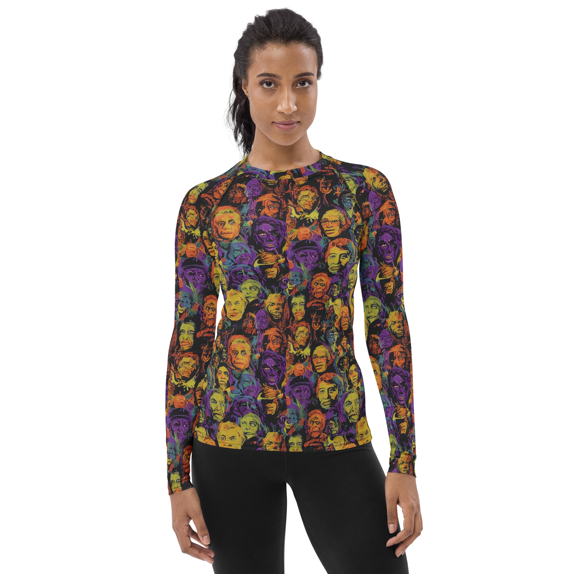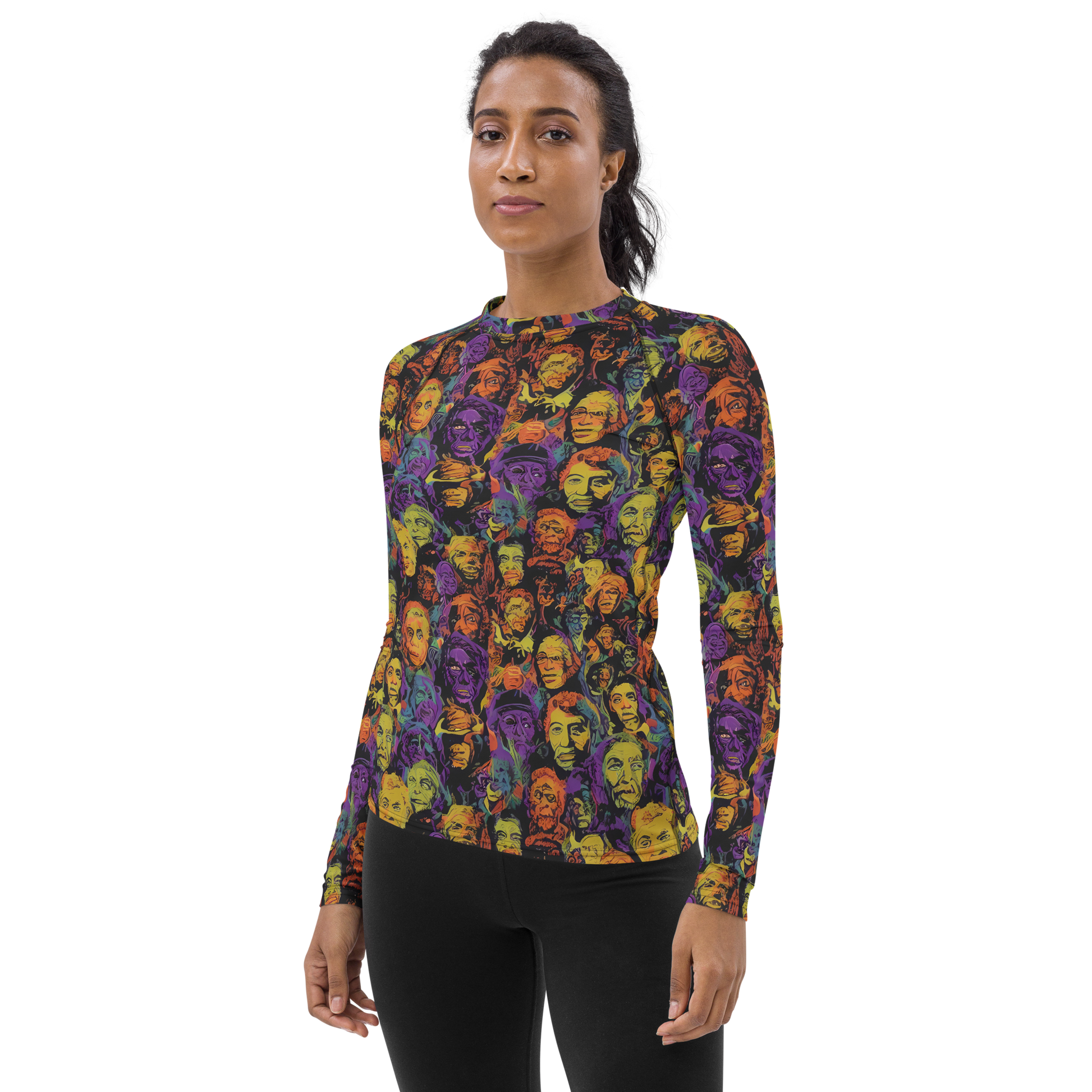 Dive into adventure with our "Kaleidoscopic Spirits" Women's Rash Guard, where vibrant artistry meets protective performance! Featuring a stunning array of swirling faces and abstract shapes in electrifying hues of purple, orange, green, and blue against a deep black backdrop, this rash guard is a celebration of individuality and charisma. Perfect for those who embrace their eccentric side, this piece not only stands out in the surf but also offers superior sun protection and comfort for all your active pursuits.