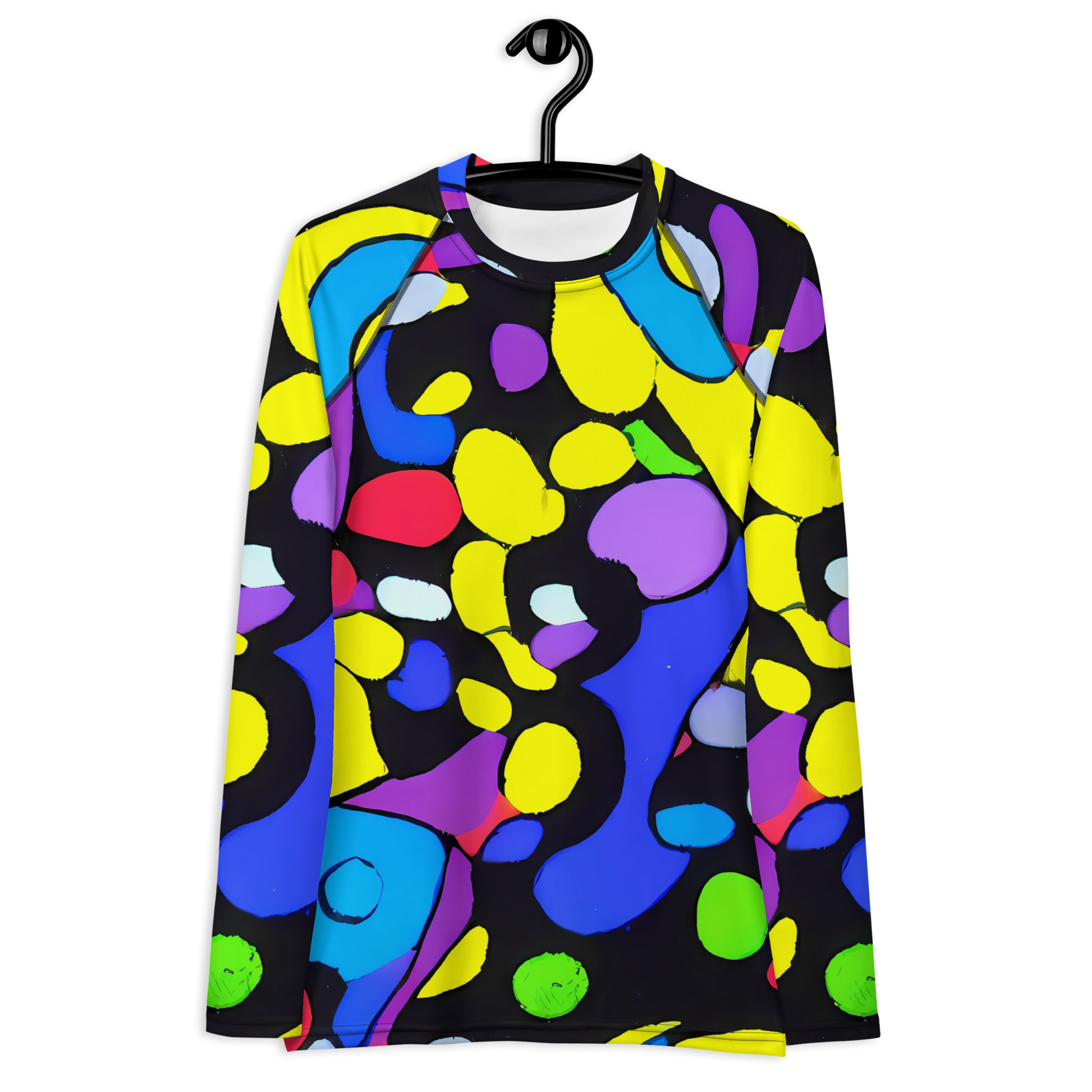 Ignite your aquatic adventures with a splash of art in our long-sleeve rash guard, adorned with a vibrant, abstract pattern that channels the spirit of playful surrealism. Wrap yourself in a canvas of primary colors, where vivid blues, reds, and yellows pirouette against a deep black backdrop, evoking a sense of joy and energy that's as infectious as it is stylish. Perfect for those who want to stand out and express their creative flair, this rash guard is your ally for making waves in any spring or summer festivity.