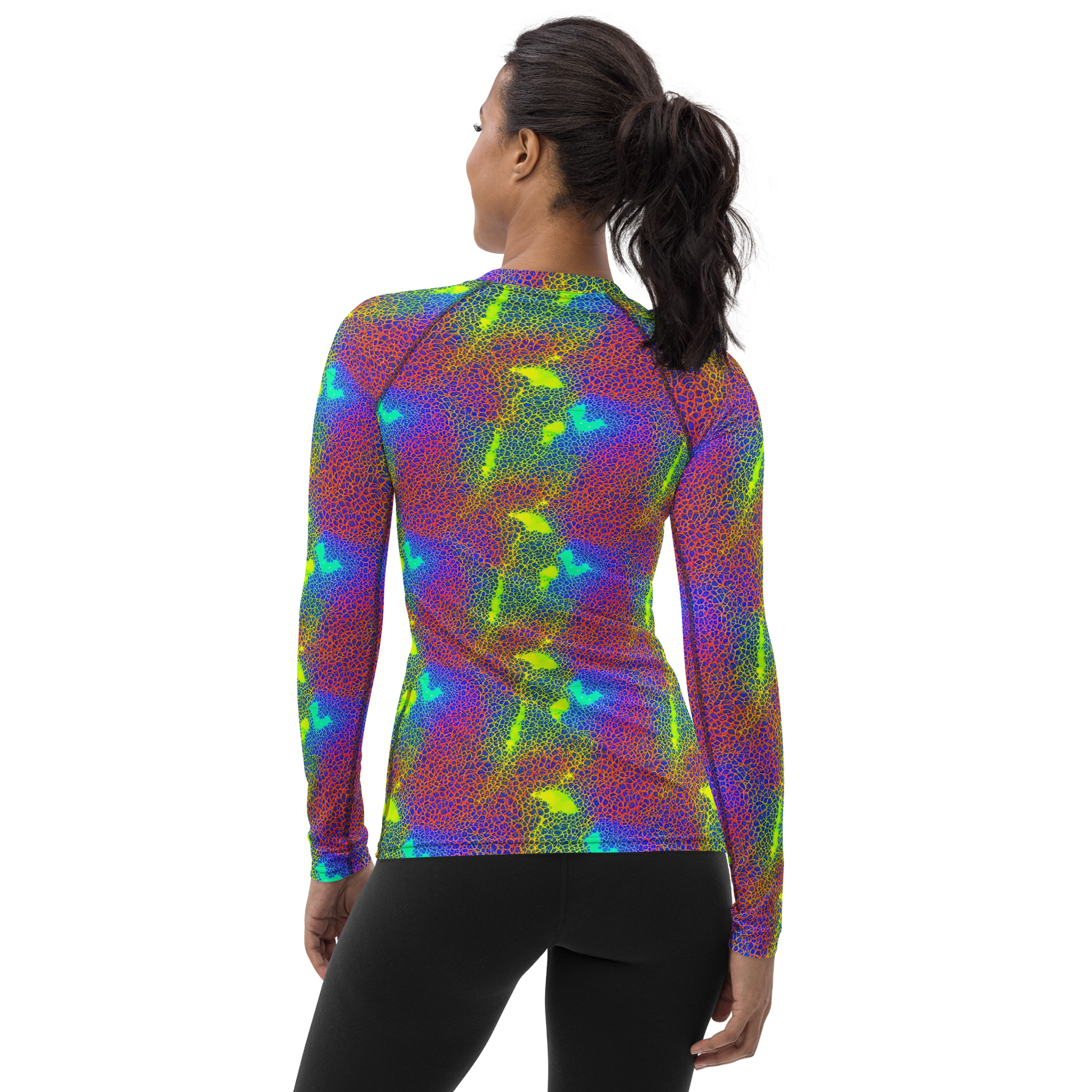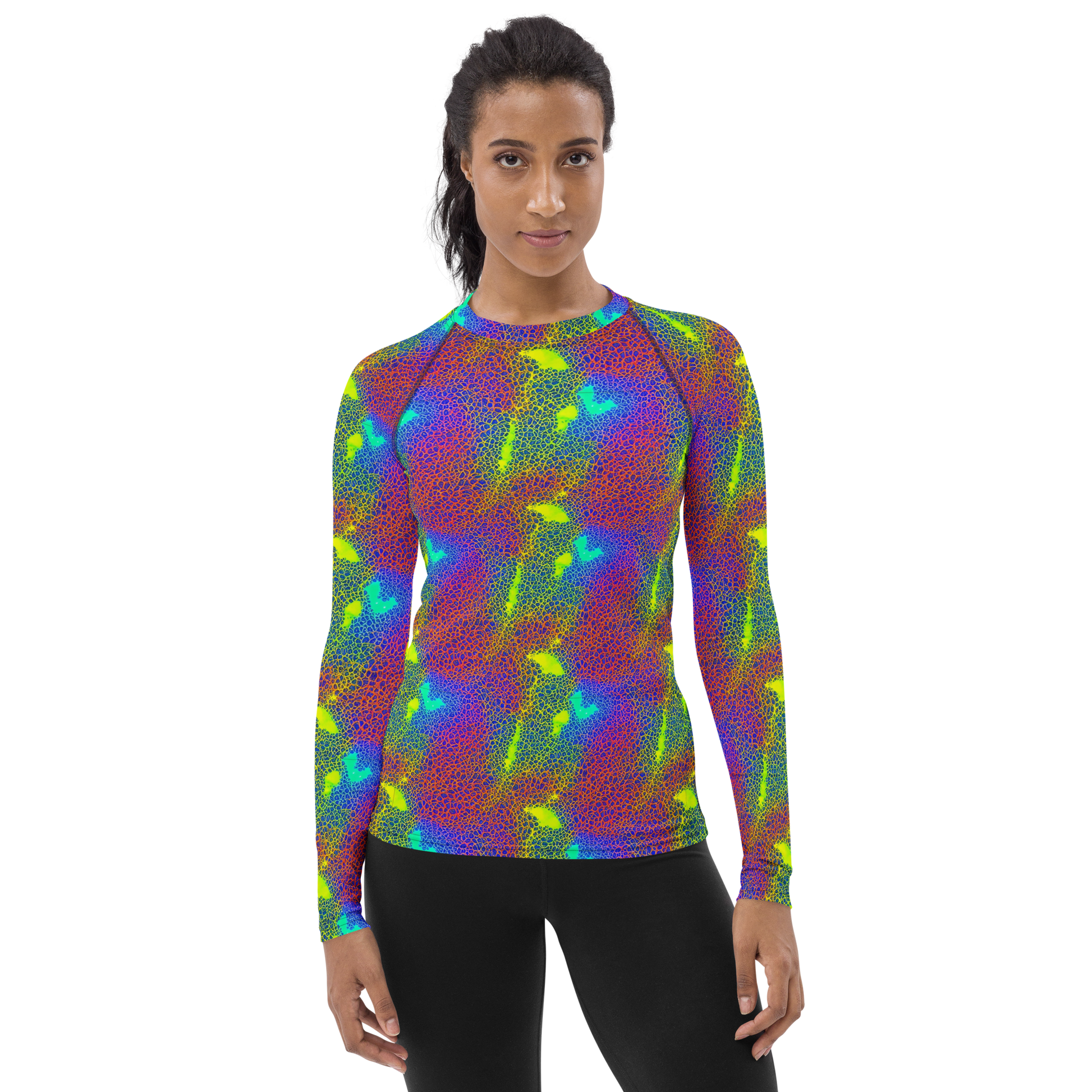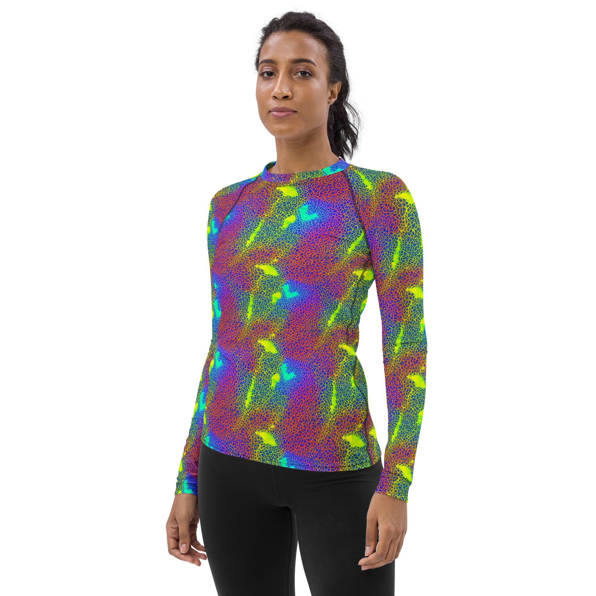 Make waves in our long-sleeve Women's Rash Guard, featuring a dazzling "Prismatic Web" design! Neon blues, yellows, and greens swirl over a deep red-orange backdrop, creating an electrifying look that's perfect for those who dare to stand out. This rash guard is not just about style—it's a celebration of life, energy, and bold expression, ideal for vibrant music festivals, lively summer events, or any occasion that calls for a splash of color and confidence.
